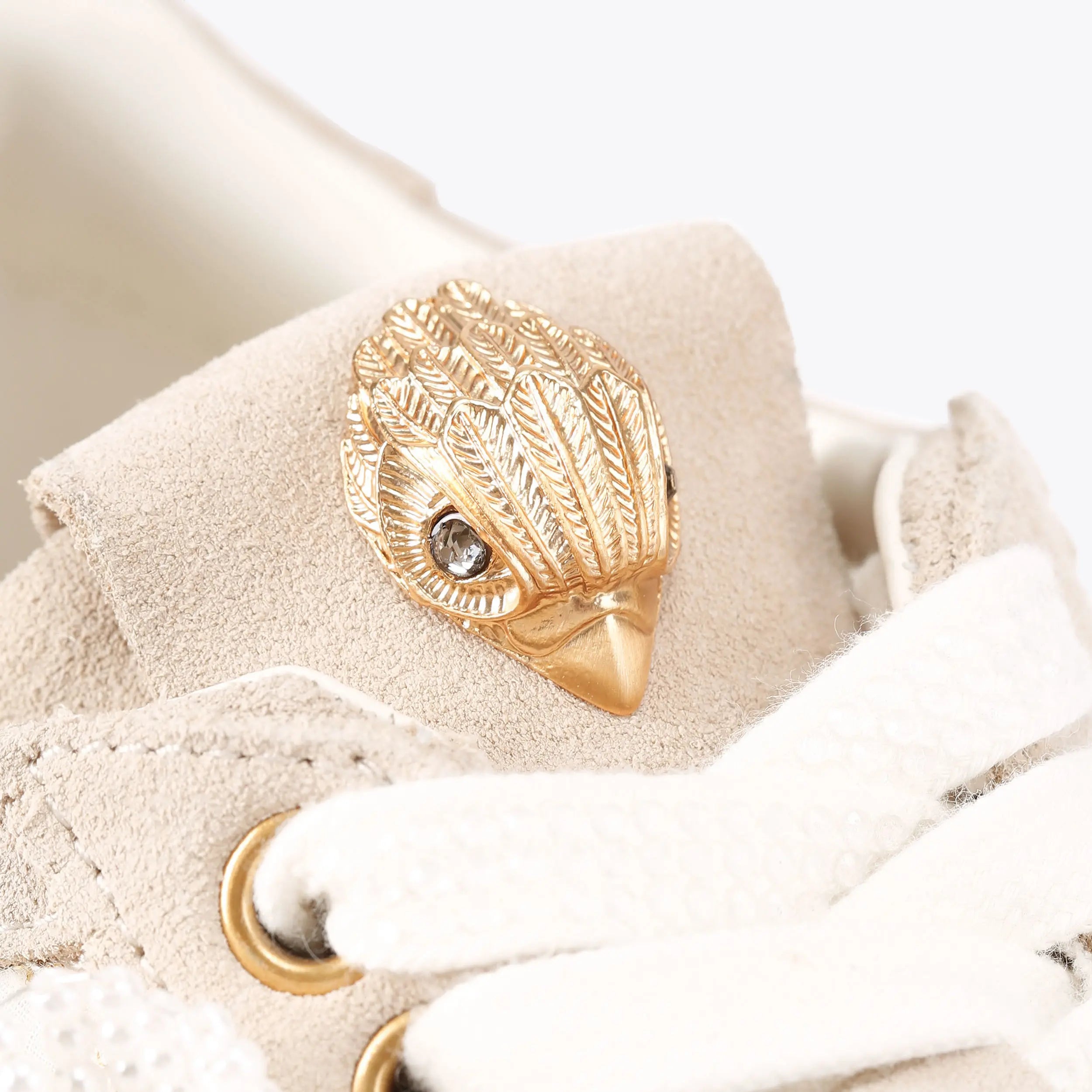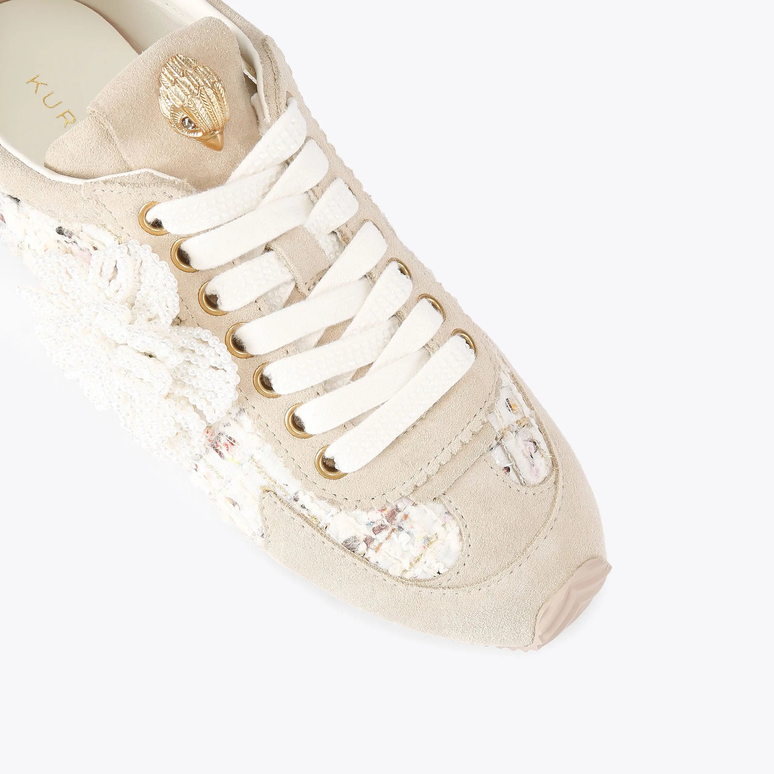 This Islington Sneaker is crafted from a statement tweed fabric which is embellished with a large pearl flower. The front is laced up with bone fabric laces embellished with clear crystals. There is a gold eagle head with crystals sat on the tongue.