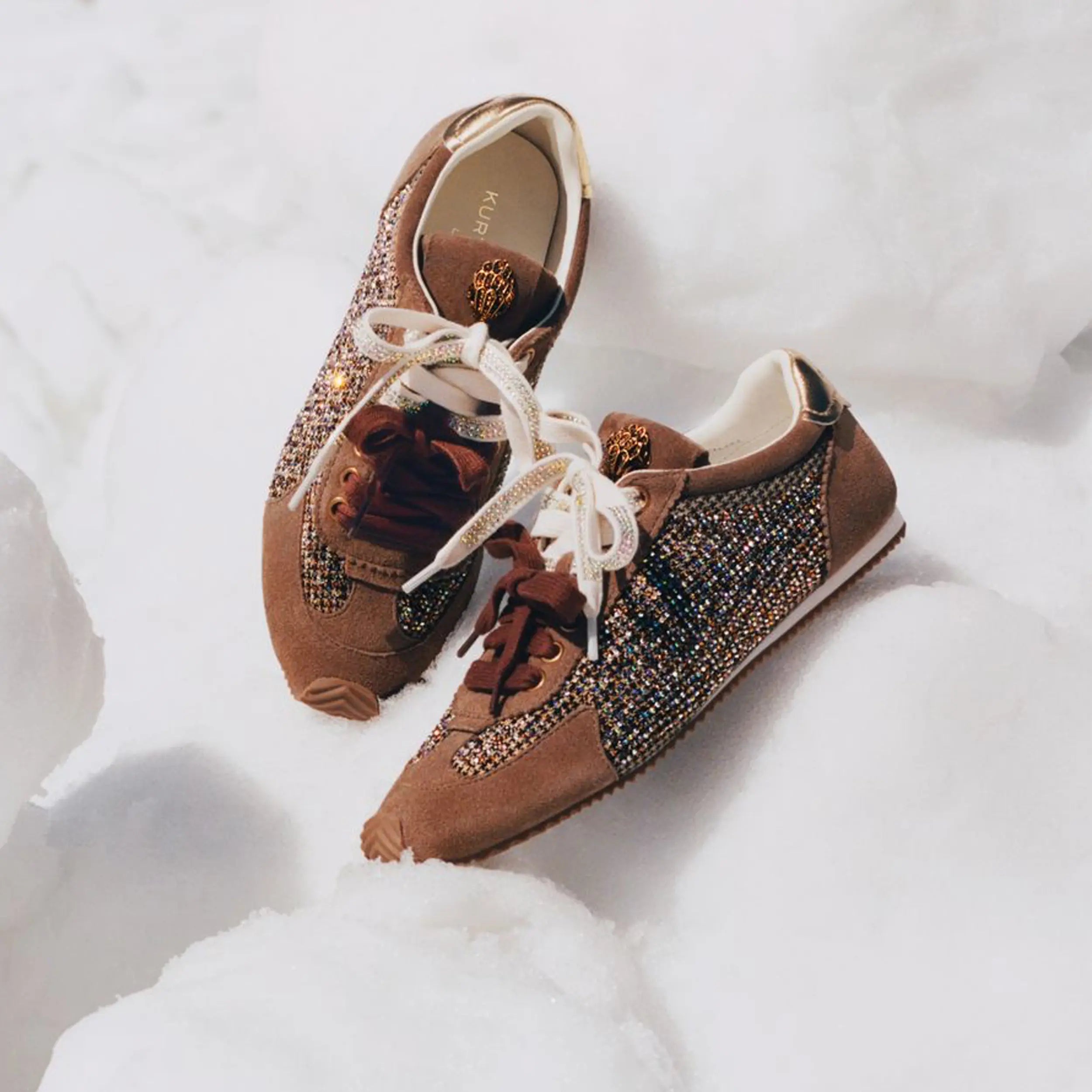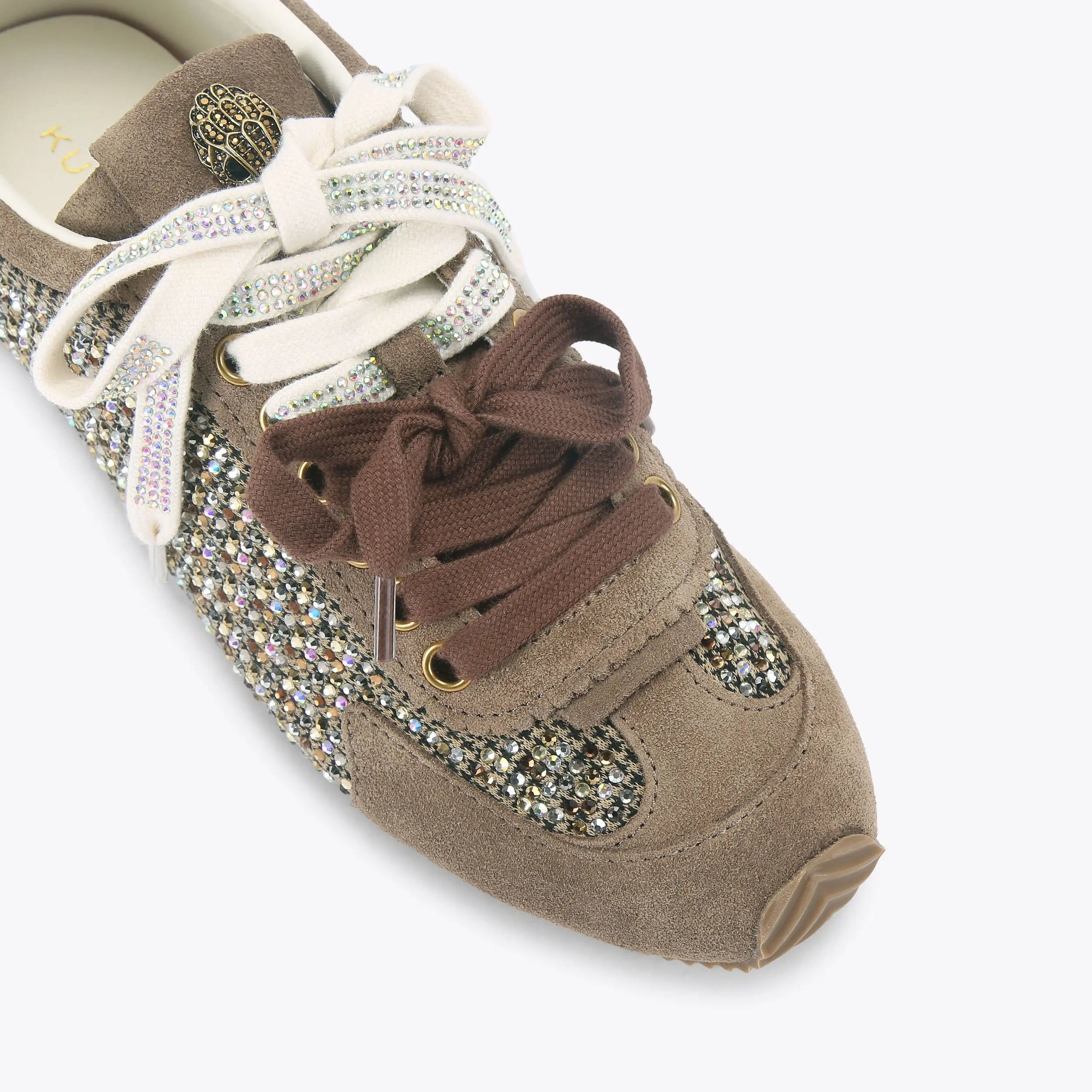 This Islington Sneaker is crafted in an embellished grey upper. The front is laced up with crystals on the laces in a multi-lace detail. There is an antiqued brass eagle head with crystals sat on the tongue.