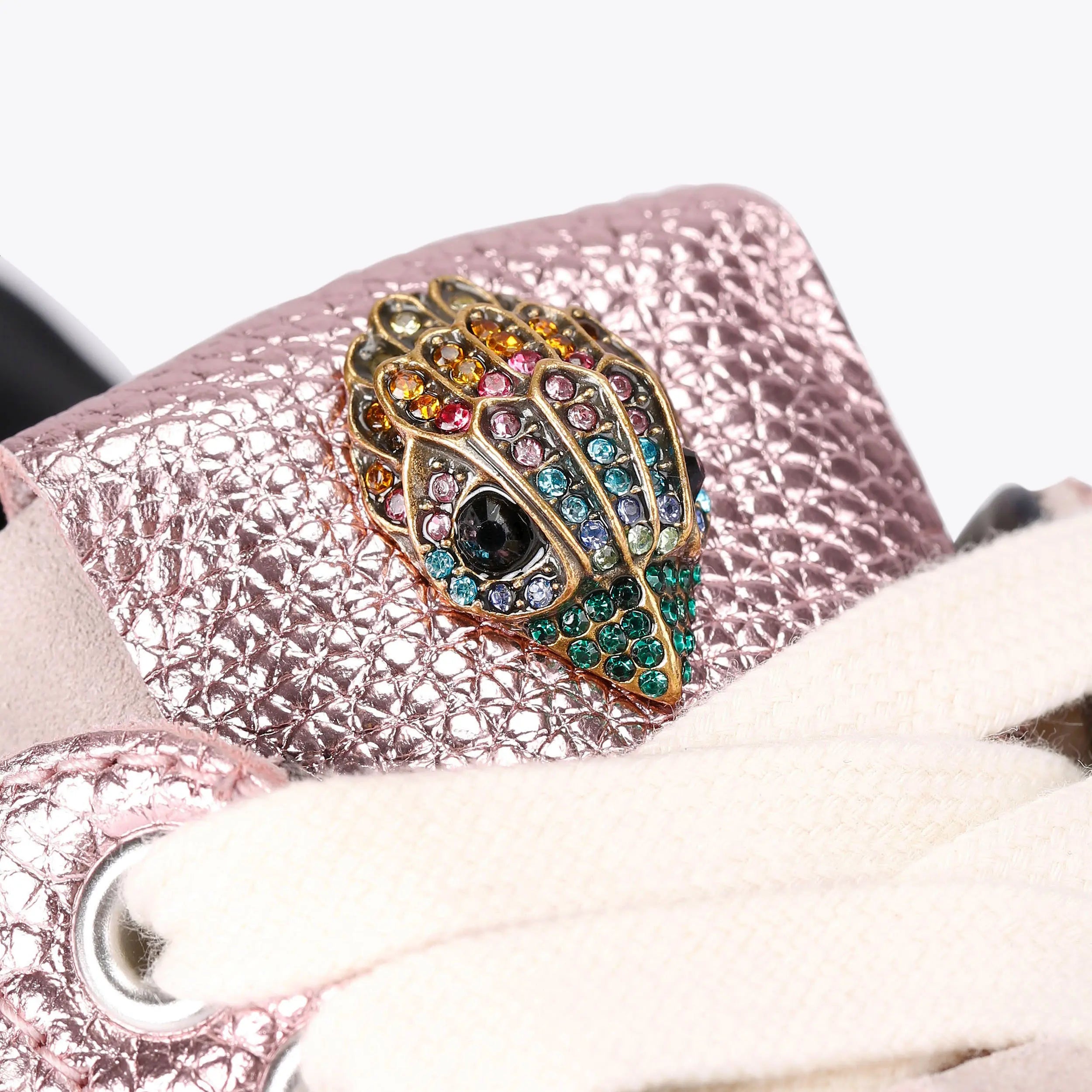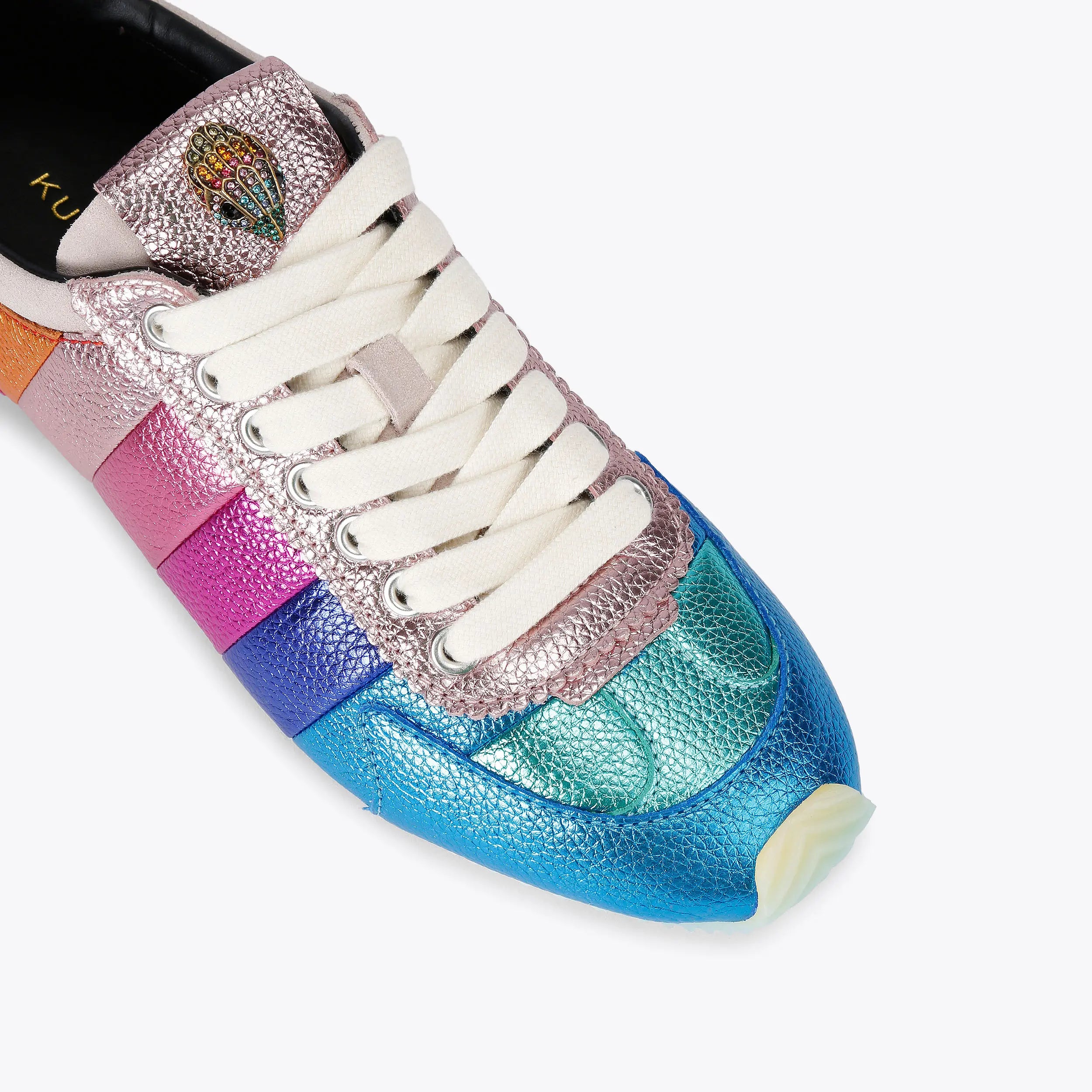 This Islington Sneaker is crafted from a striped pebble grain leather in rainbow tones. There is an antiqued brass eagle head with rainbow crystals sat on the tongue.