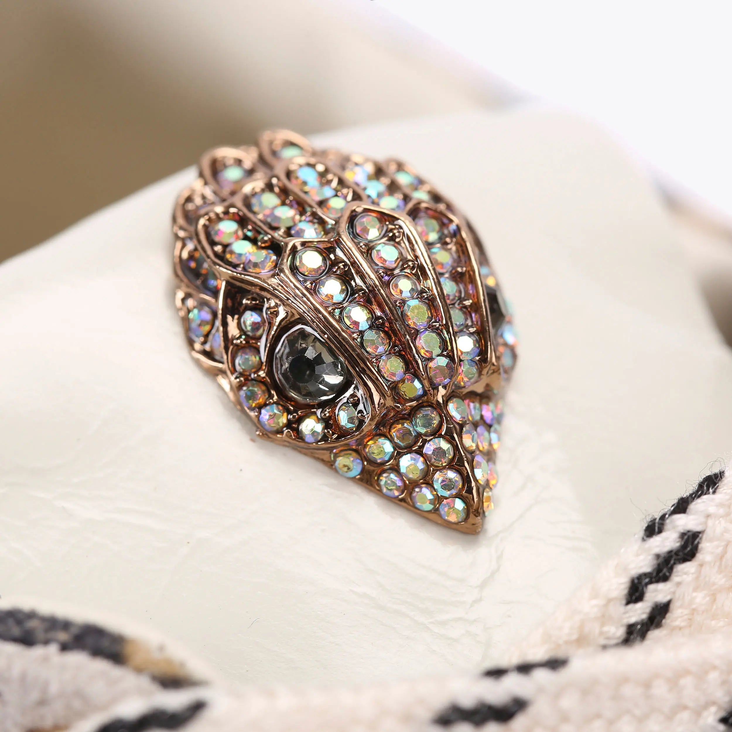 This Islington Sneaker is crafted from a peach suede with leopard printed panels across the toe and heels. The front is laced up with wide fabric laces. There is a gold eagle head with rainbow crystals sat on the tongue.