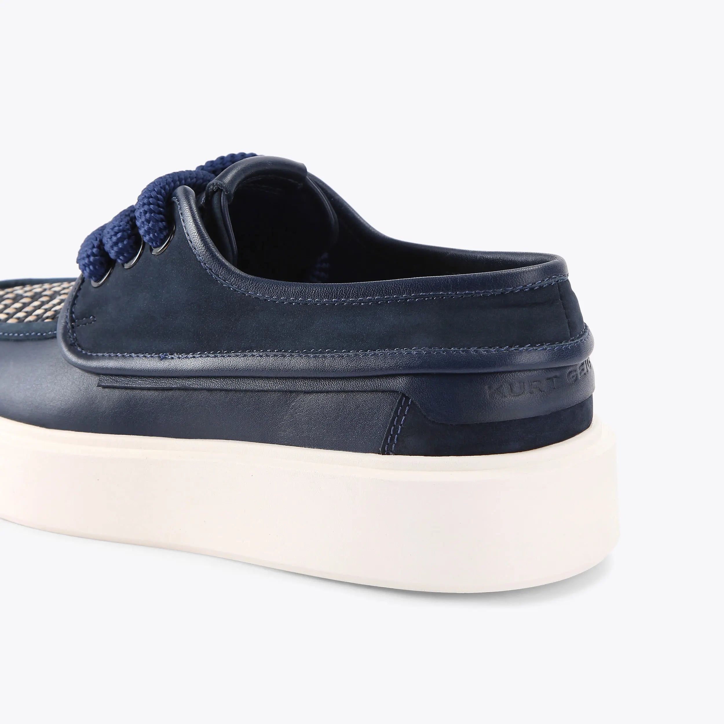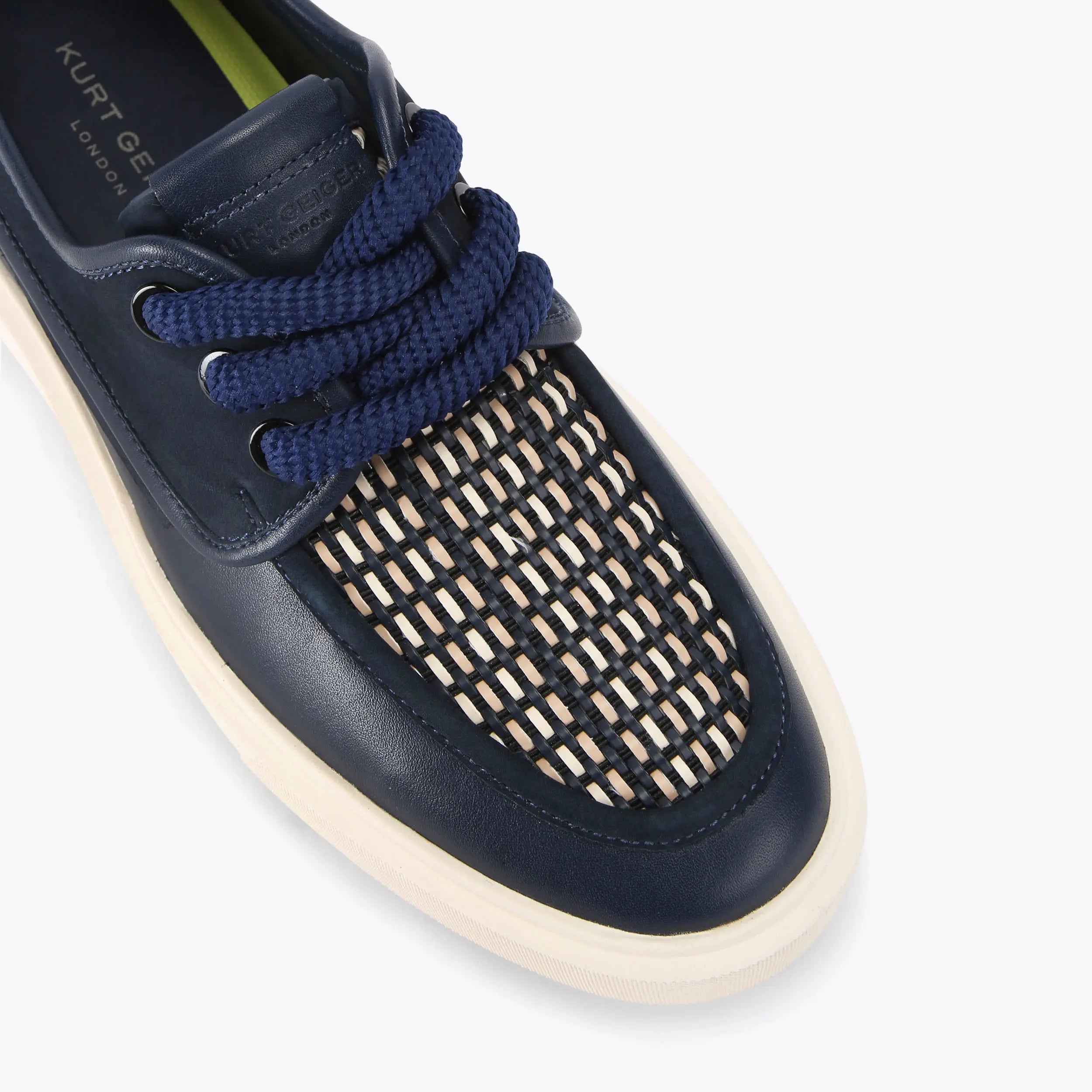 This Milbank Deck Shoe arrives with a navy leather upper. There is a weave effect across the toe and the laces are in a unique rope style.