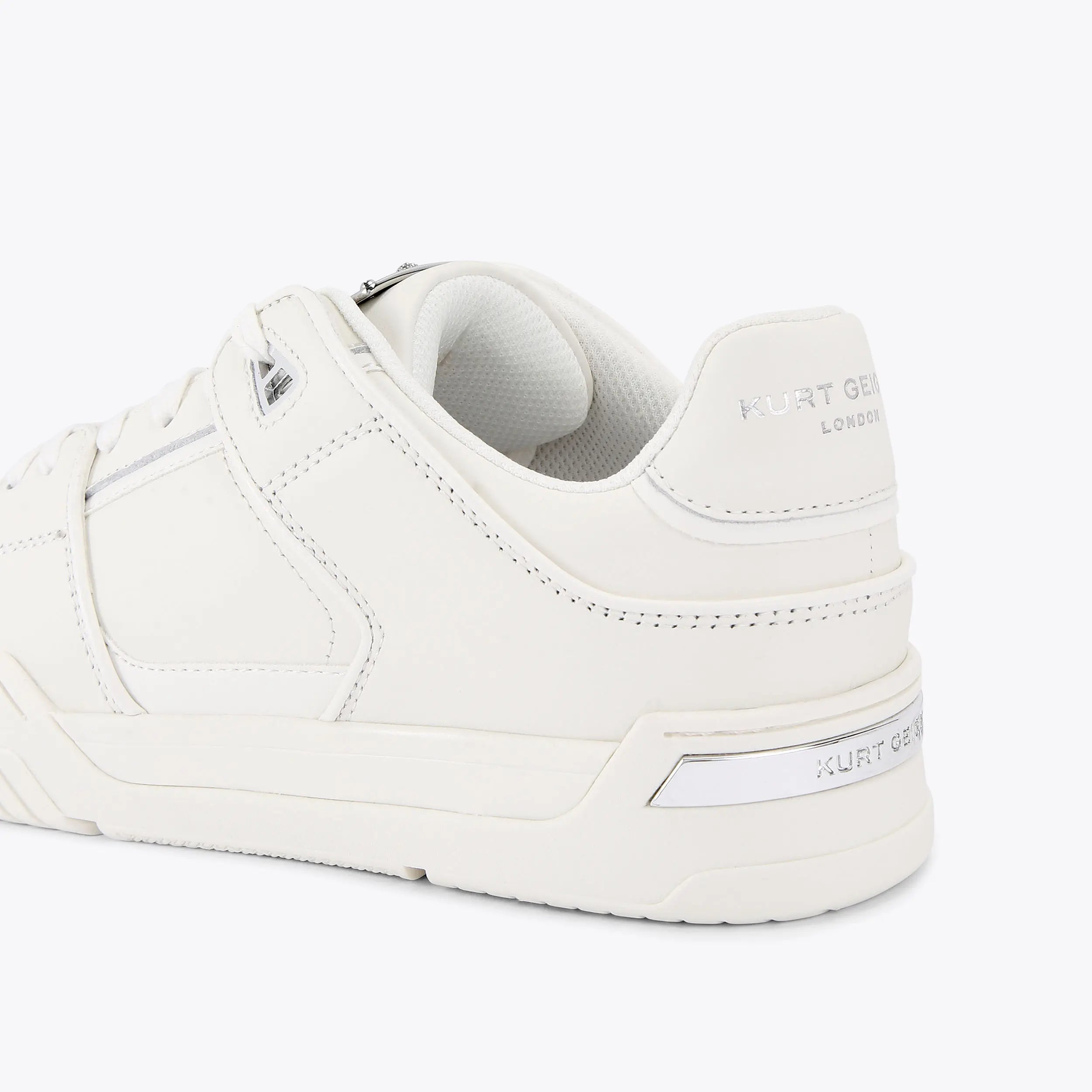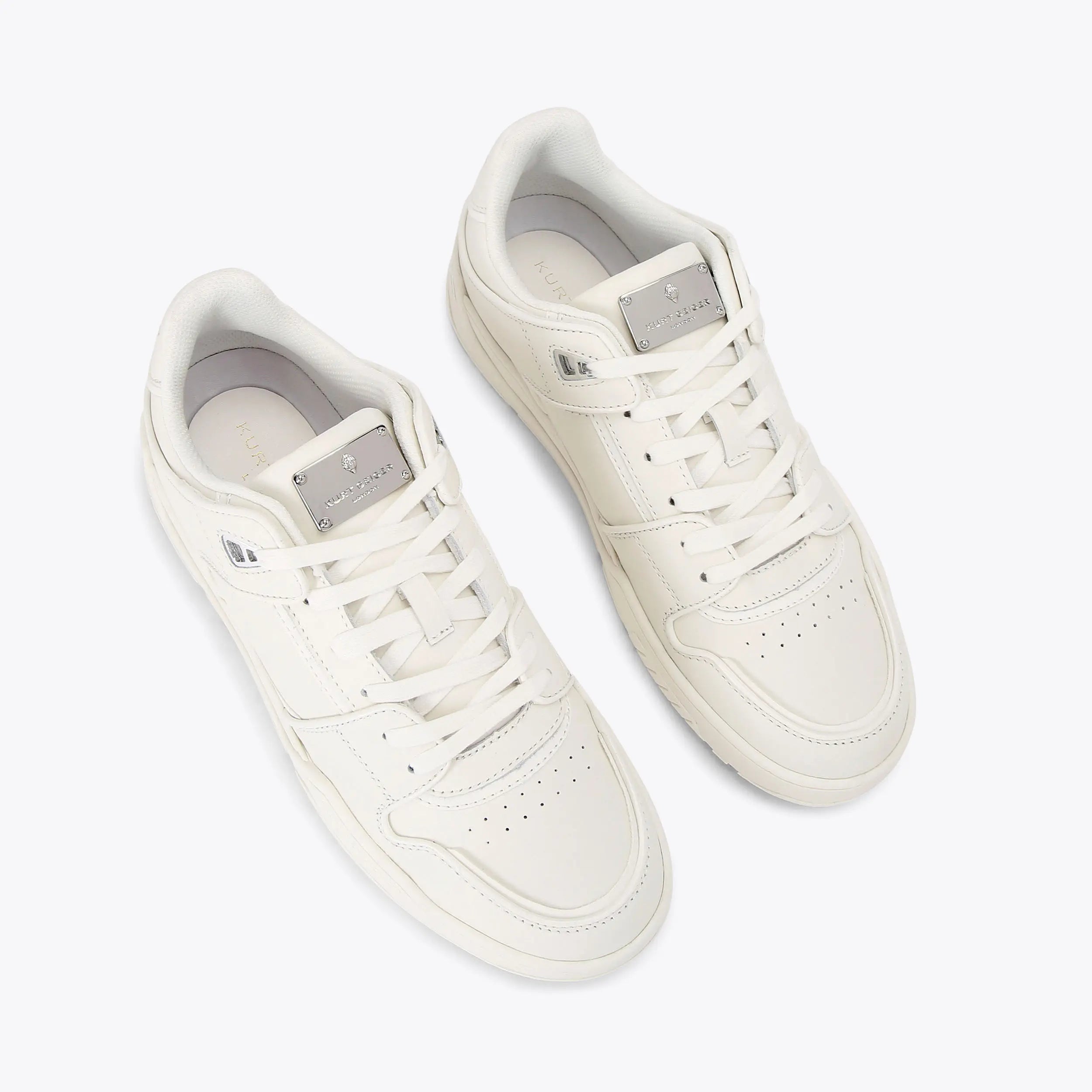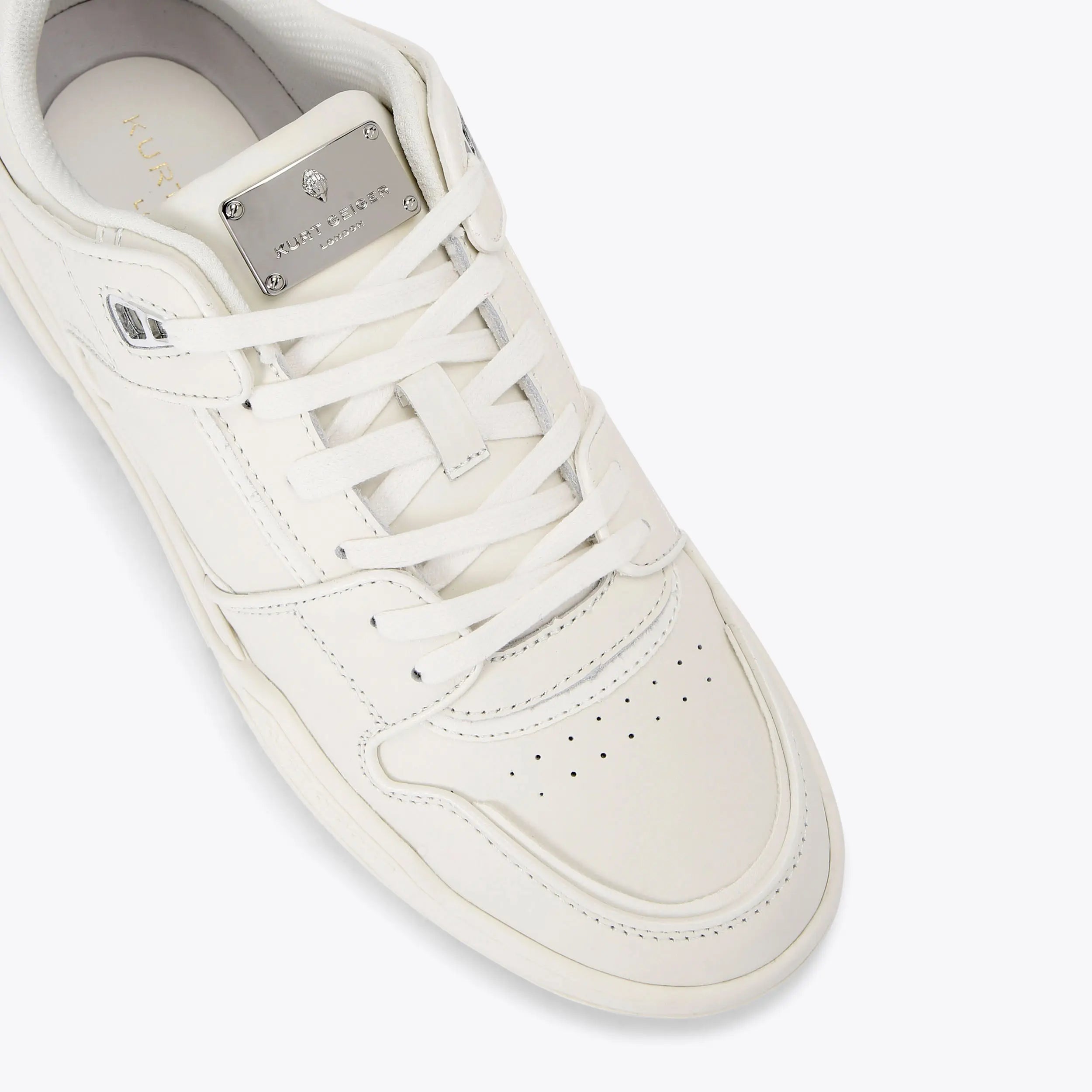 This Regan Plaque is a lace up leather sneaker in white. There is a silver branded plate on the tongue.