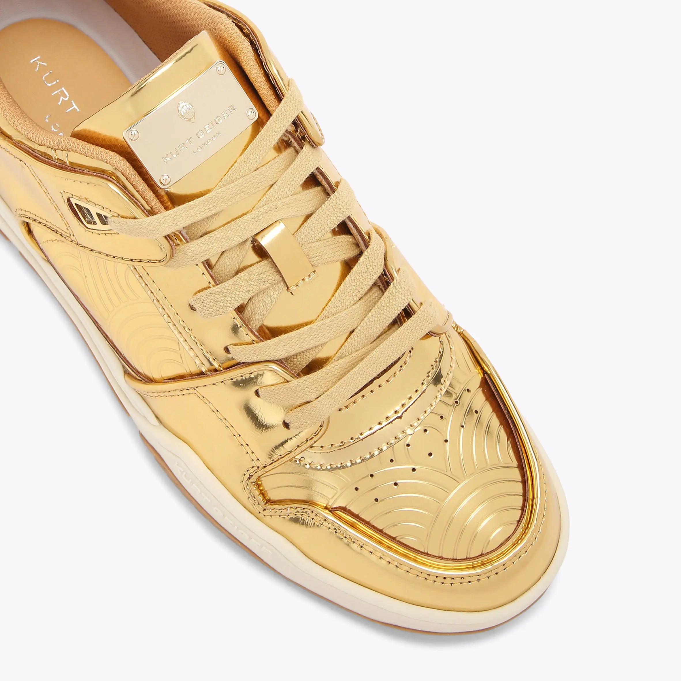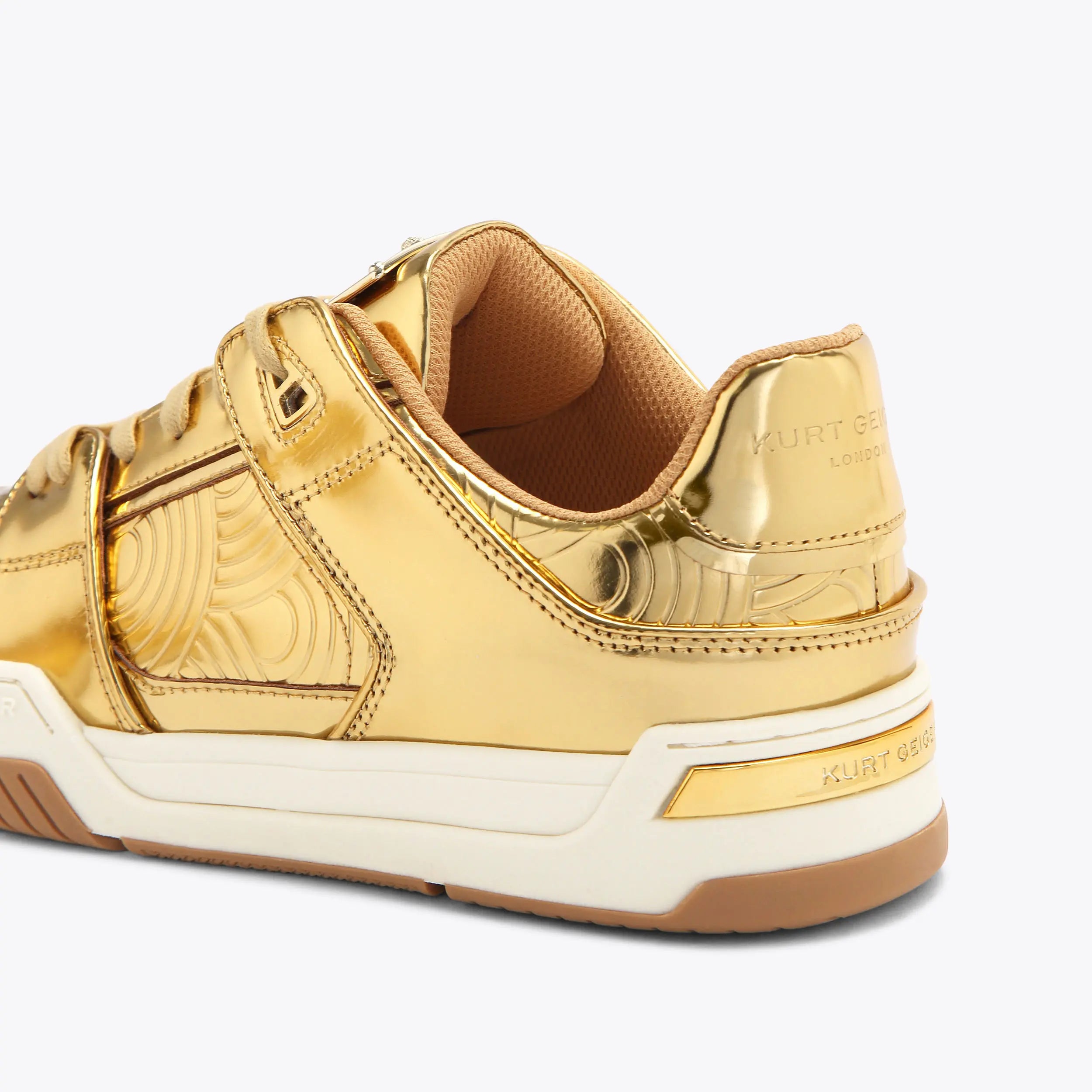 This Regan Plaque is a statement leather sneaker in shining gold. There is an embossed rainbow print across the shoe and a branded plaque on the tongue.