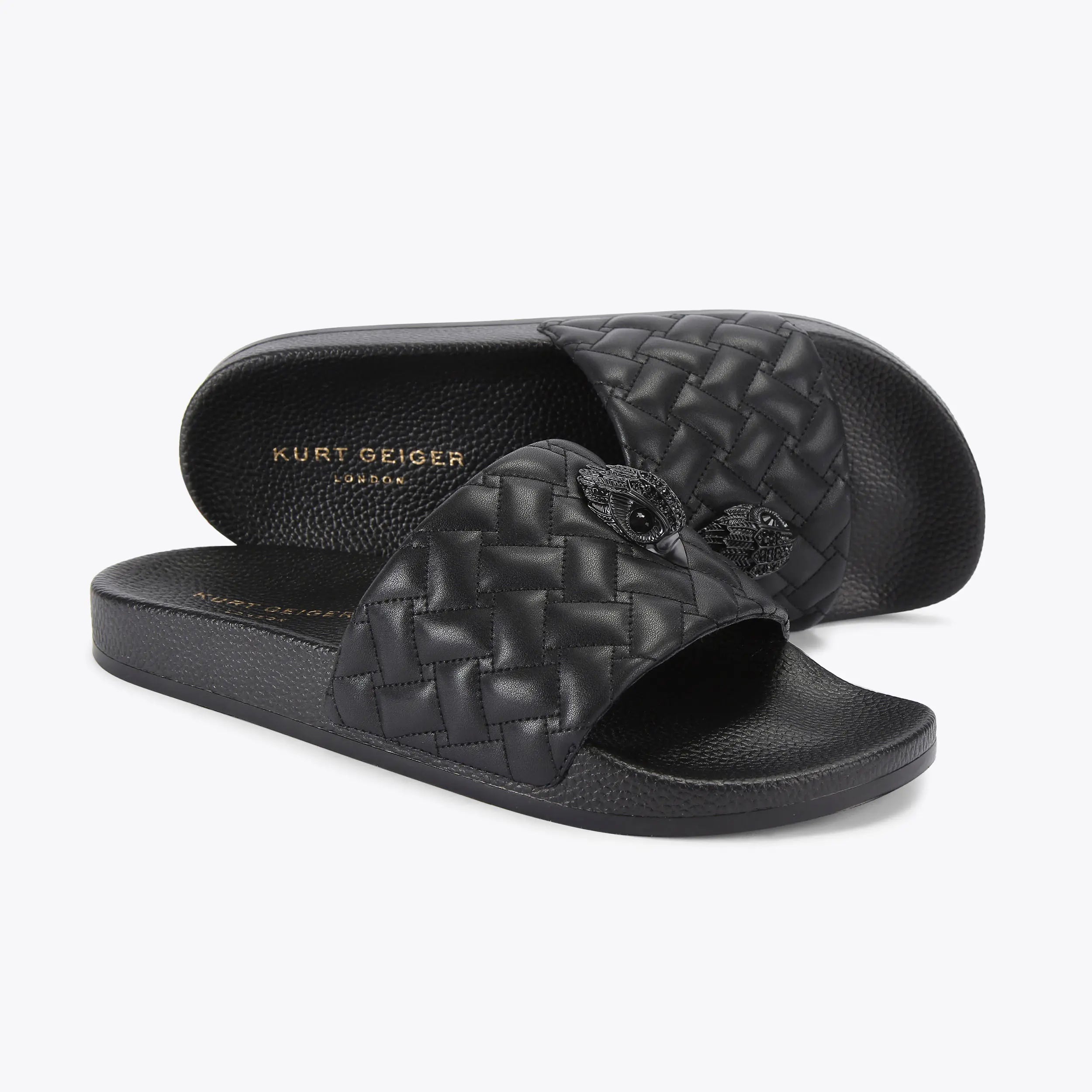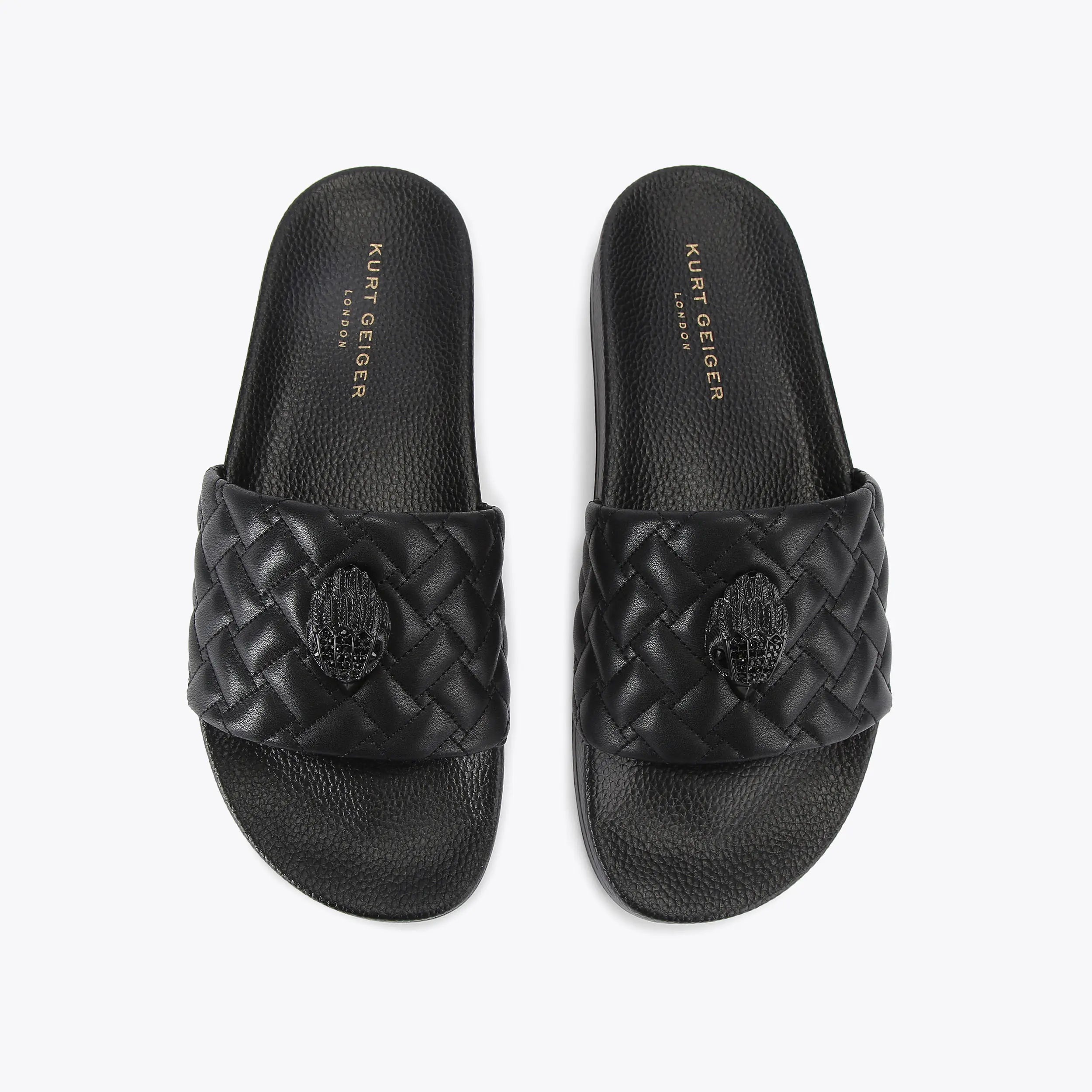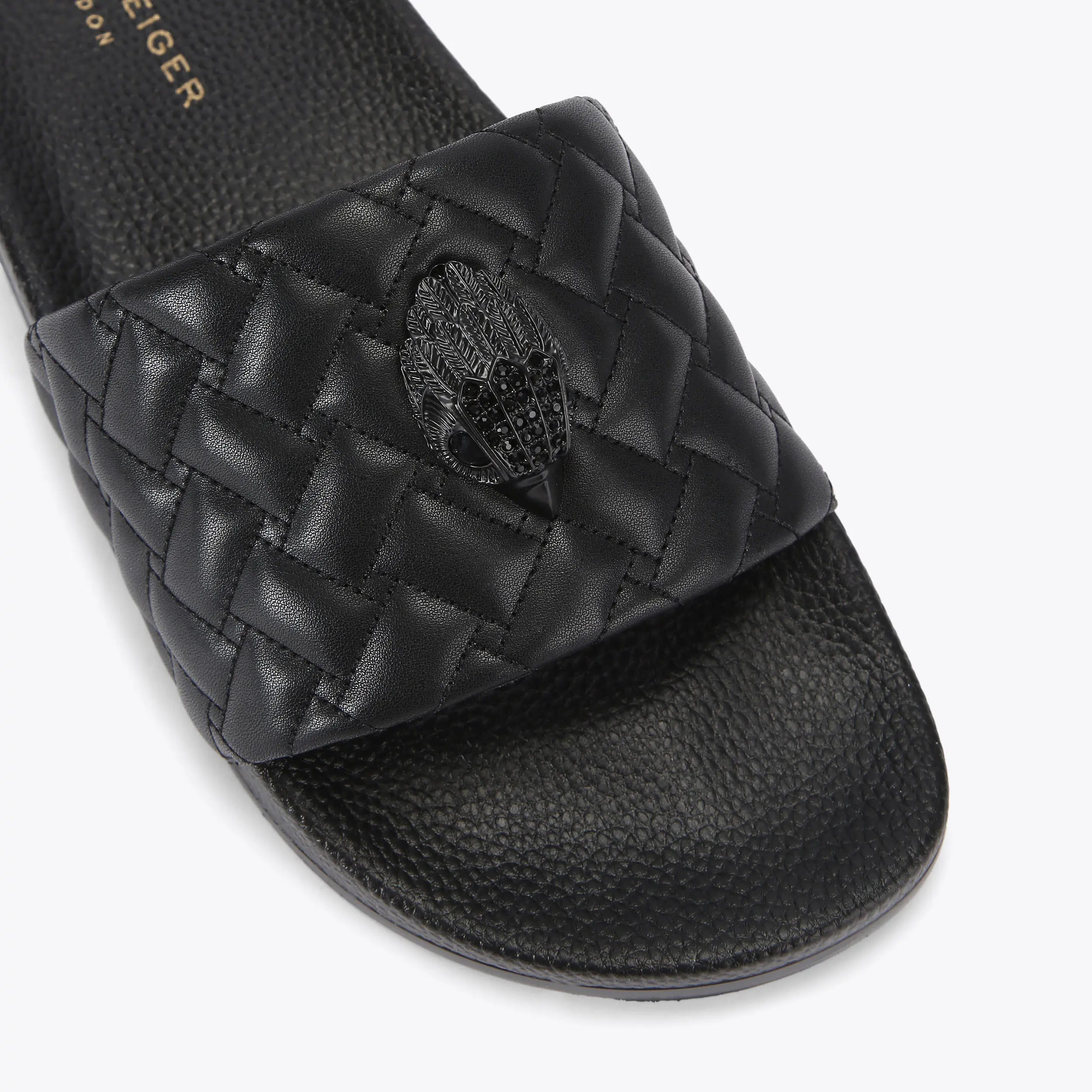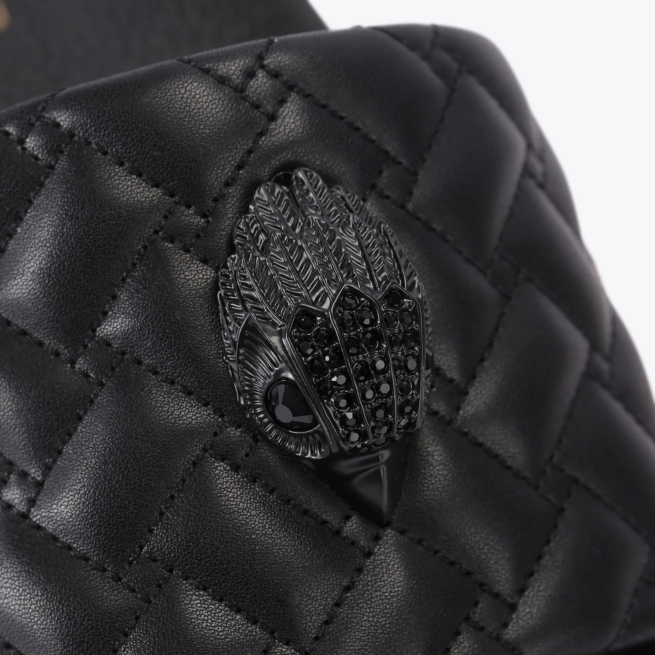 This Meena Eagle sandal arrives in black with overstitch quilting on the strap. There is also a black crystal eagle head sat on top of the strap.