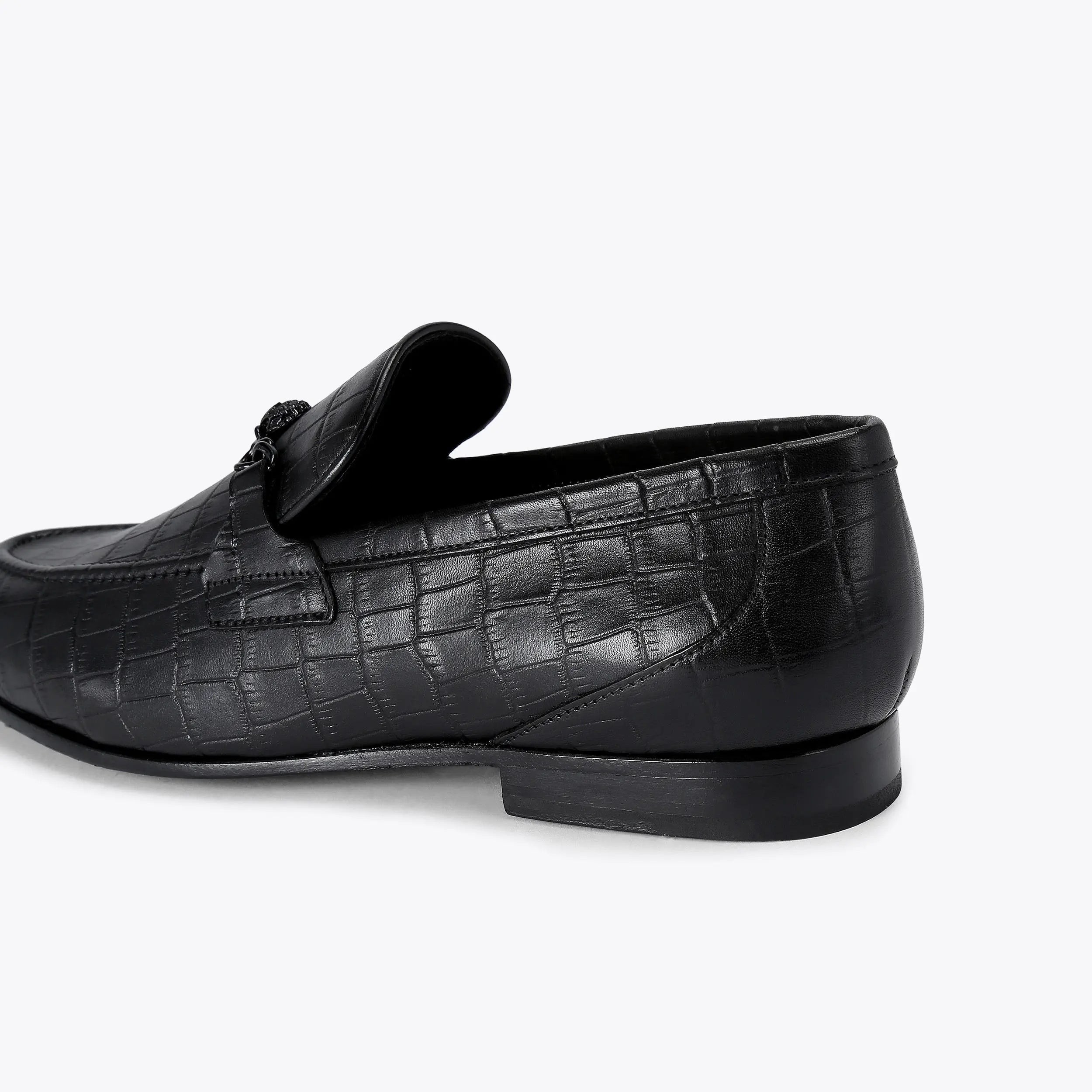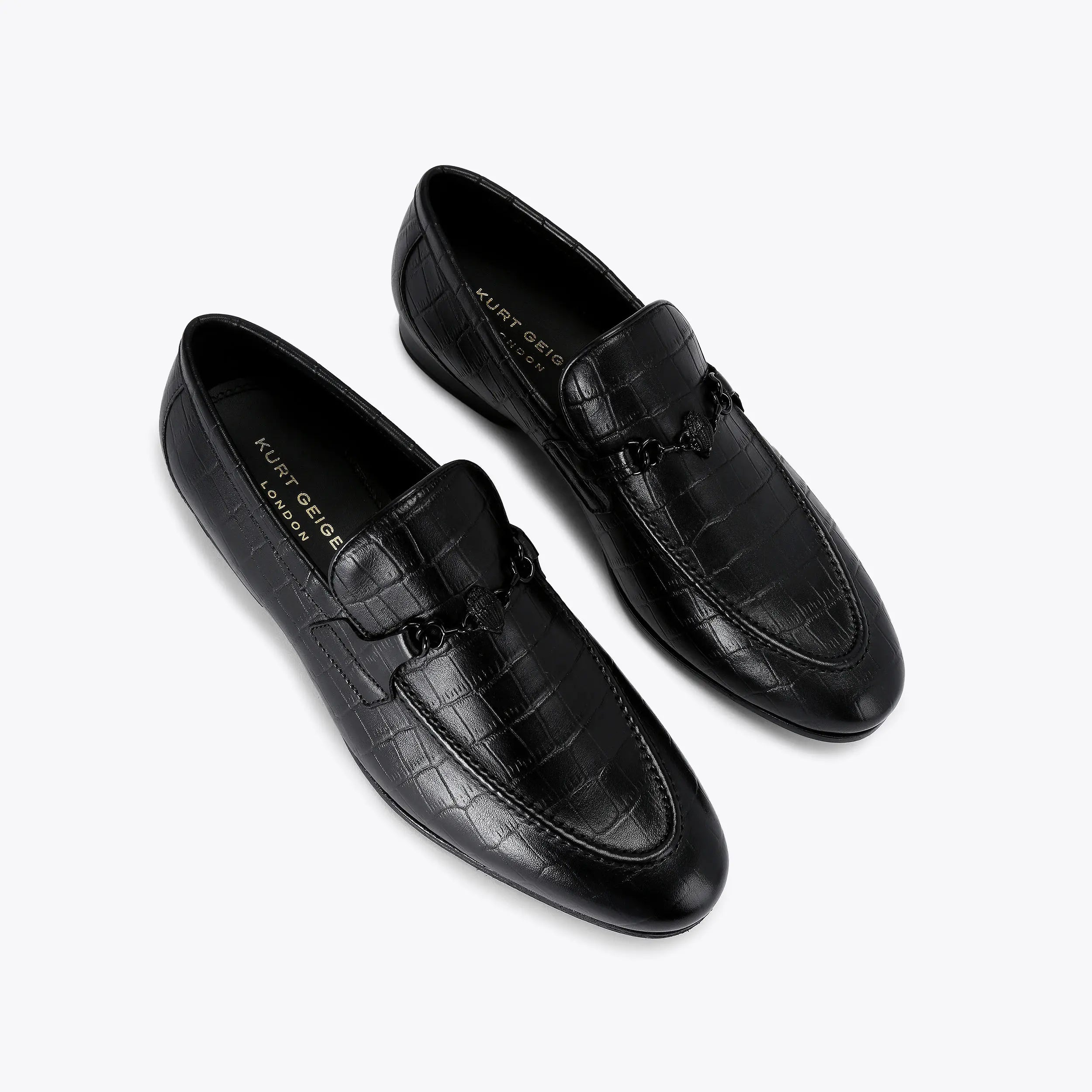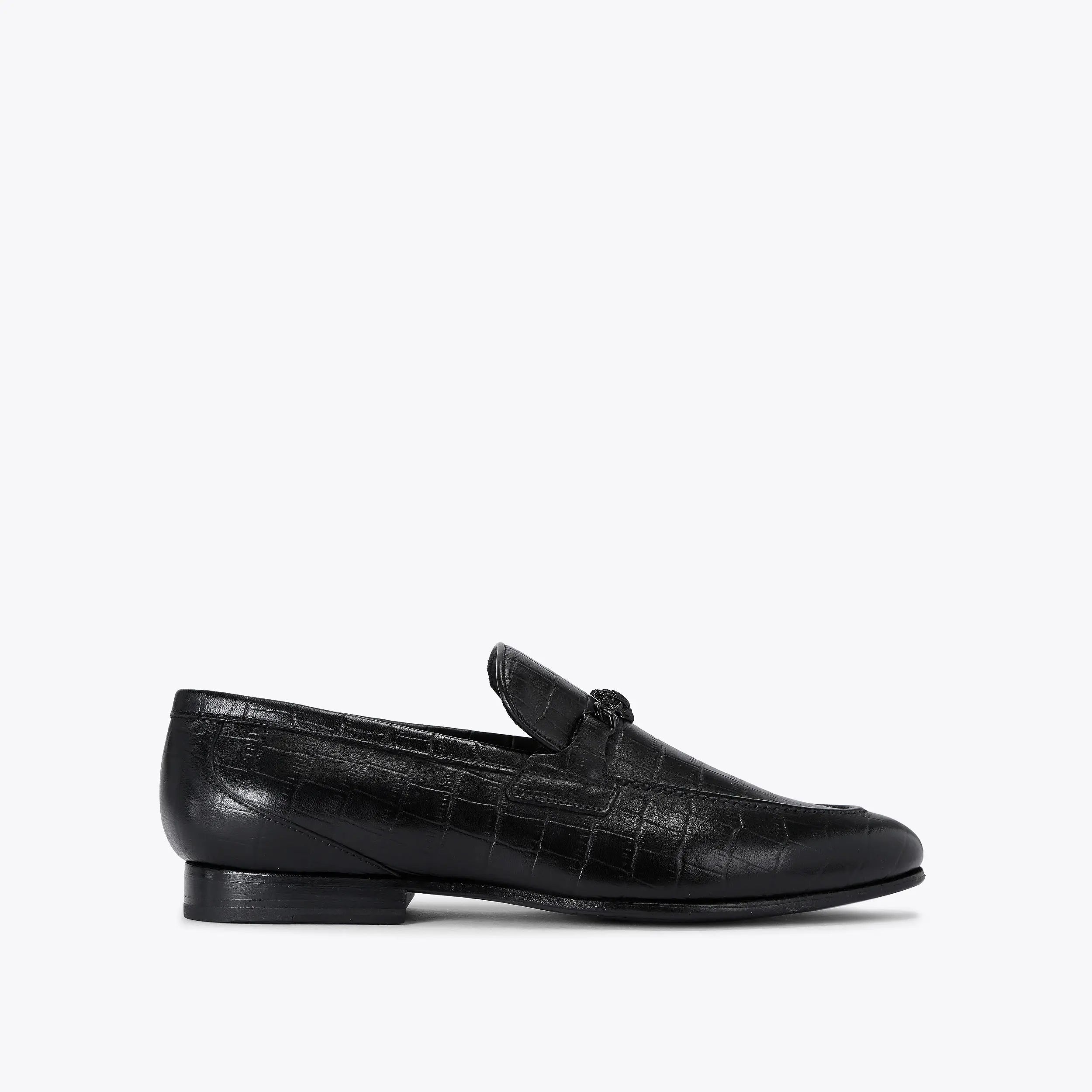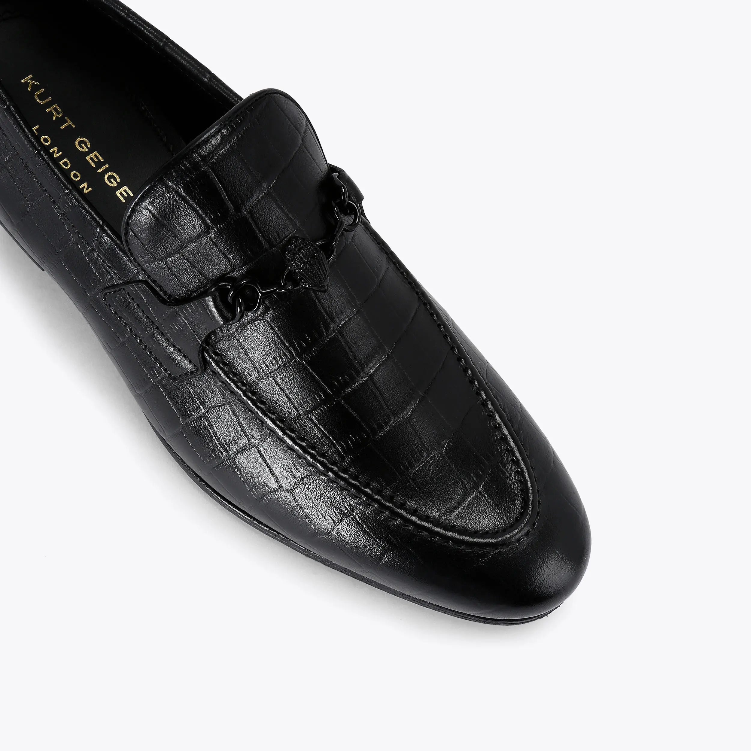 This Alton Croc is a slip-on loafer crafted from a croc embossed leather. There is a black eagle head chain across the vamp. Built on a custom designed KGL last for a classic formal look with a modern twist. These shoes can be re-soled to extend their lifespan even further.