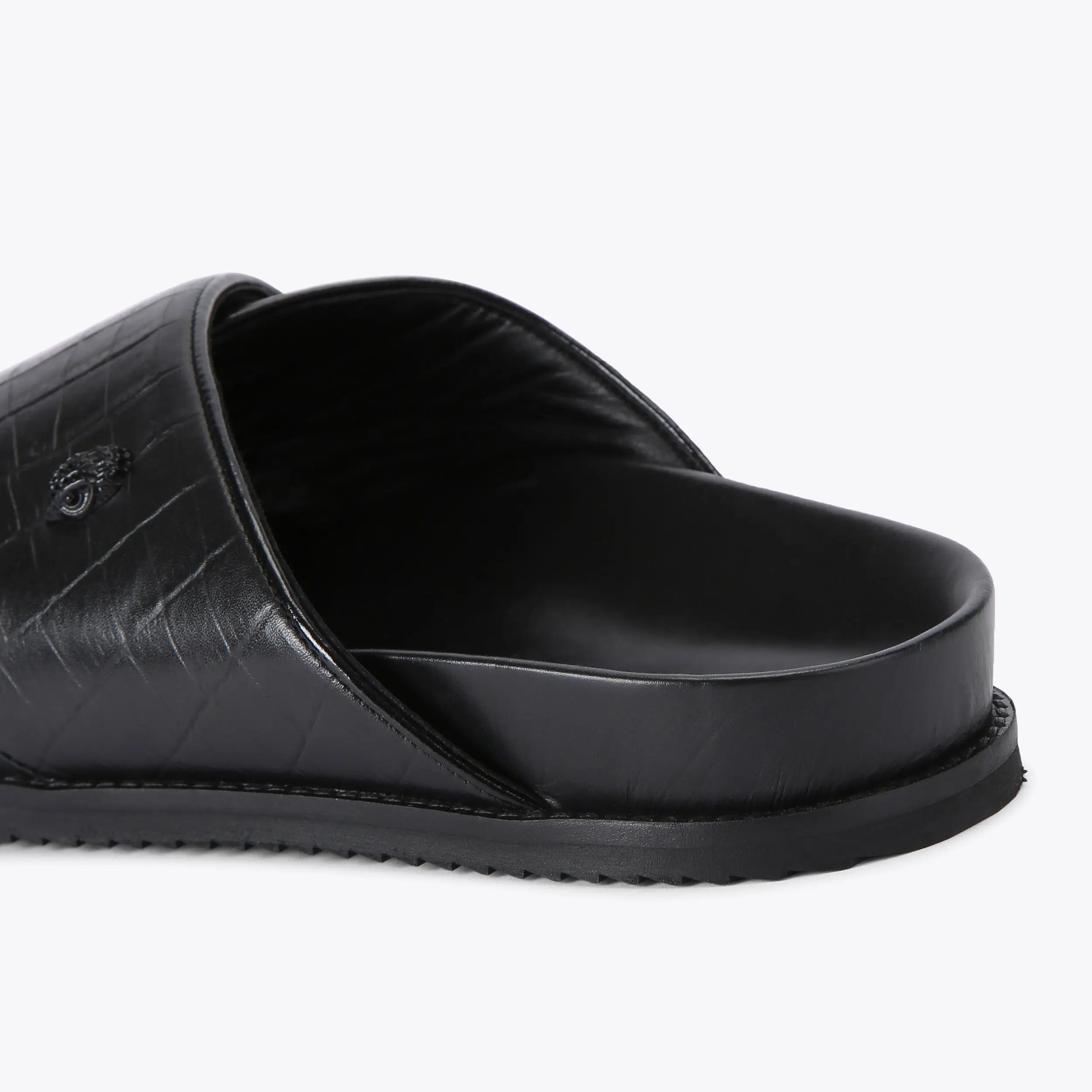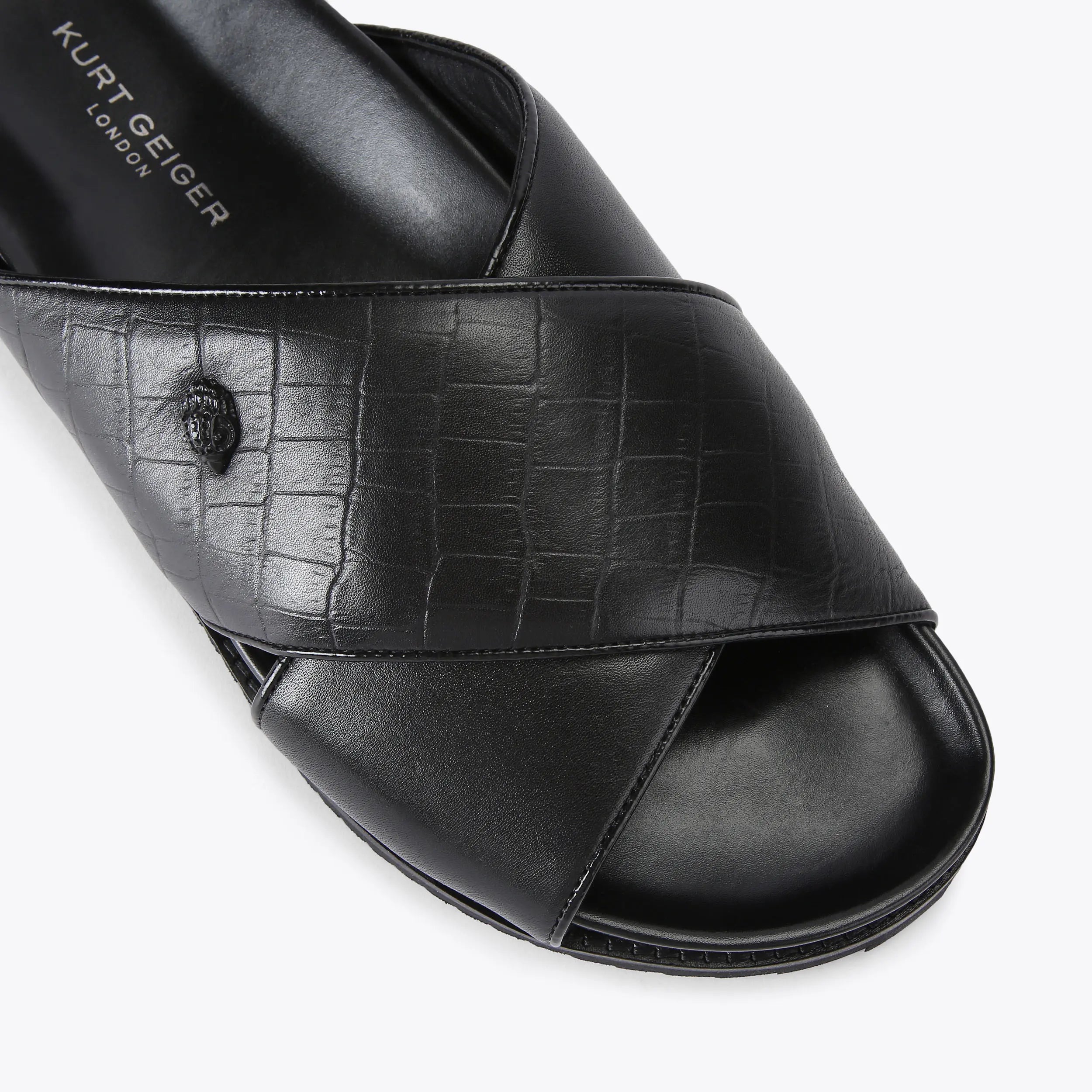 This Baron Sandal is crafted from black leather on the crossed straps with croc embossed leather. There is a black eagle head with crystals on the outer side on the straps.