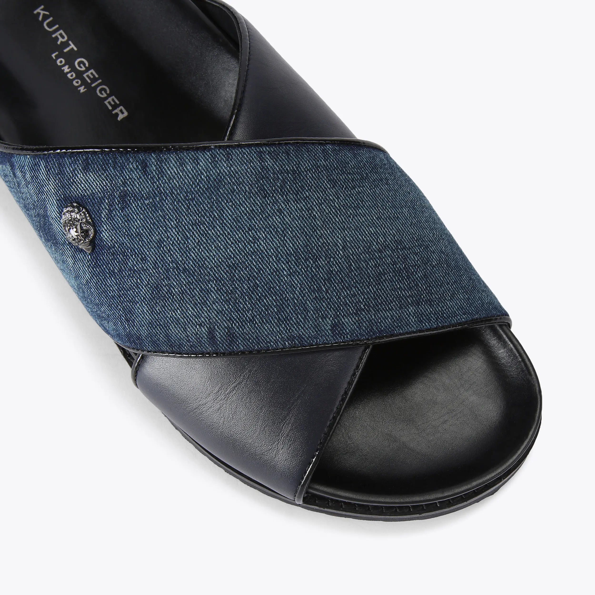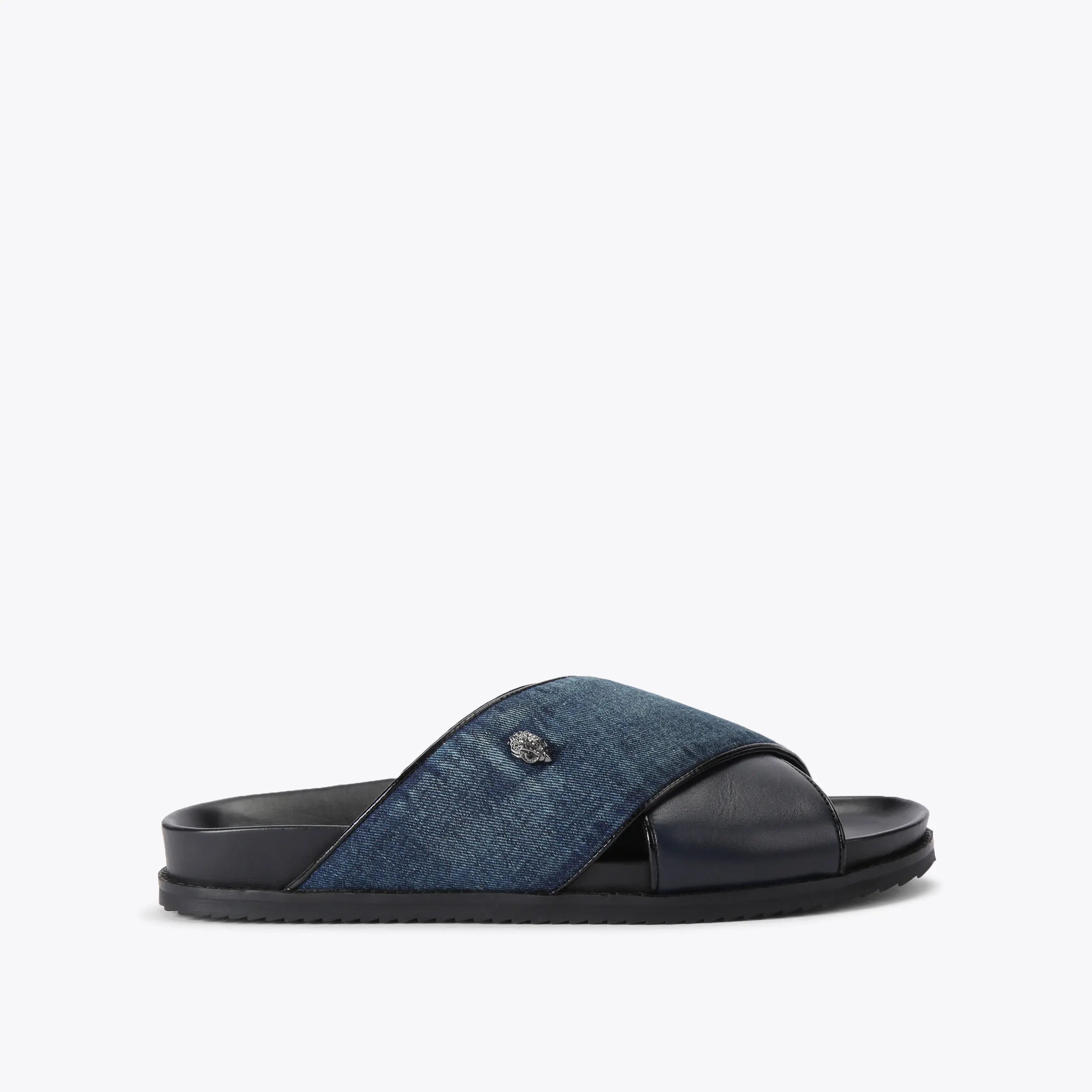 This Baron Sandal is crafted from a denim and leather on the crossed straps. There is a gunmetal eagle head with crystals on the outer side on the straps.
