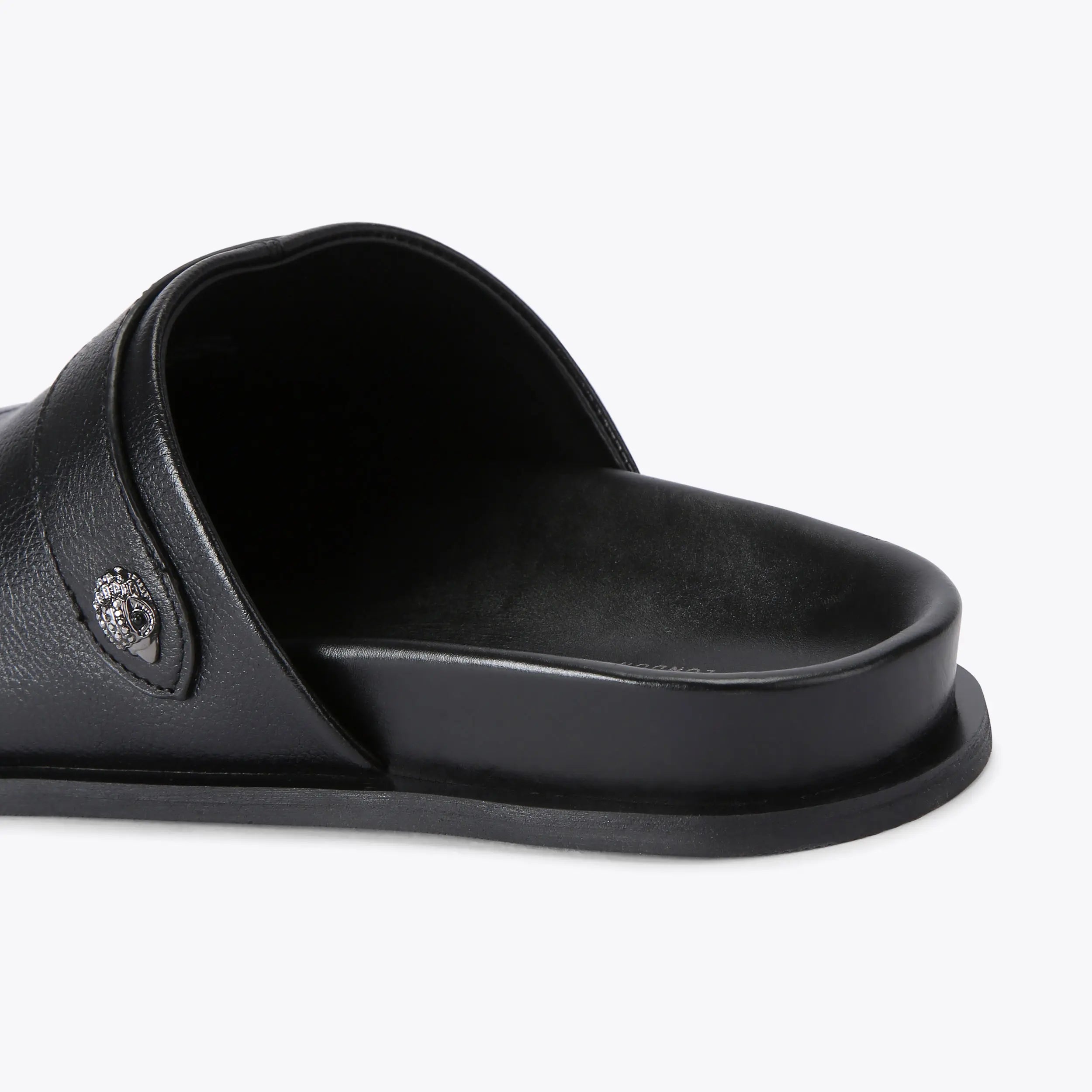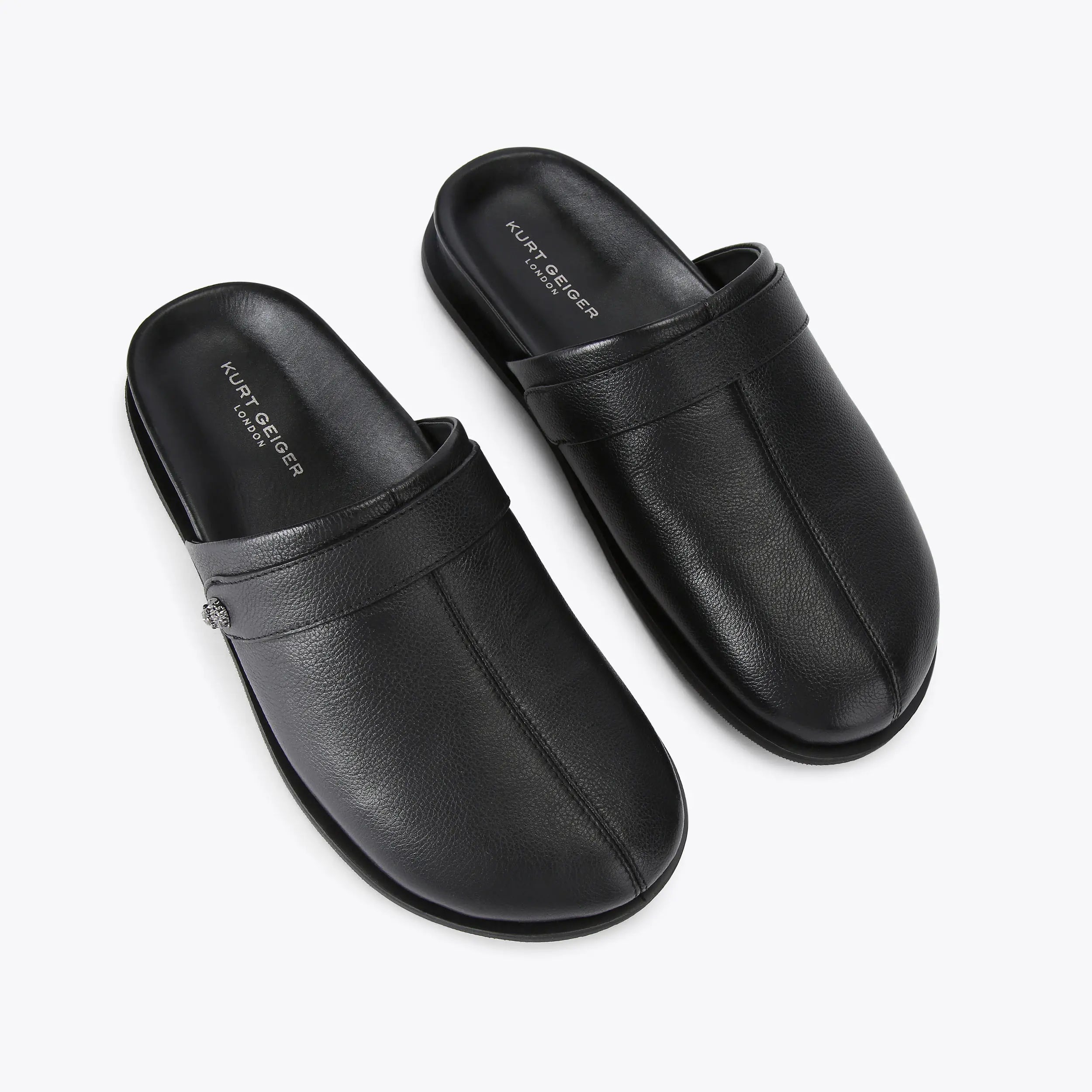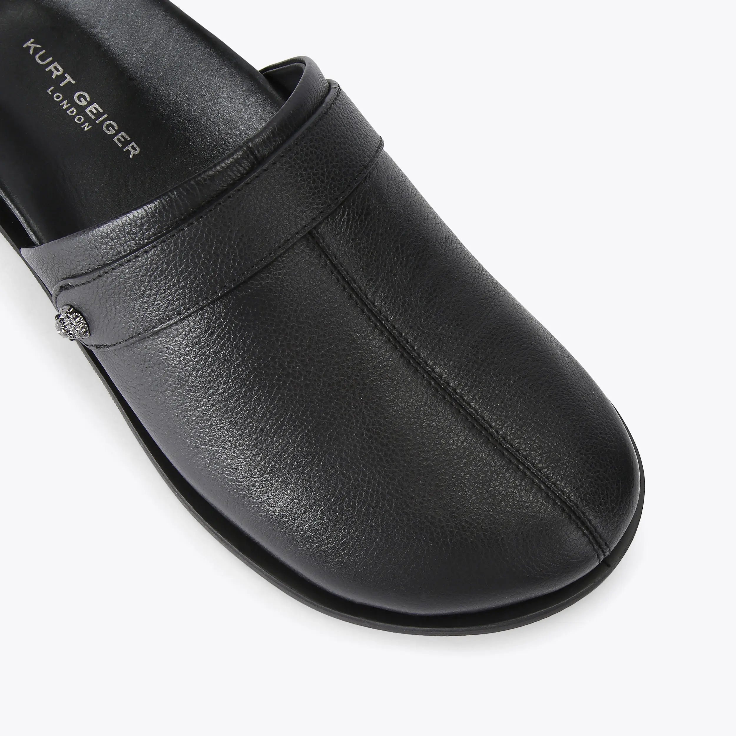 This Hatton Summer Mule is crafted from a black pebble grain leather. There is a small gunmetal eagle head on the outer side of the shoe.