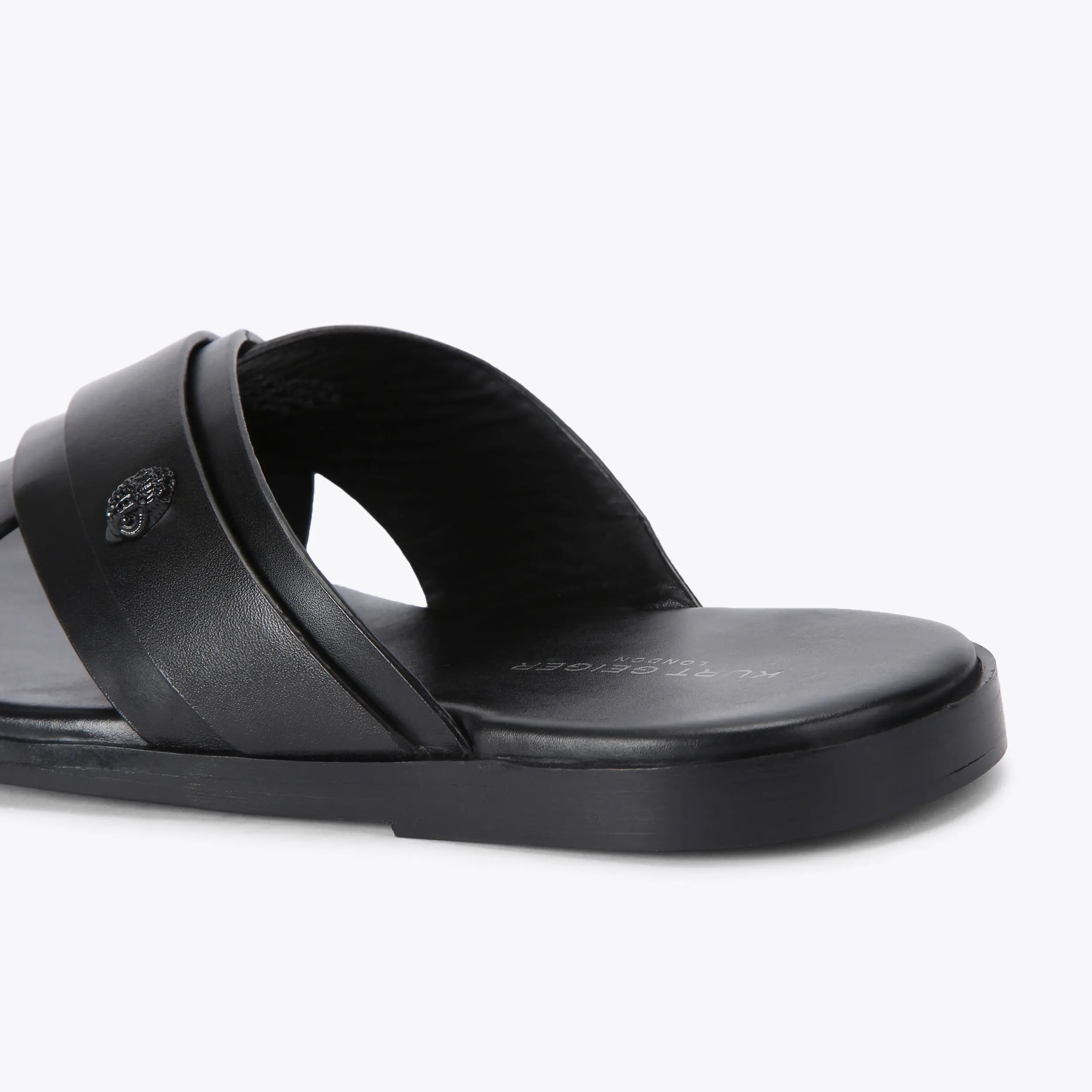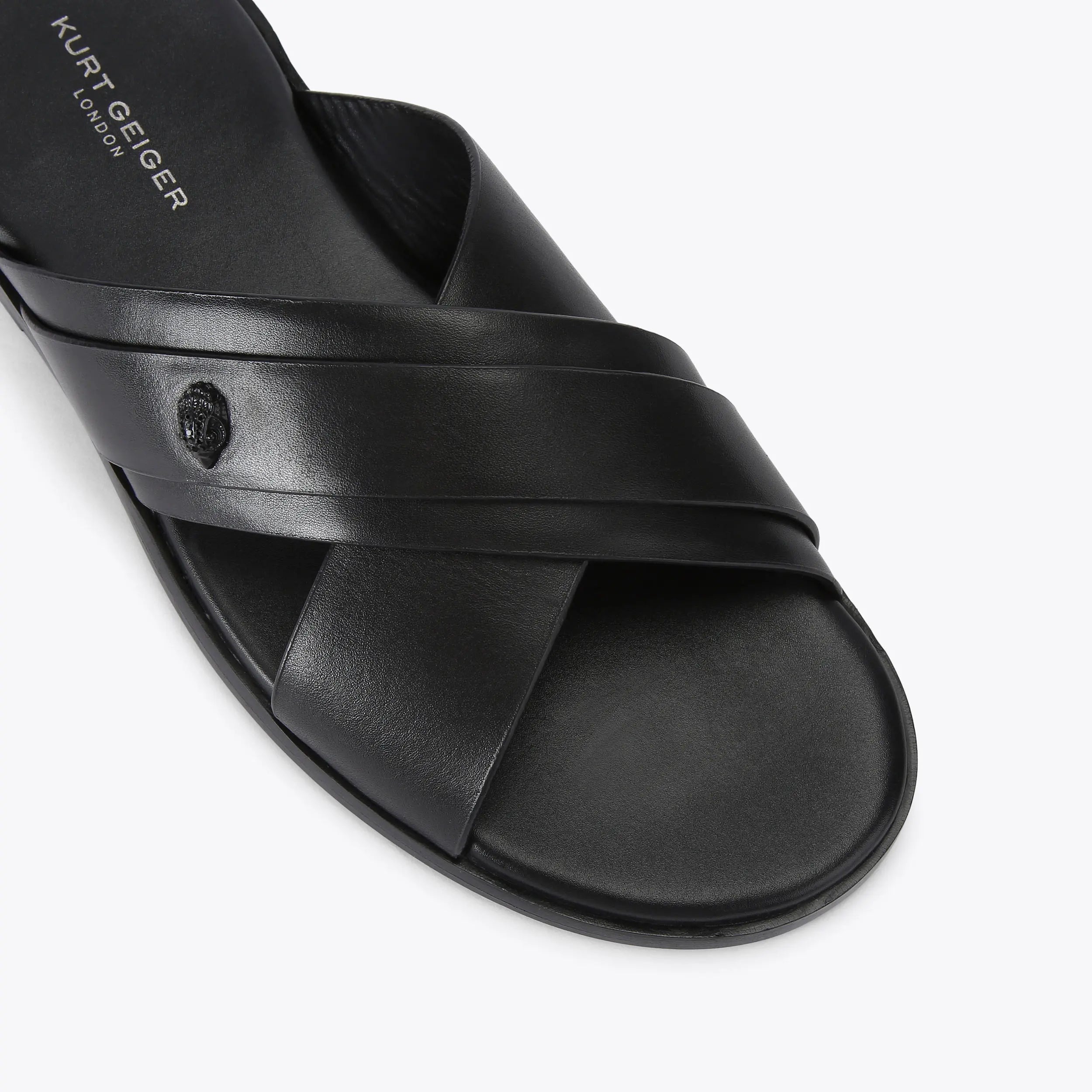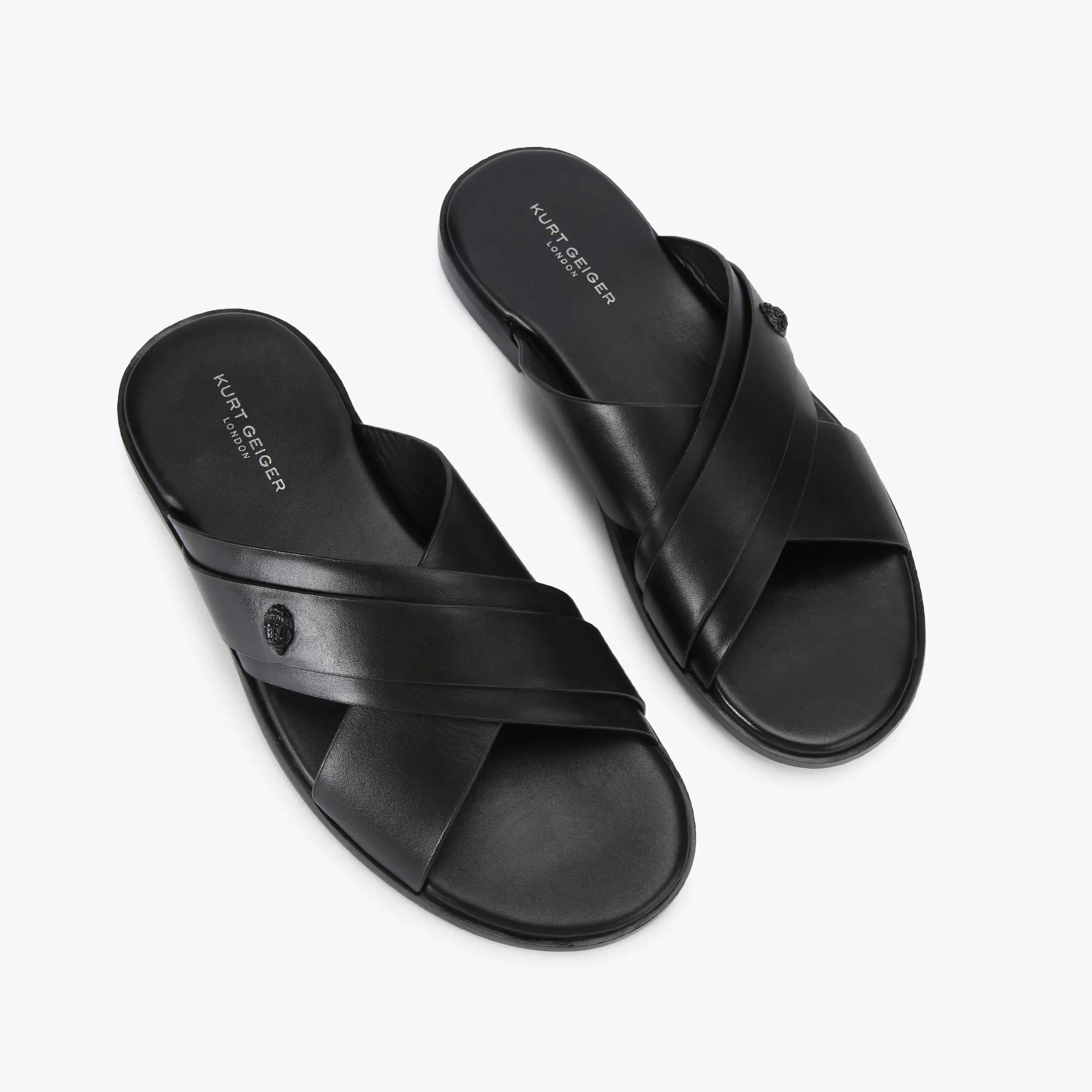 This Bond Sandal is crafted from a black leather with two crossed straps over the foot. There is a black eagle head with crystals on the outer side as well.