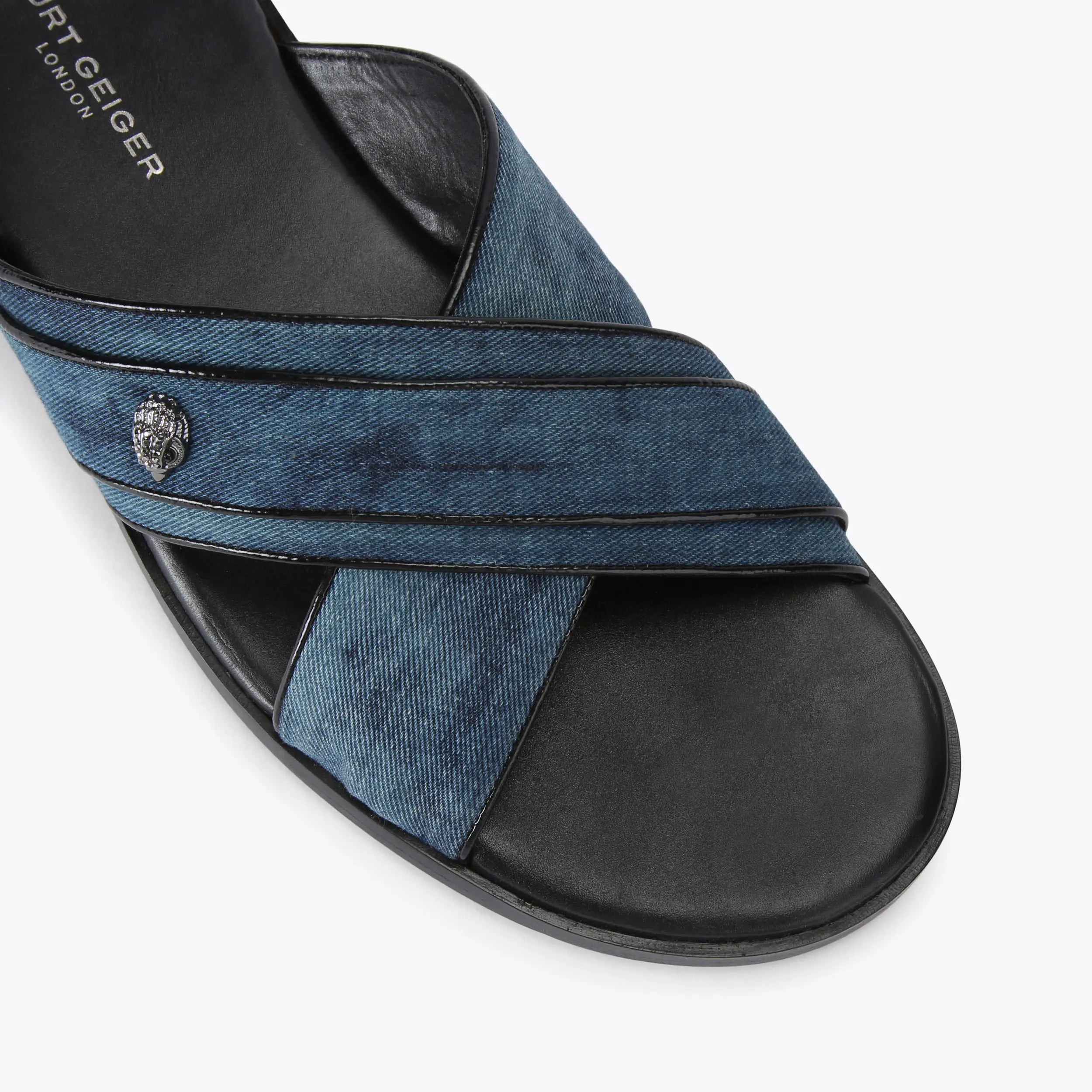 This Bond Sandal is crafted from a denim leather with two crossed straps over the foot. There is a gunmetal eagle head with crystals on the outer side as well.