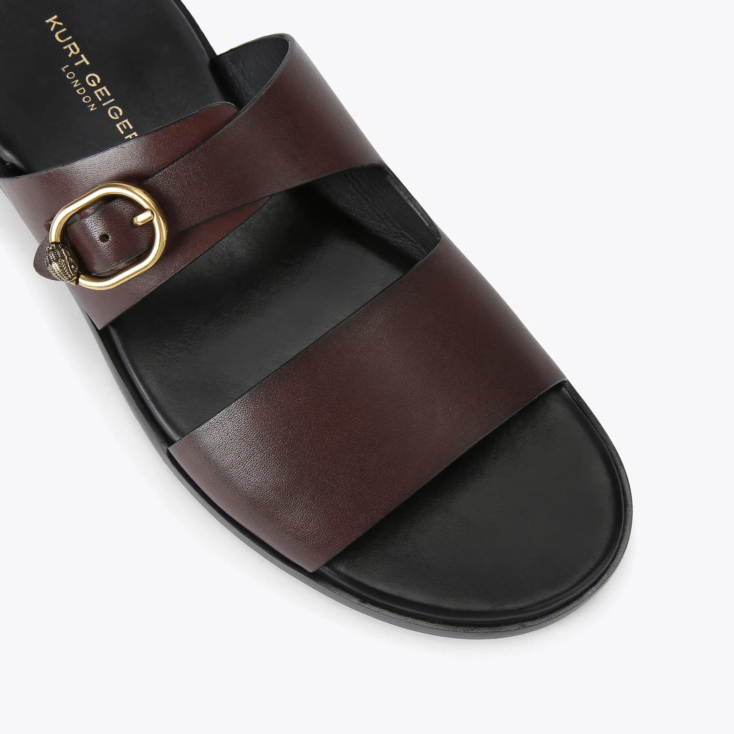 This Brent Sandal is crafted from a dark brown sandal. There are two thick straps across the foot with an antiqued brass buckle across one strap.