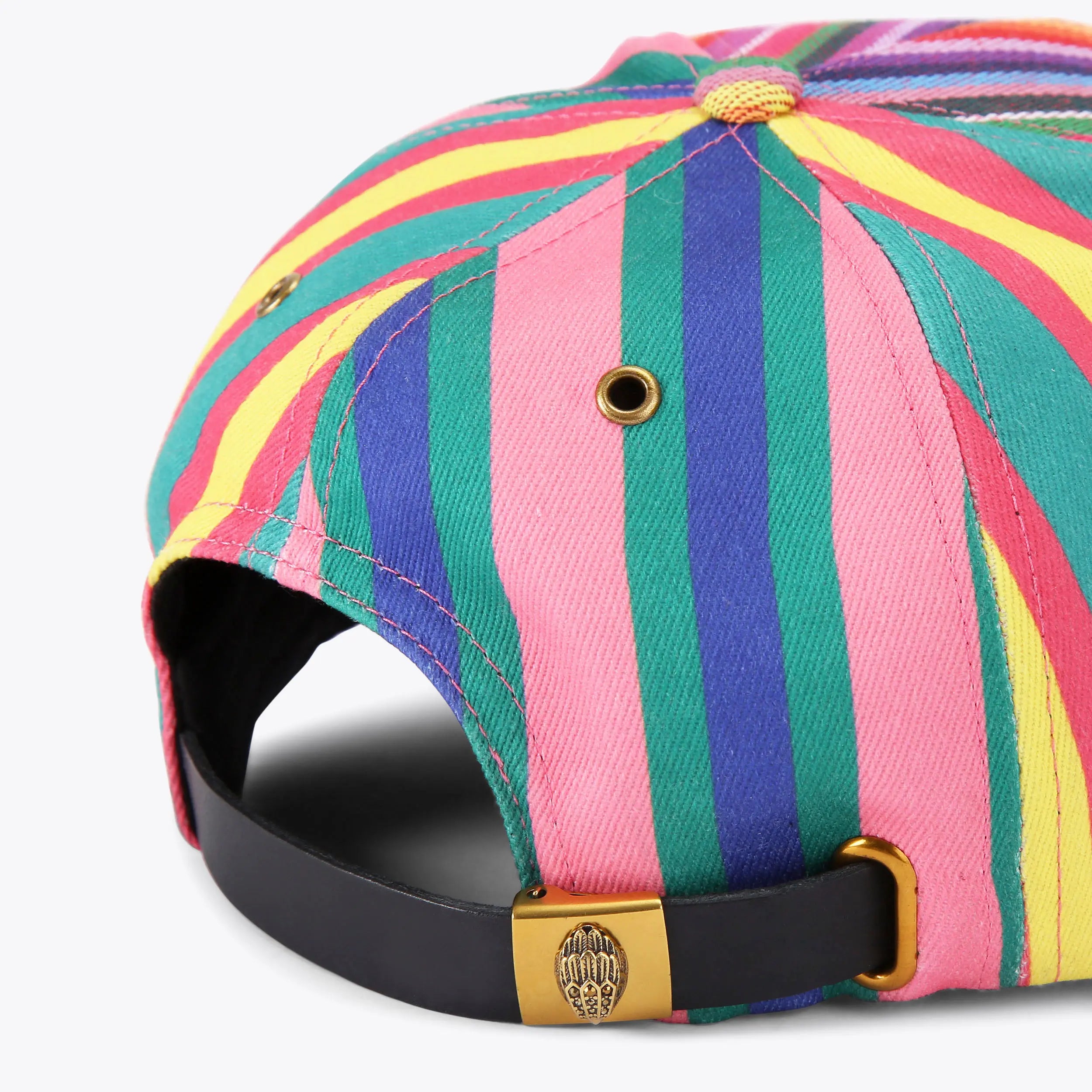 The Southbank Cap features a striped rainbow design. There is a metallic pink branded panel with silver studs on the front of the cap.