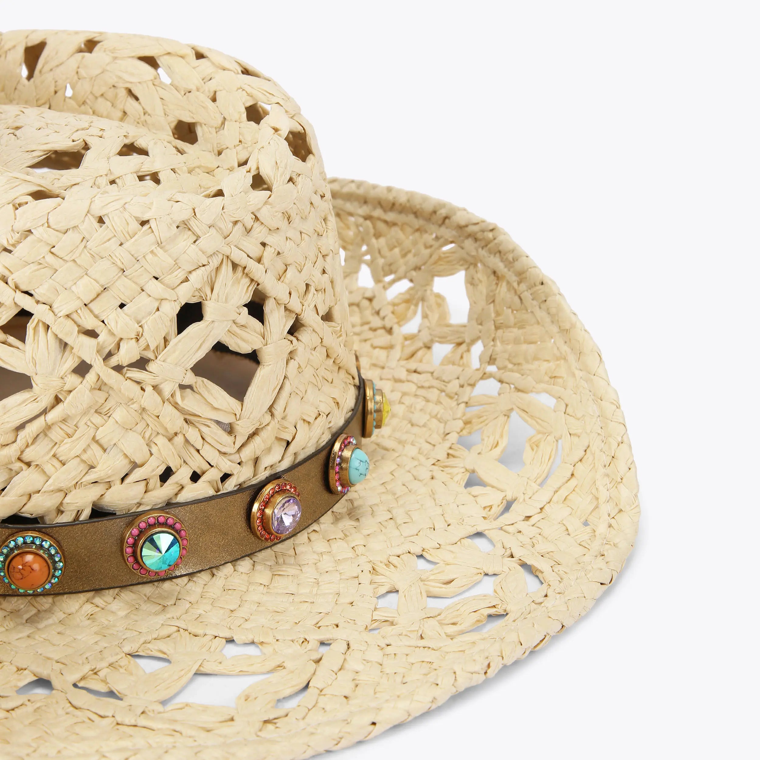 This Octavia Western hat is a wide brim natural raffia braided hat. There is a bronze strap around the brim with resin stones and crystals.