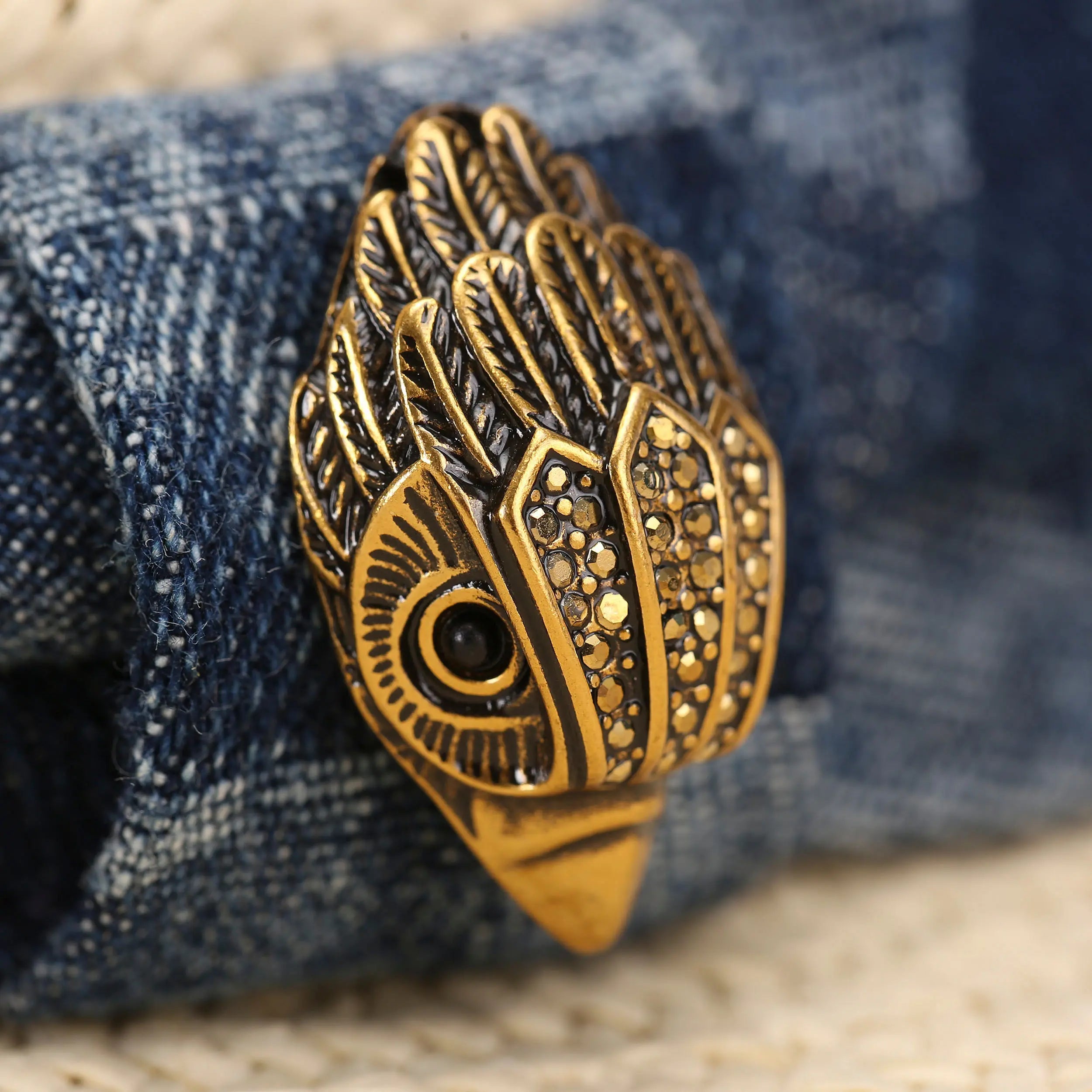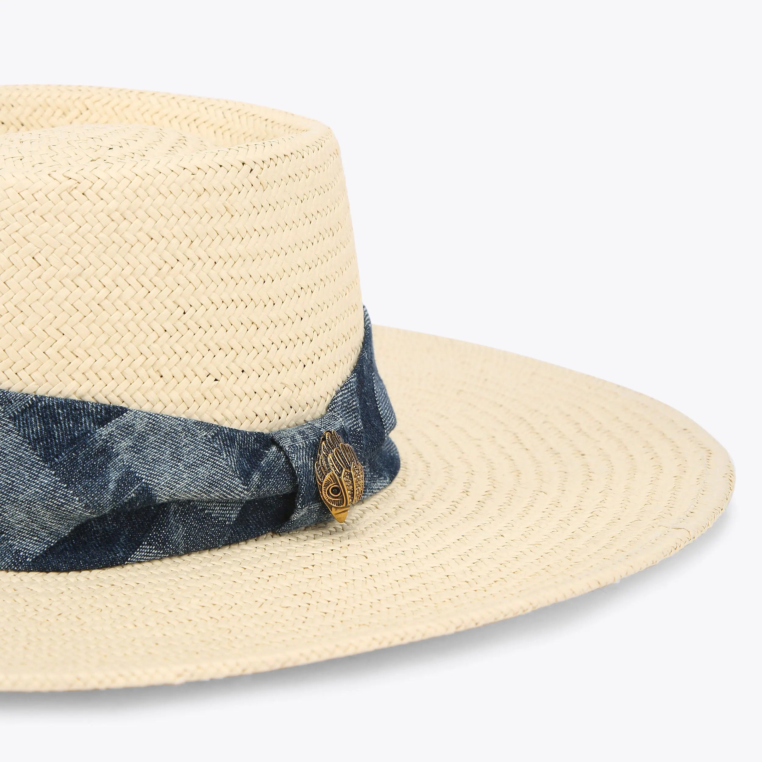 This Kensington Wide Brim hat is a wide brim natural raffia woven hat. There is a black denim effect woven satin scarf wrapped around the hat with an antiqued brass eagle head detail.