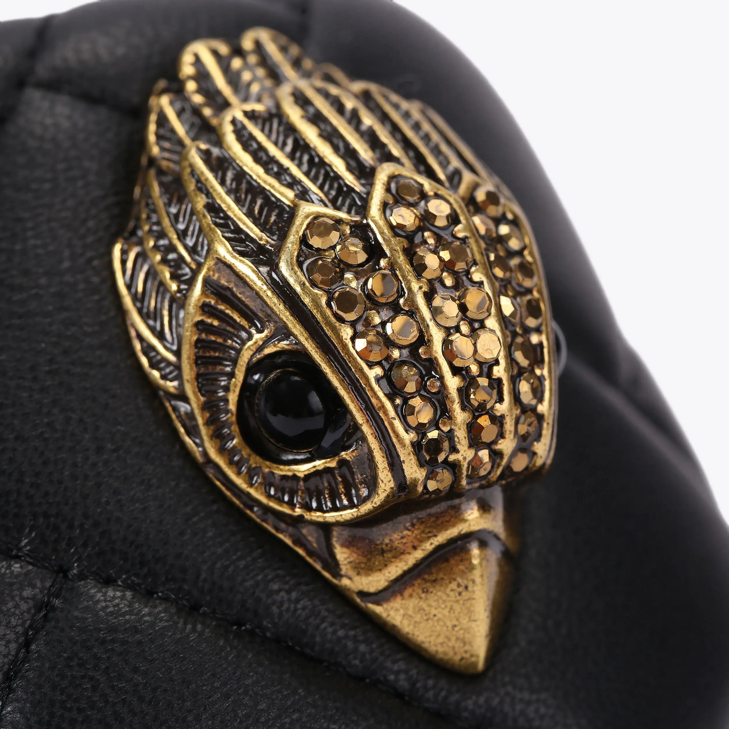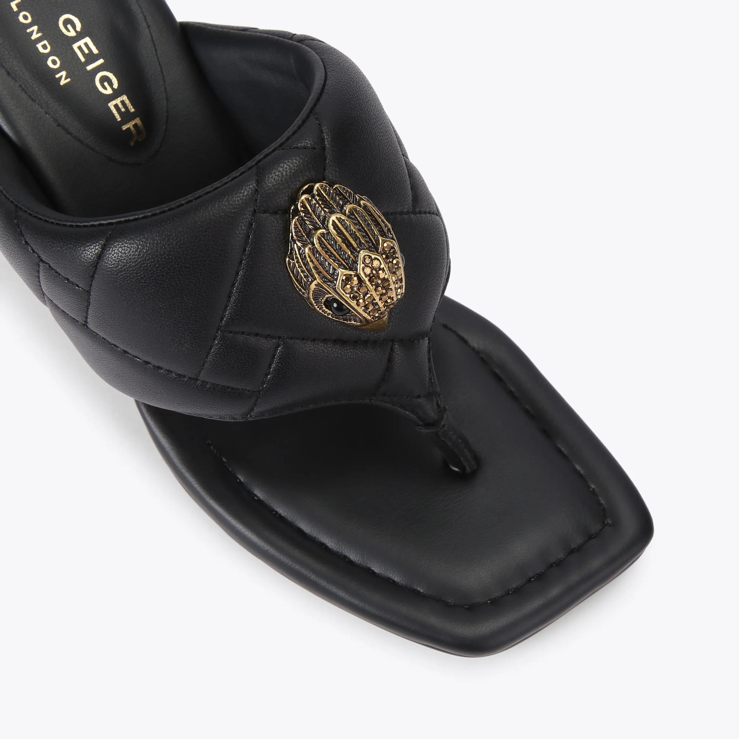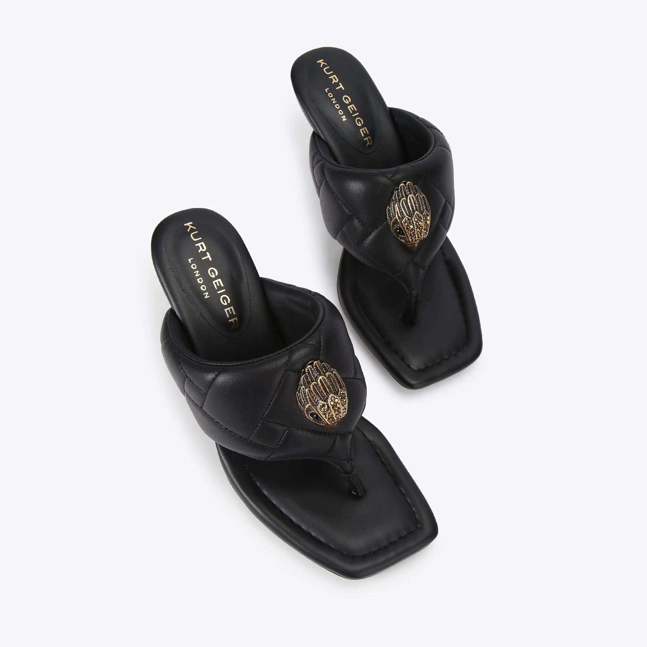 This pair of Puff Heeled Sandals feature a black leather upper with padded overstitch quilting across the t-bar straps. There is an antiqued brass eagle head sat on top of the straps.
