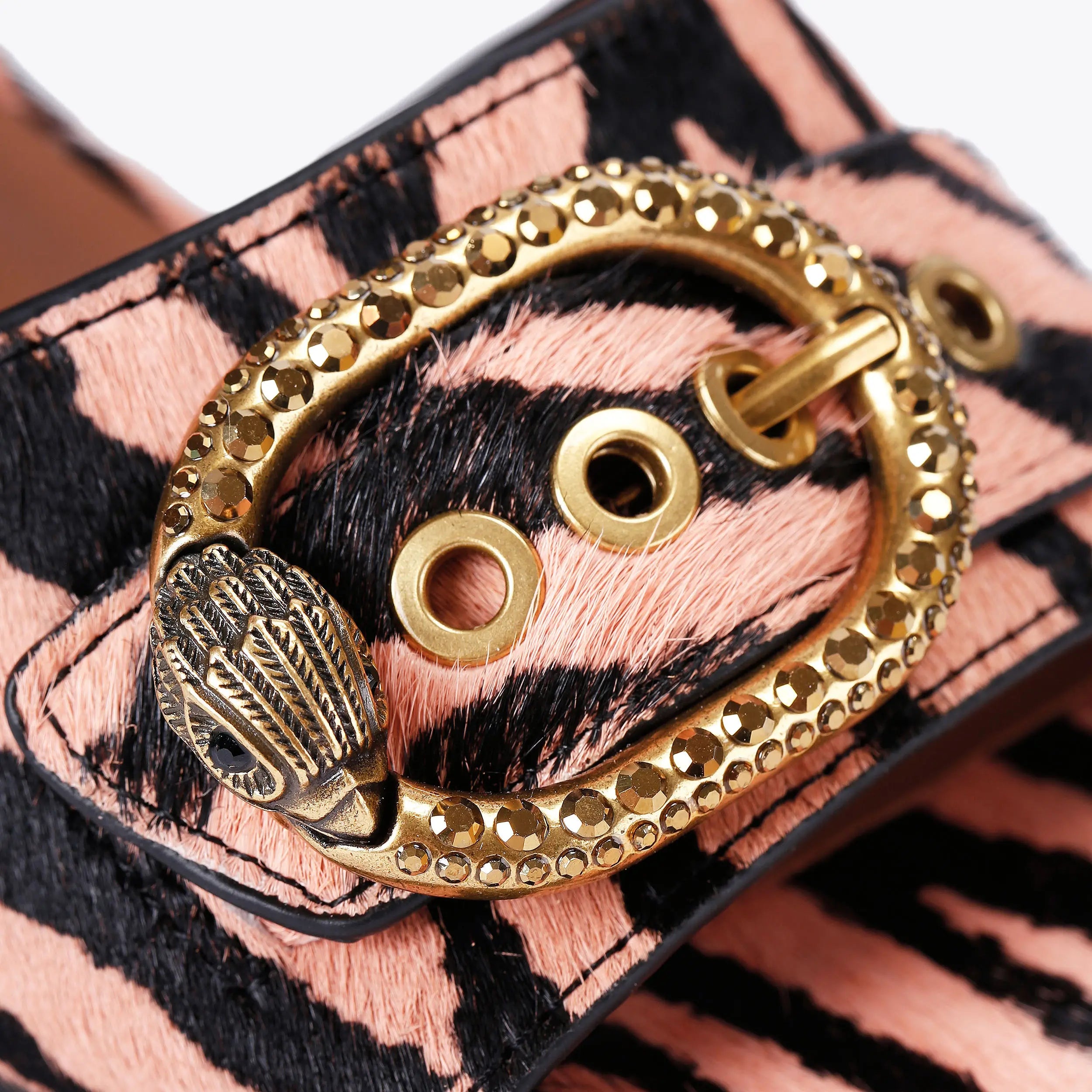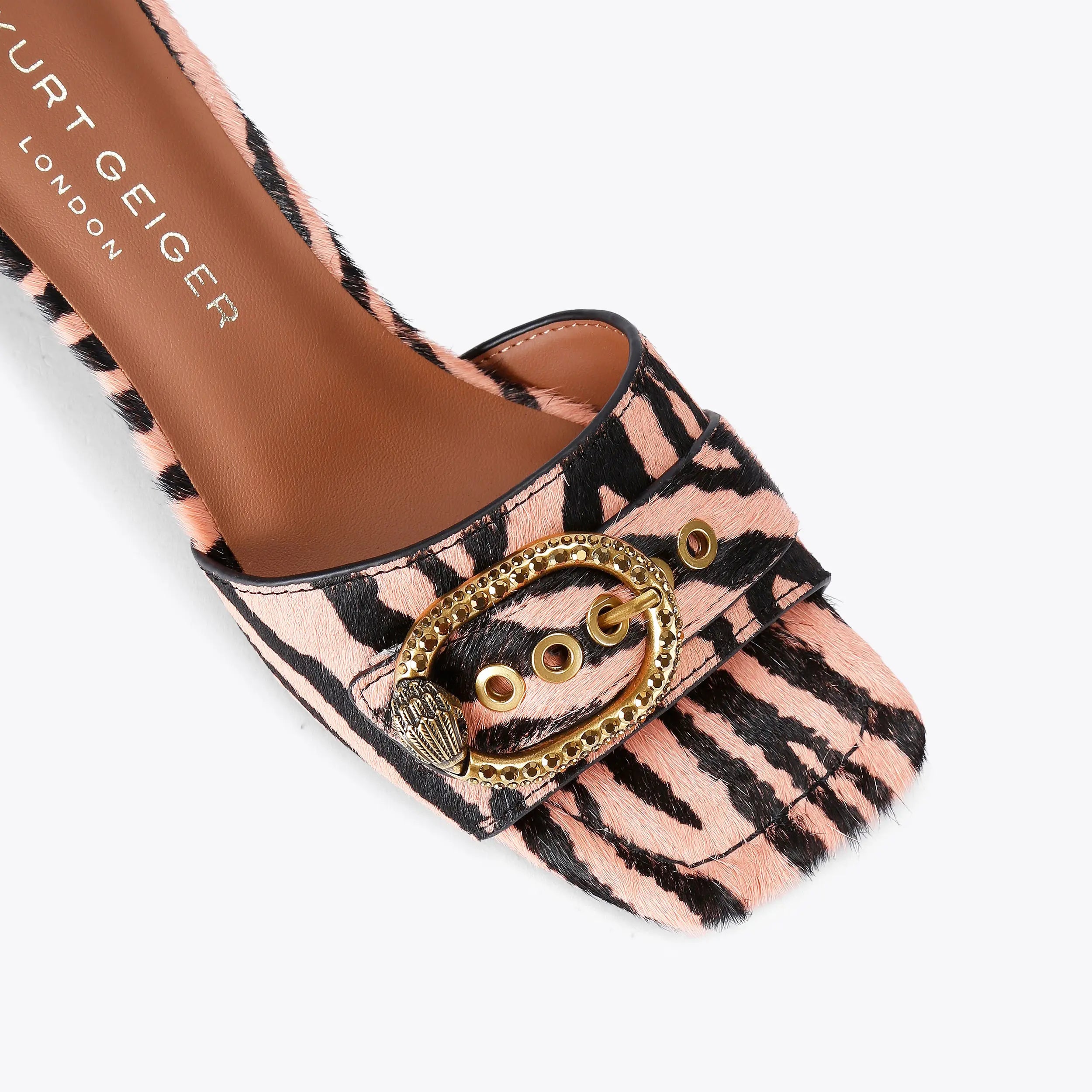 This Mayfair Mule heel is crafted from a pink and black zebra striped textured leather. There is an antiqued brass oval trim with eagle head to one side buckle on the strap.