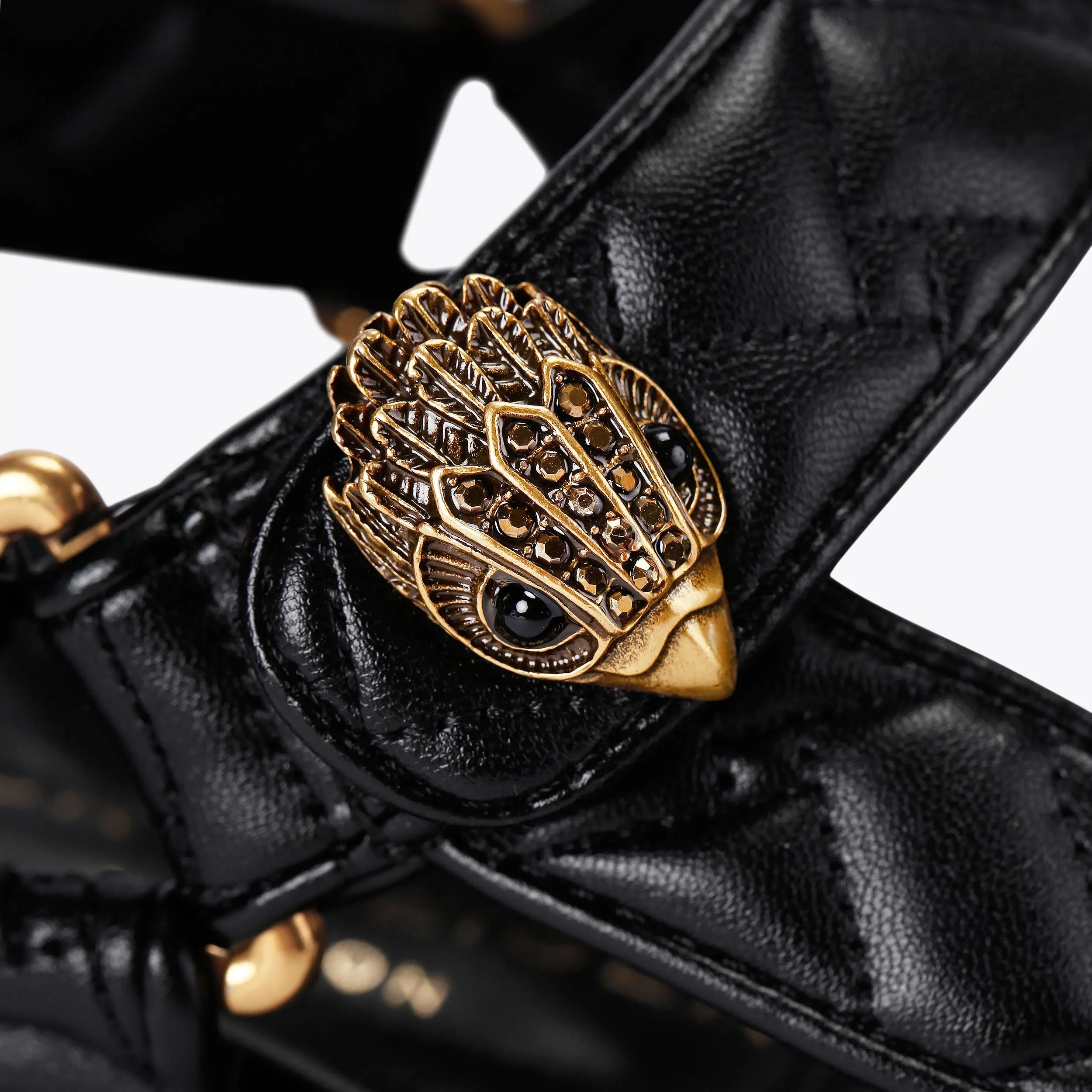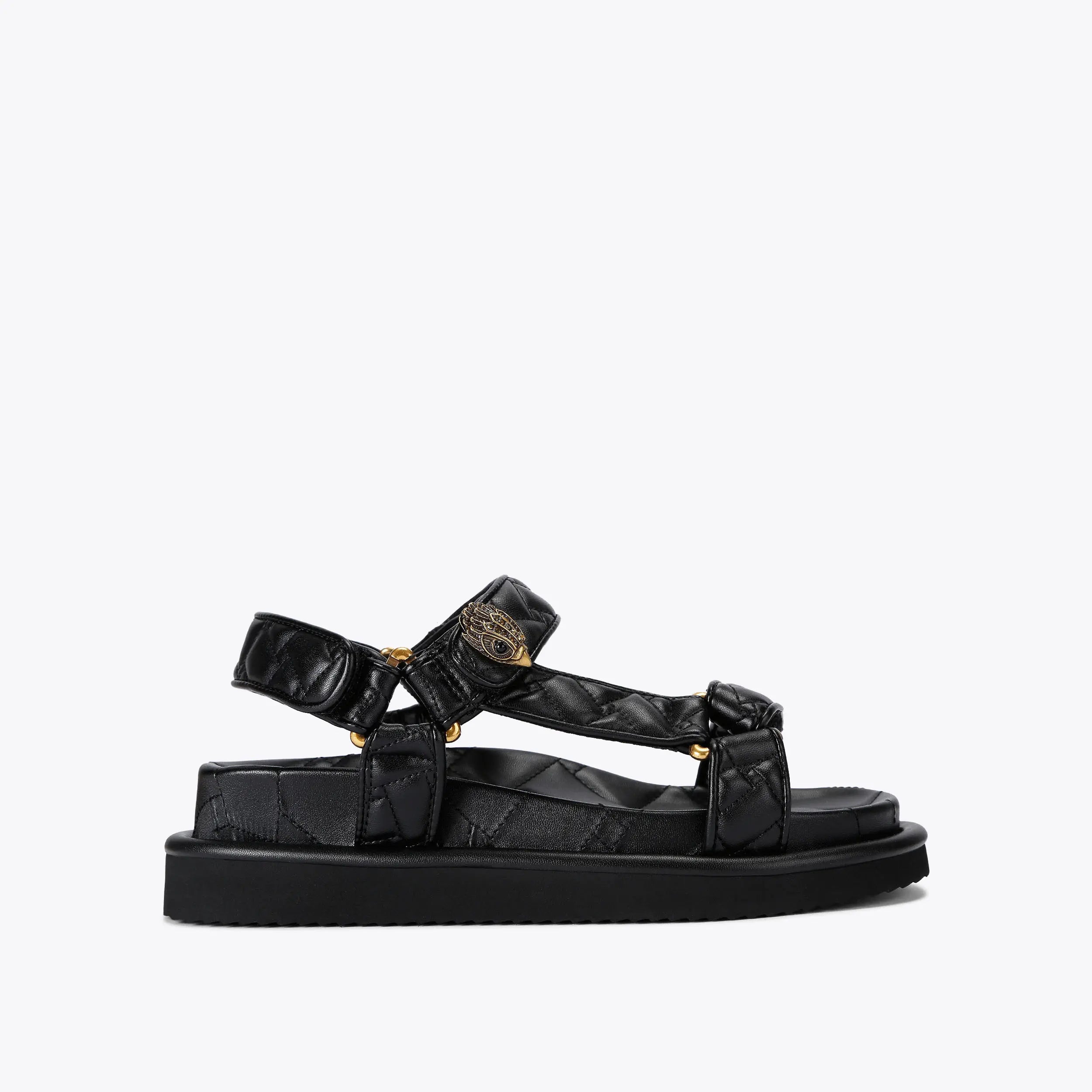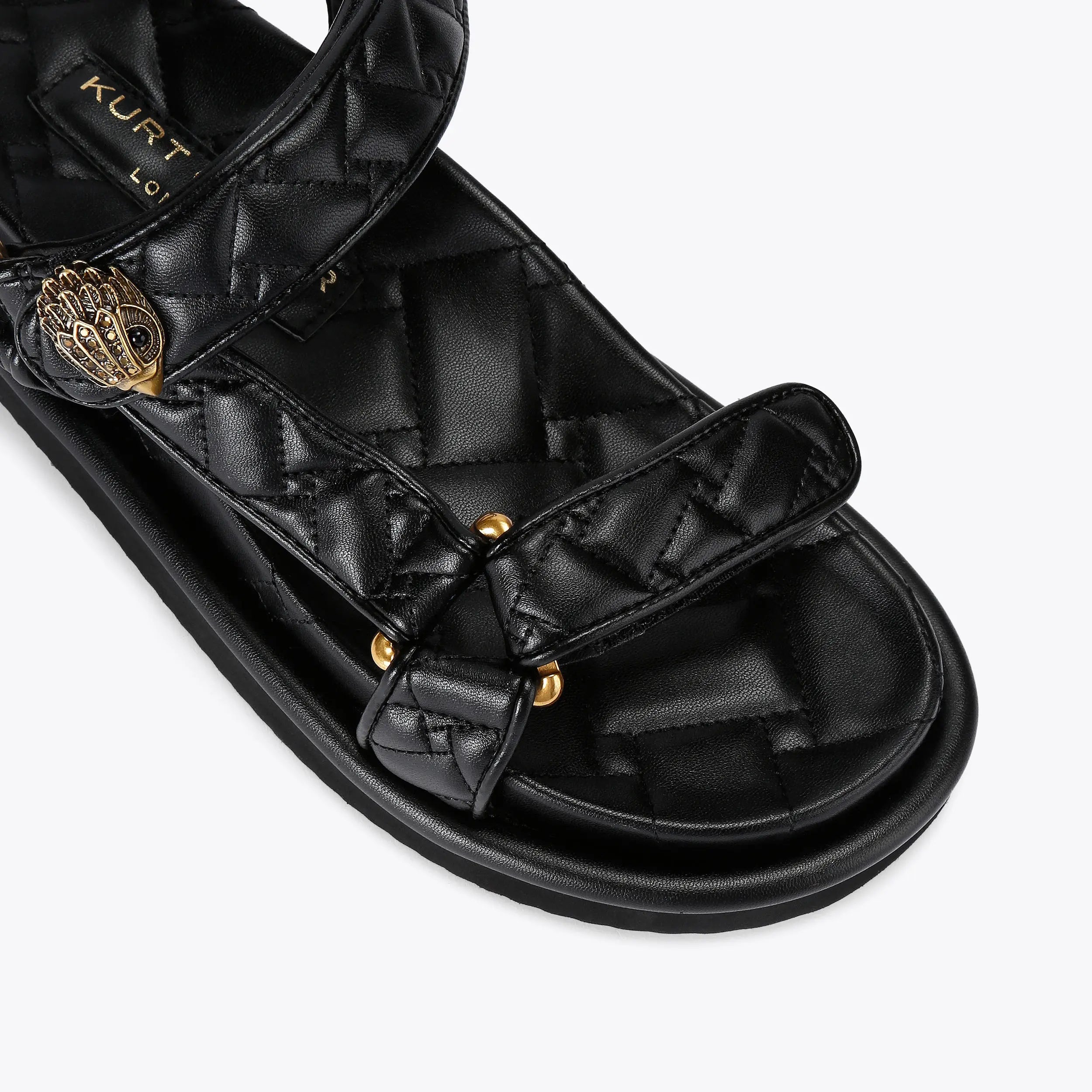 The Orson Sandal features a soft black upper with weave quilting pattern. The straps are velcro with an antiqued brass eagle head emblem sat on top.