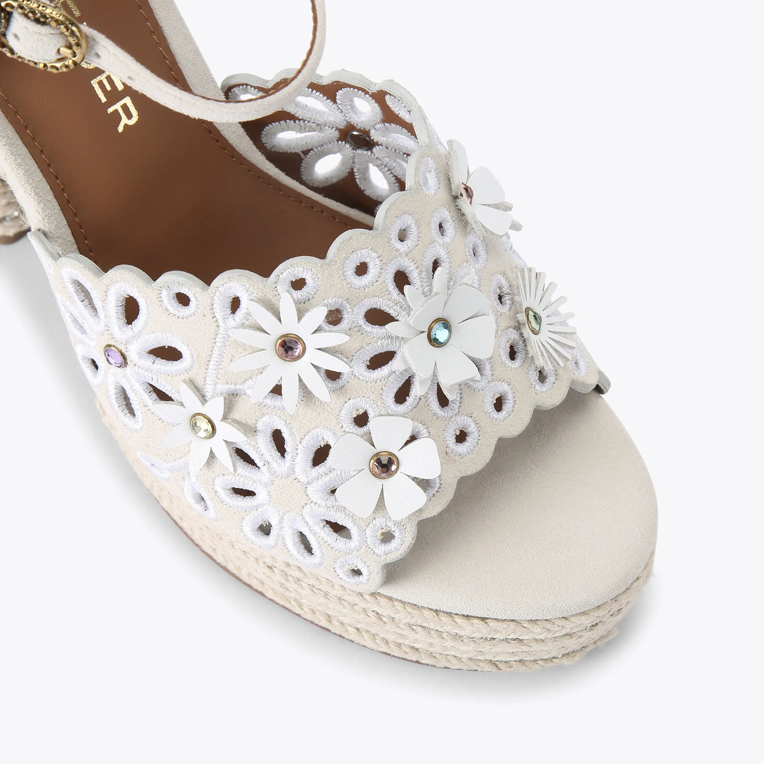 This Flower Platform Sandal is crafted in a bone taupe suede with 3D and cut out flowers on the strap. The high heel is in a rope style with crystal details.