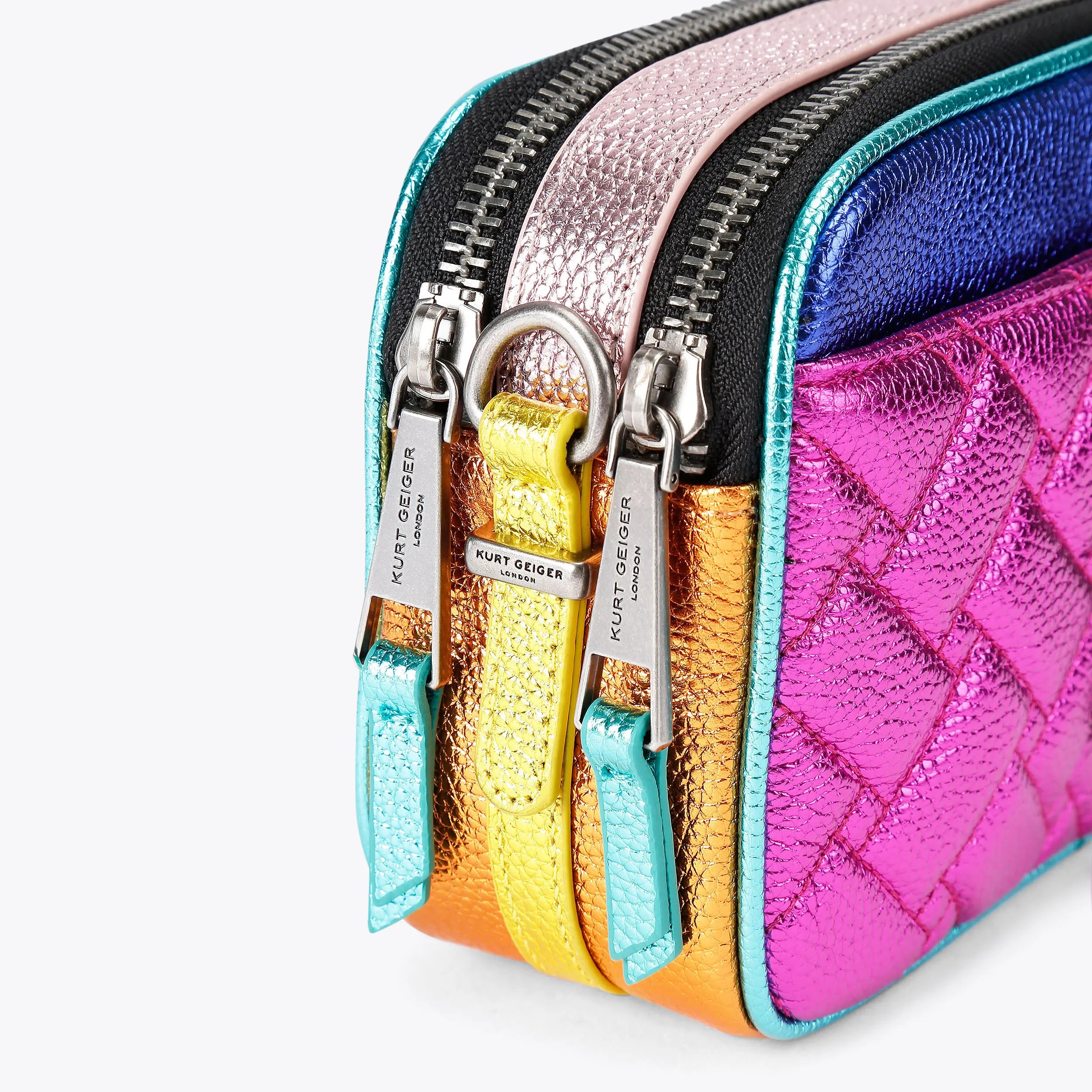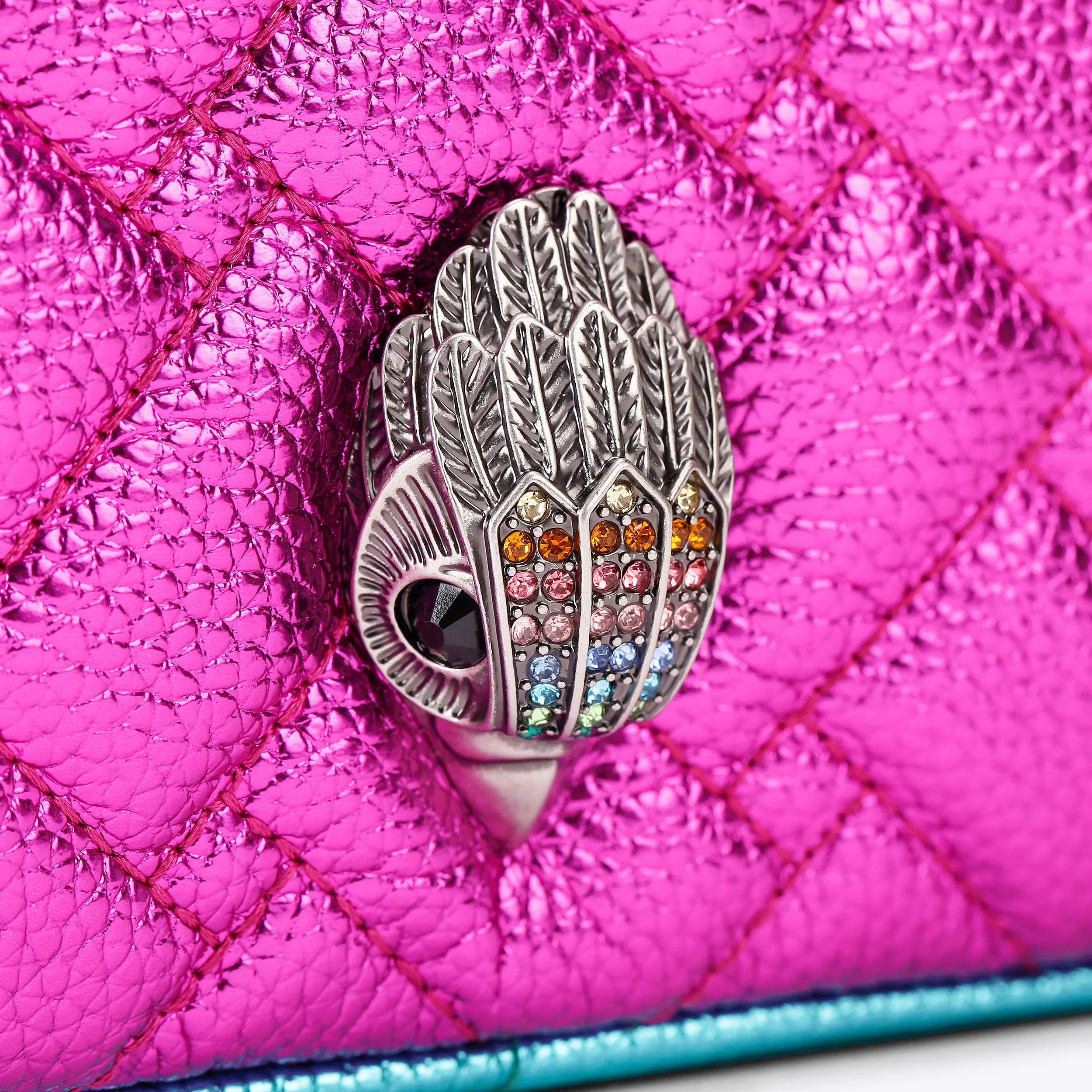 The Kensington Drench Camera purse features different colour metallic pebble grained leathers on the exterior with signature parquet padded overstitch quilting. There is an antiqued silver eagle head with crystals on the front.