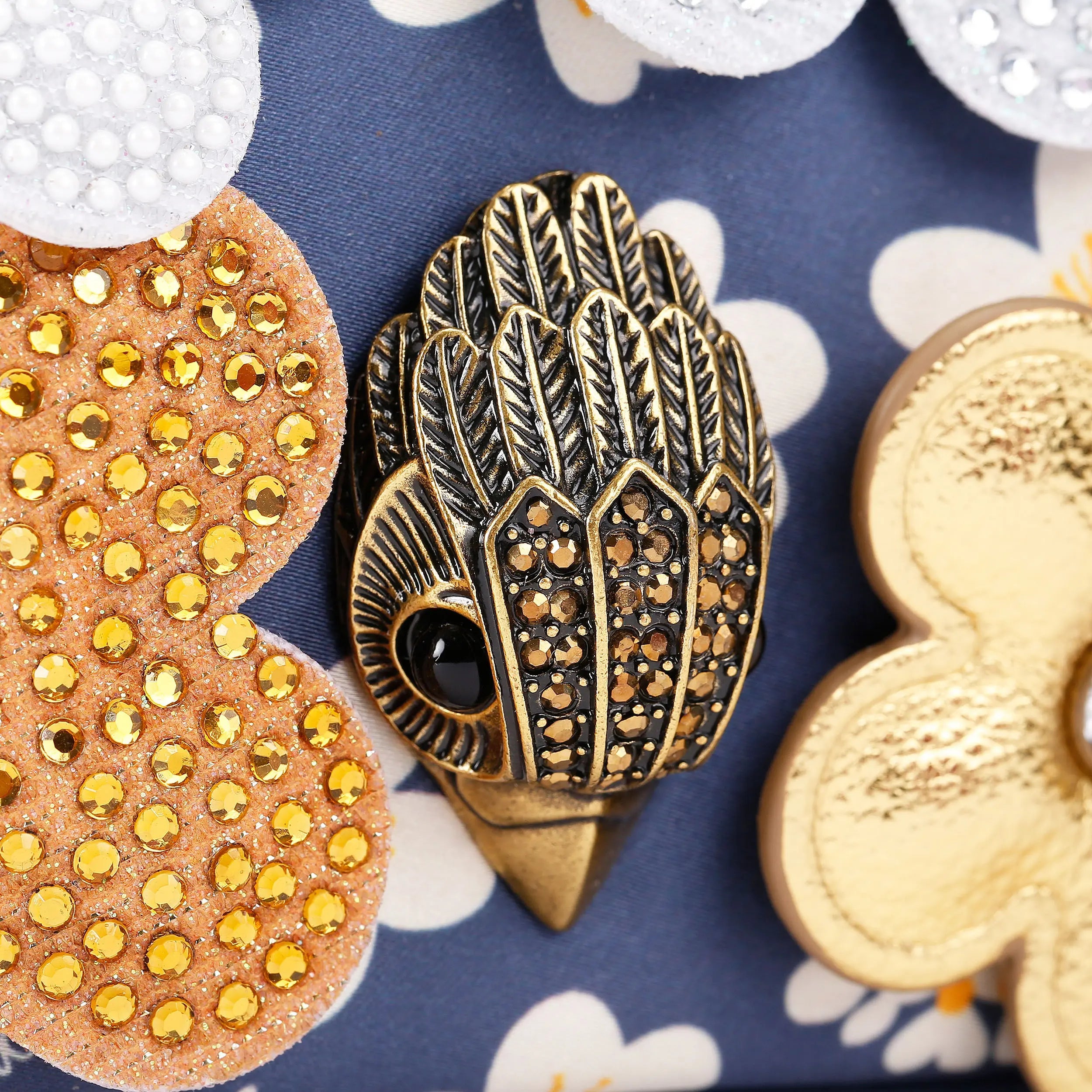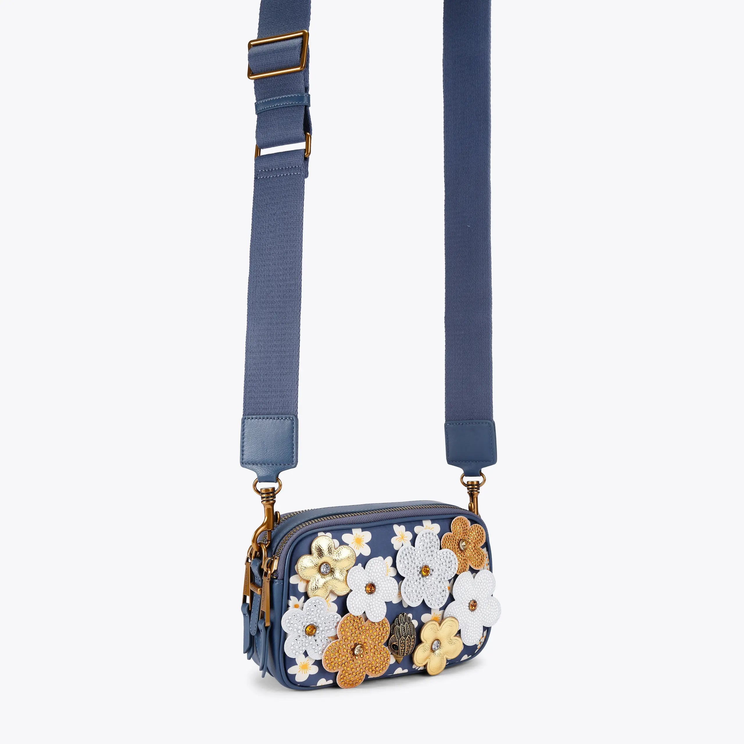 The Dual Zip Kensington Camera purse features a blue denim exterior with 3D metallic flowers with crystals at the centre of each. There is an antiqued brass eagle head on the front.