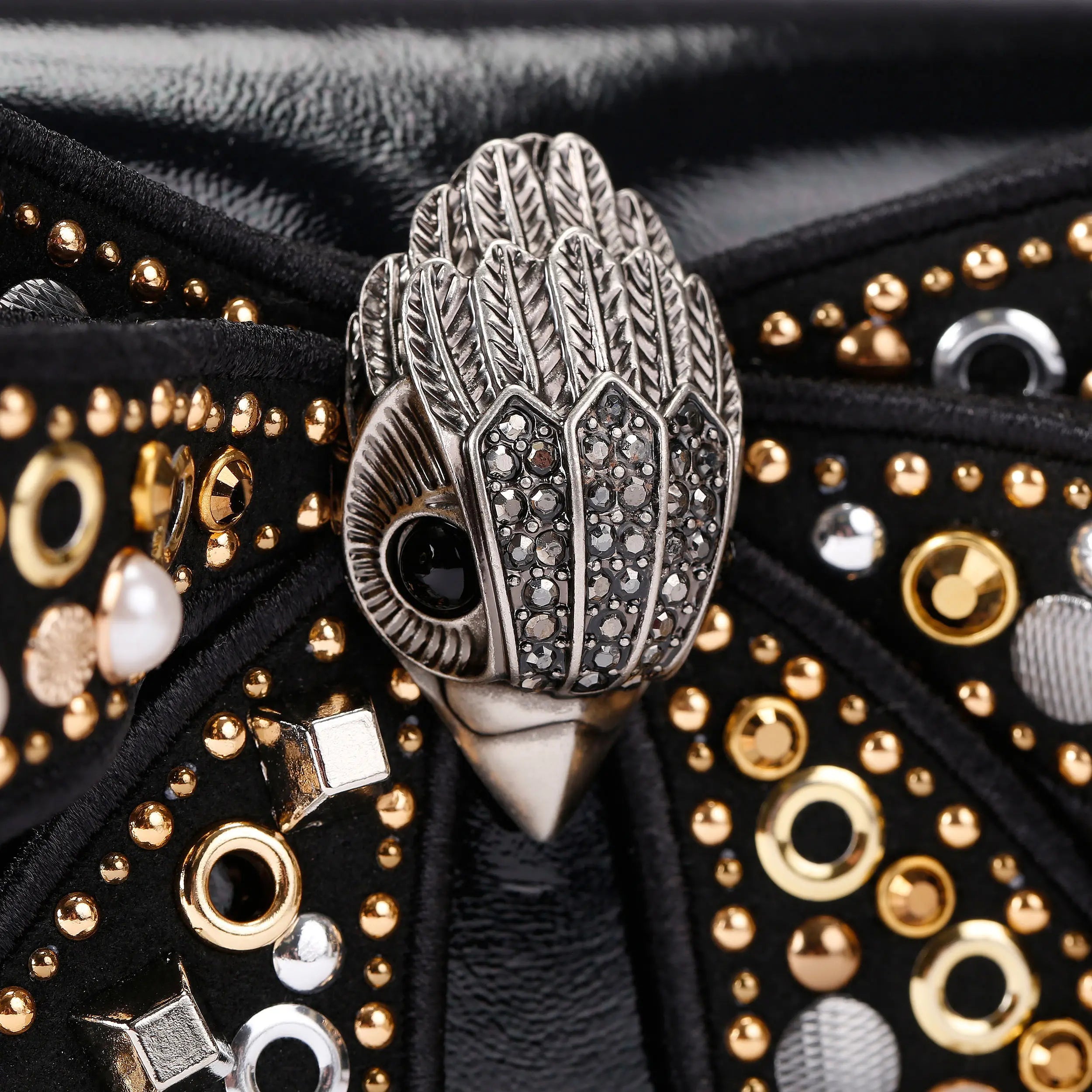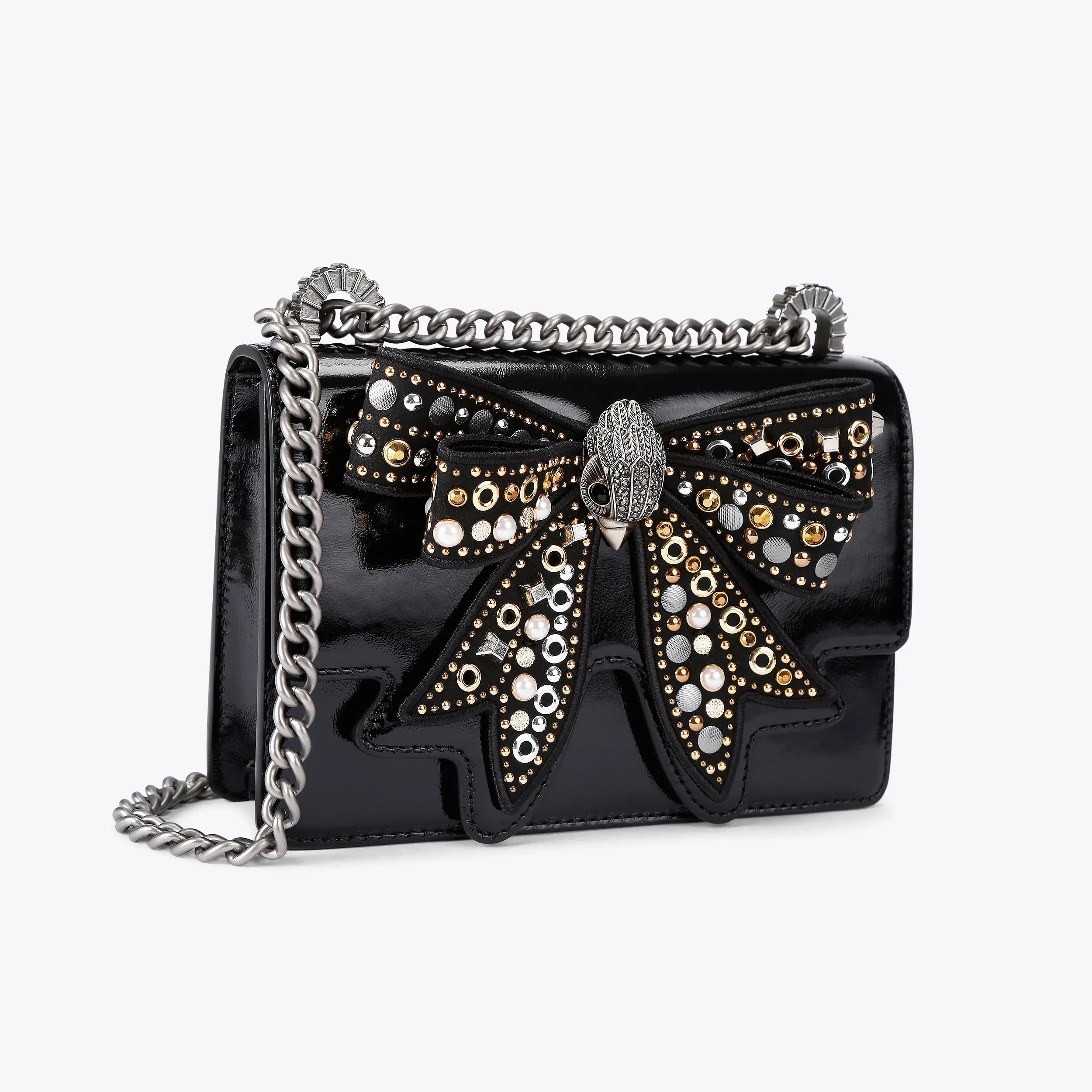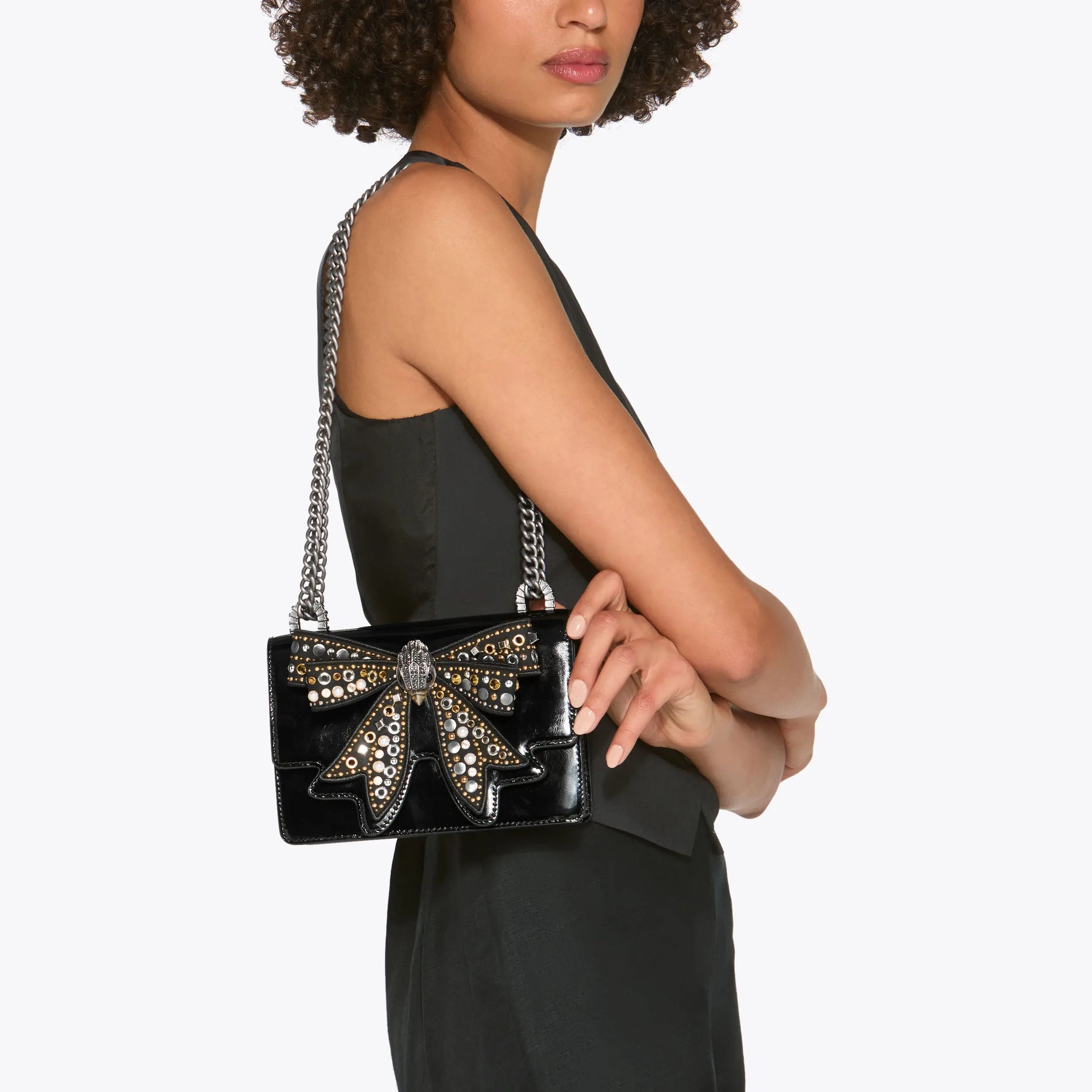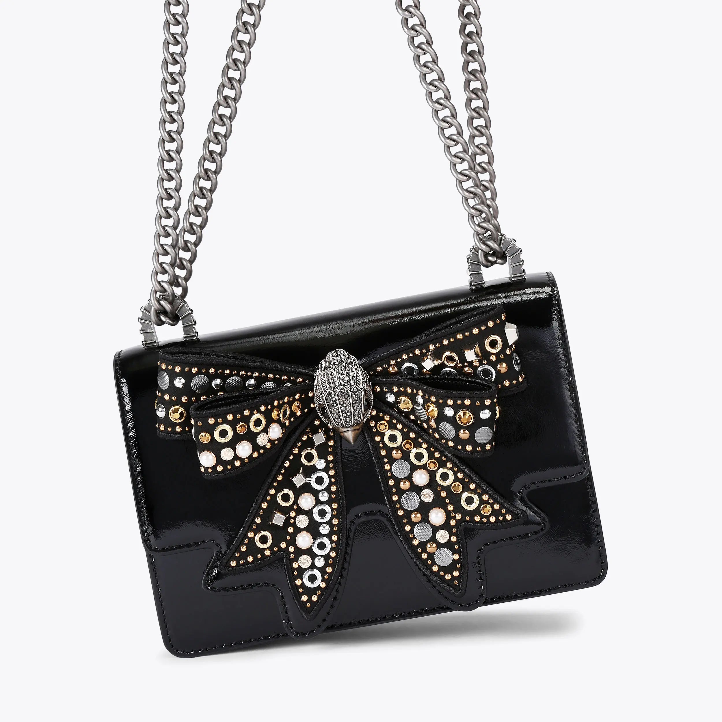The Small Shoreditch Cross Body is crafted from a black leather. The front flap is topped with an embellished bow with an antiqued brass head in the centre.