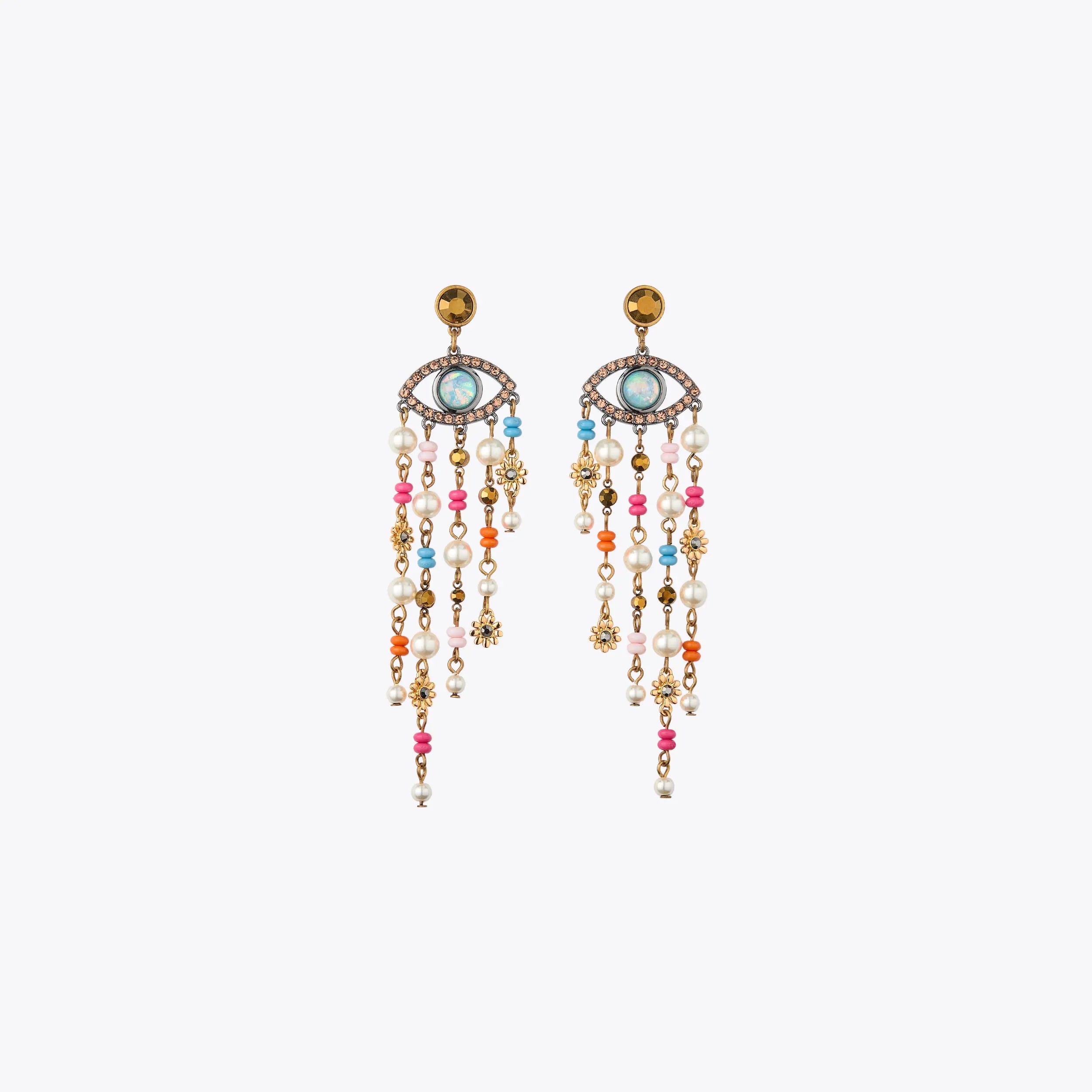 This pair of Beaded Eye Earrings arrive with a crystal evil eye motif stud with faux opal at the centre. There are five linear drops each embellished with faux pearls, crystals and floral motifs.