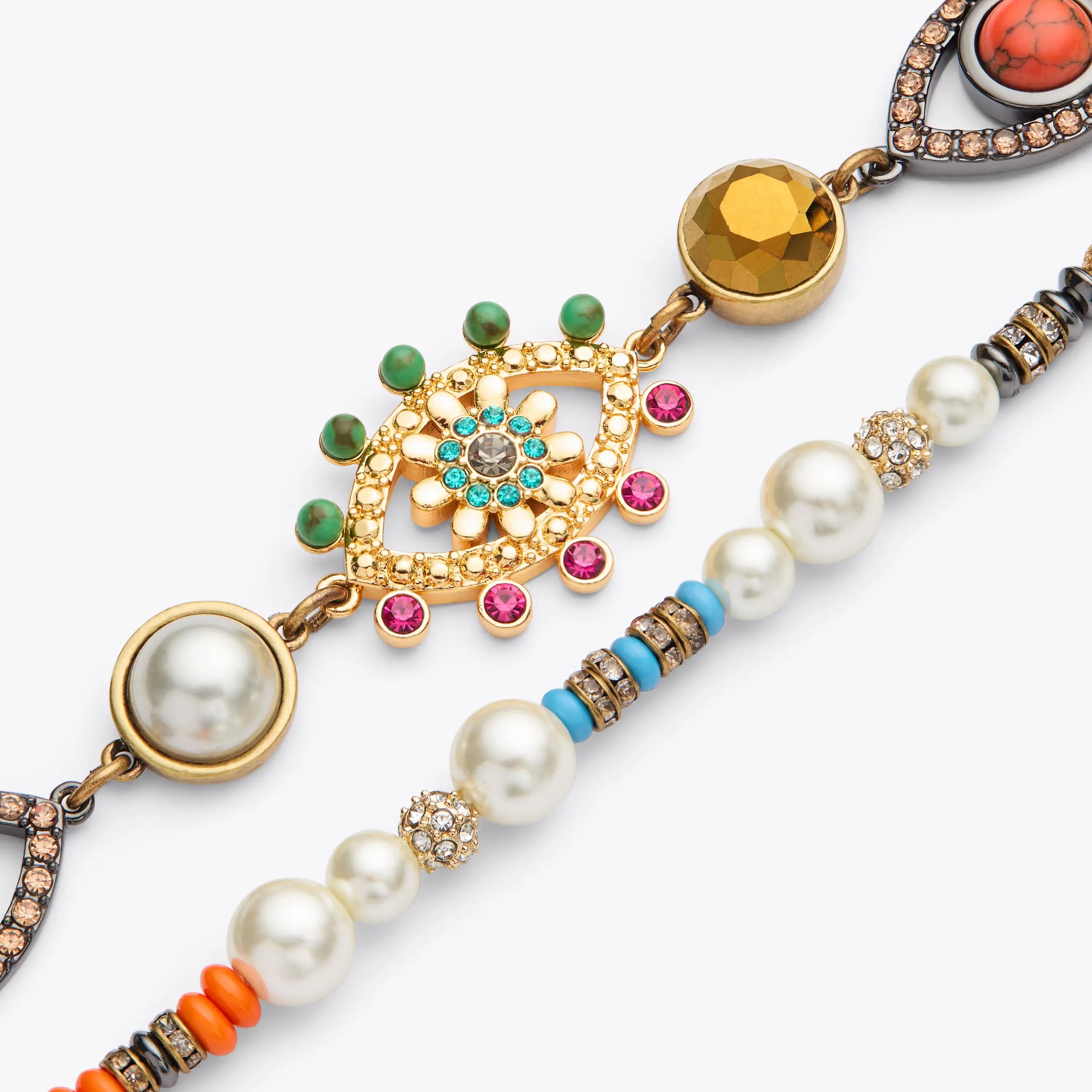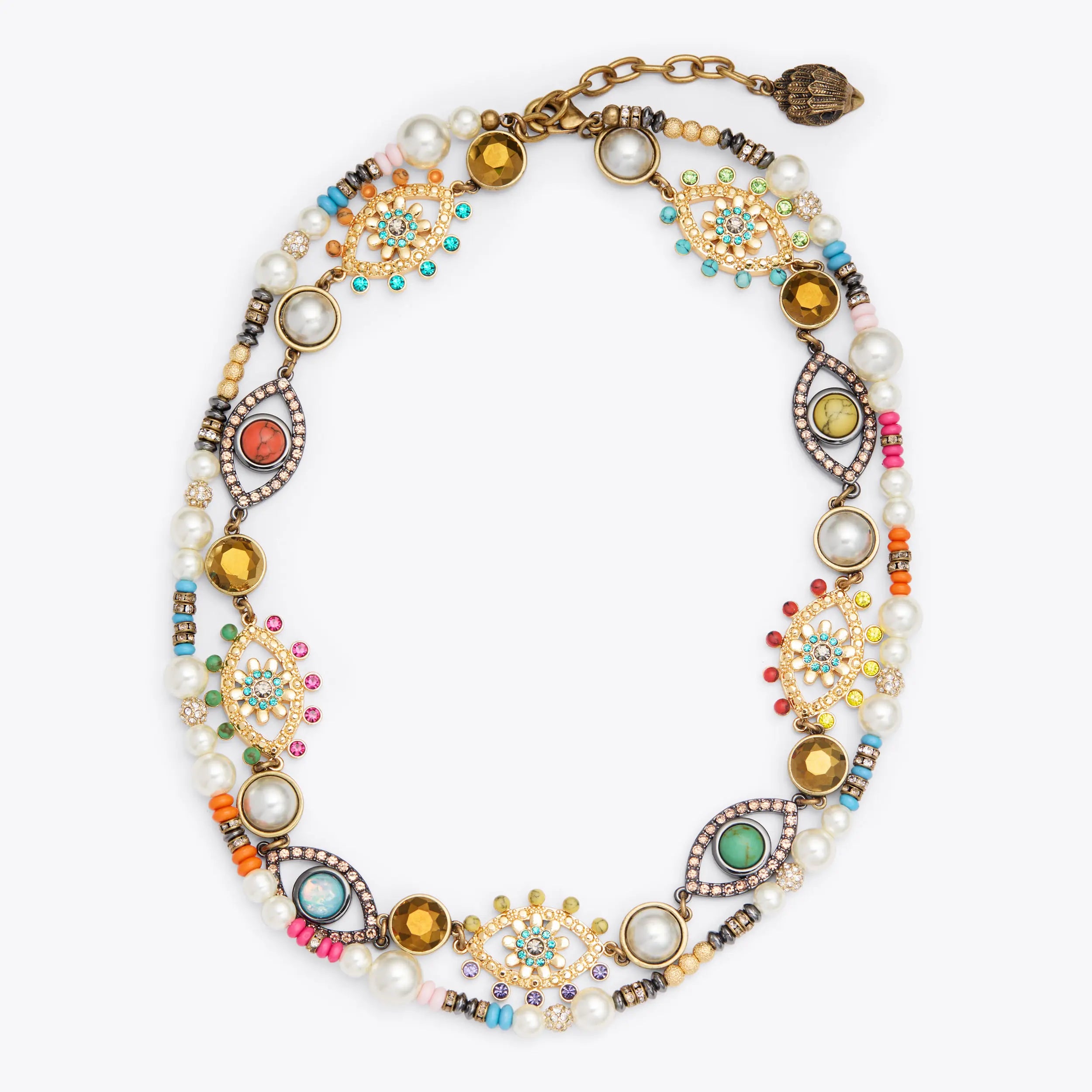 The Multi Strand Eye Necklace features two strands which complement each other. There are multiple evil eye, faux pearls and crystals along each strand.