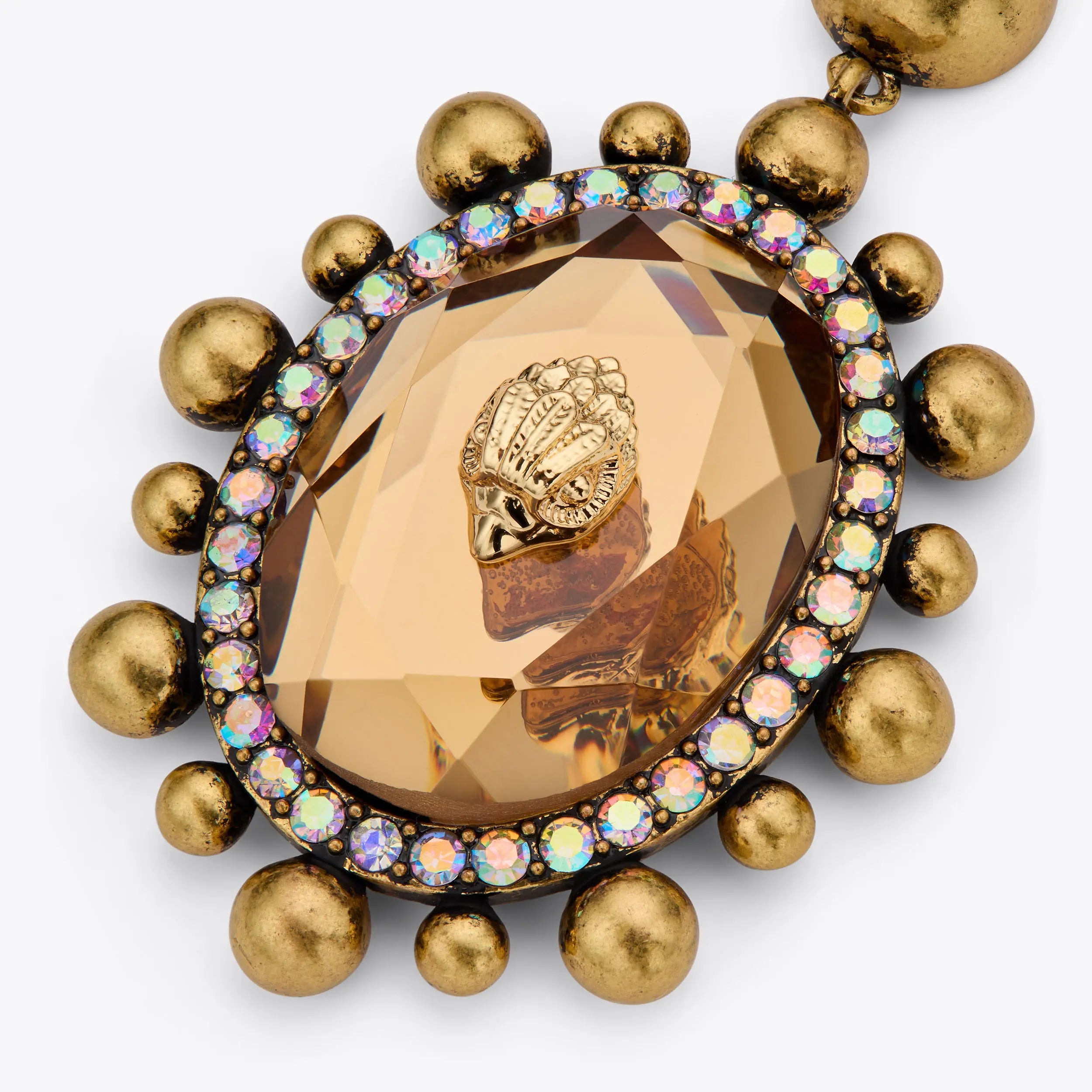 This pair of Extra Large Regency Earrings feature a small antiqued brass stud earring with an oval crystal surrounded by smaller antiqued brass studs droplet.