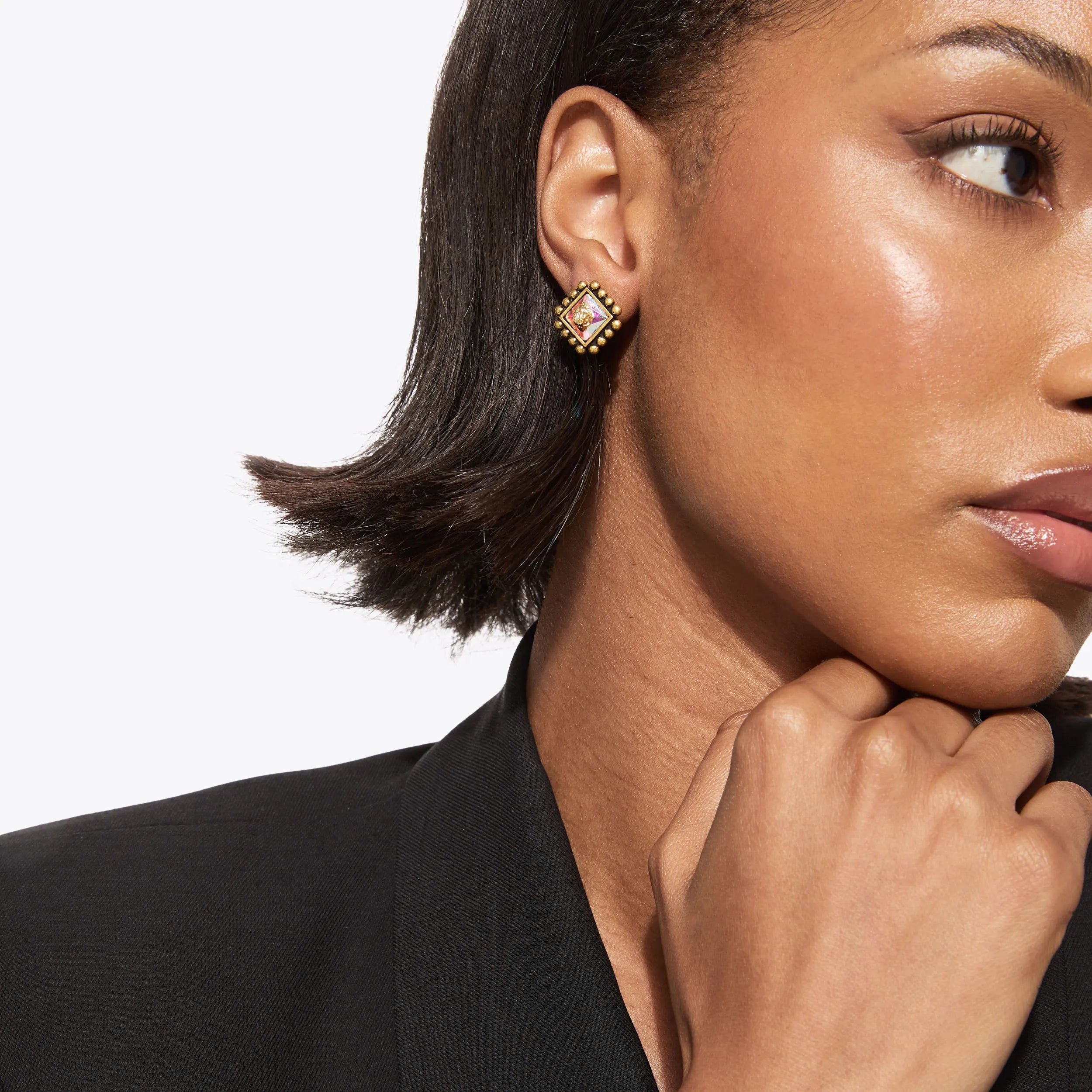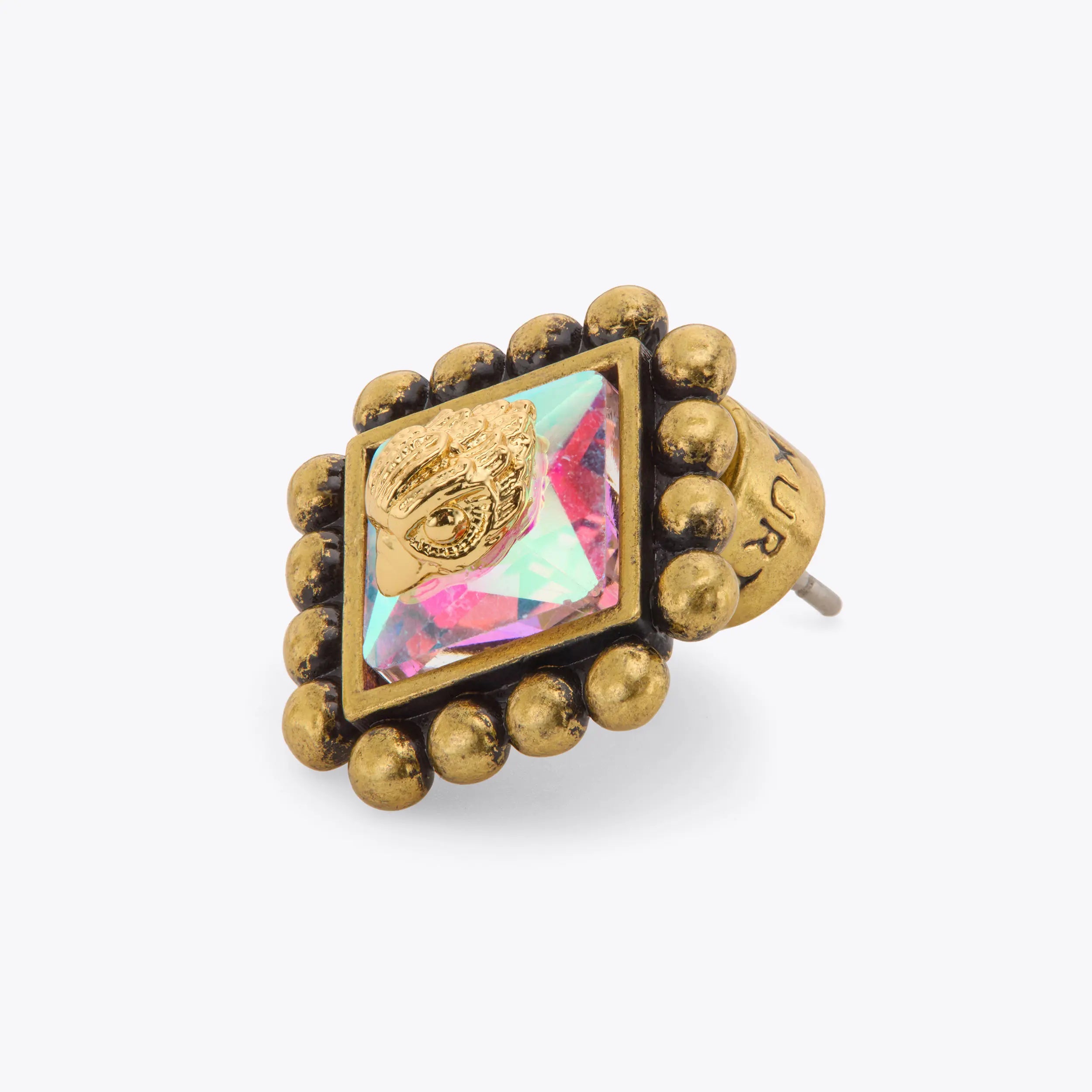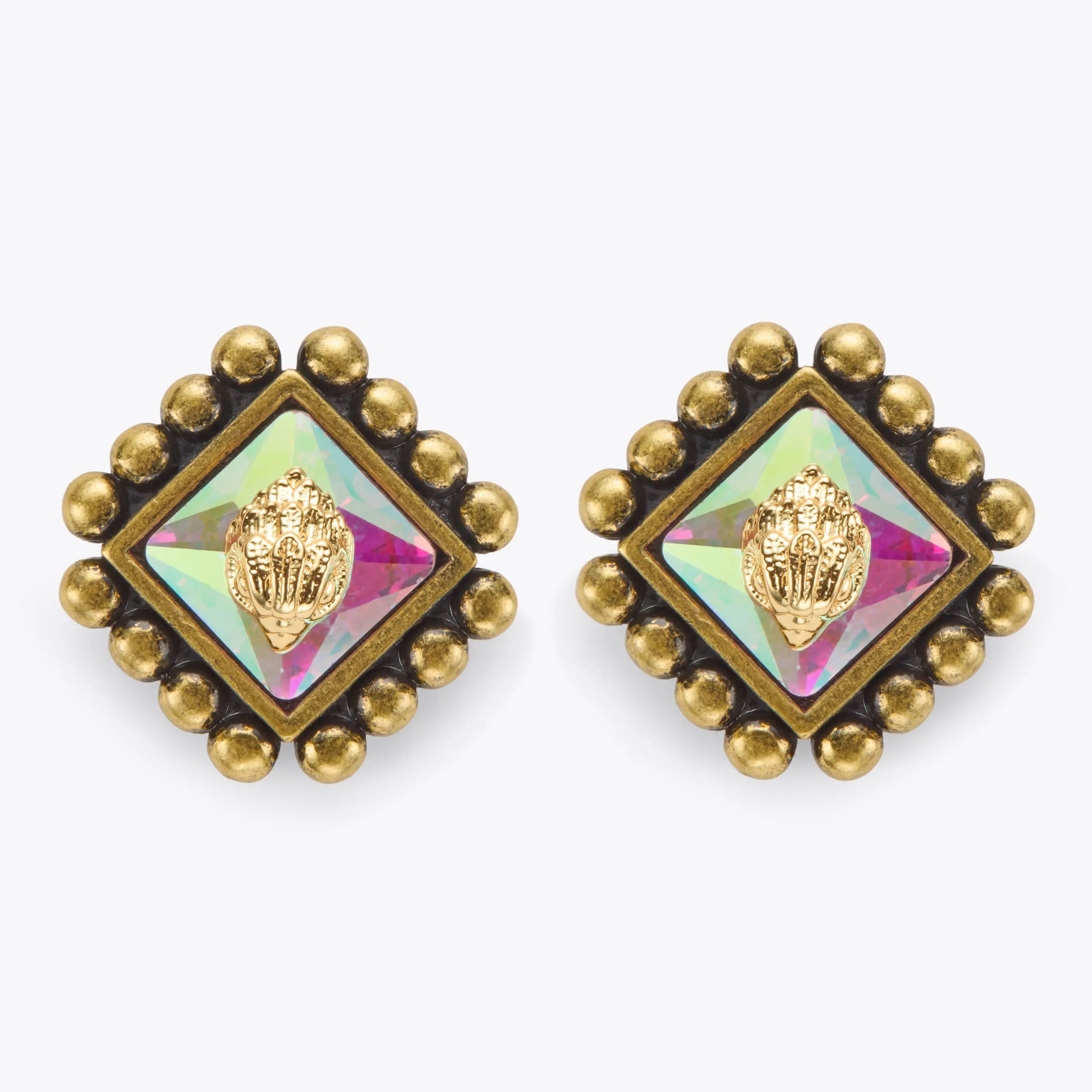 The Regent Stud earrings feature an iridescent gemstone which is surrounded by antiqued brass.