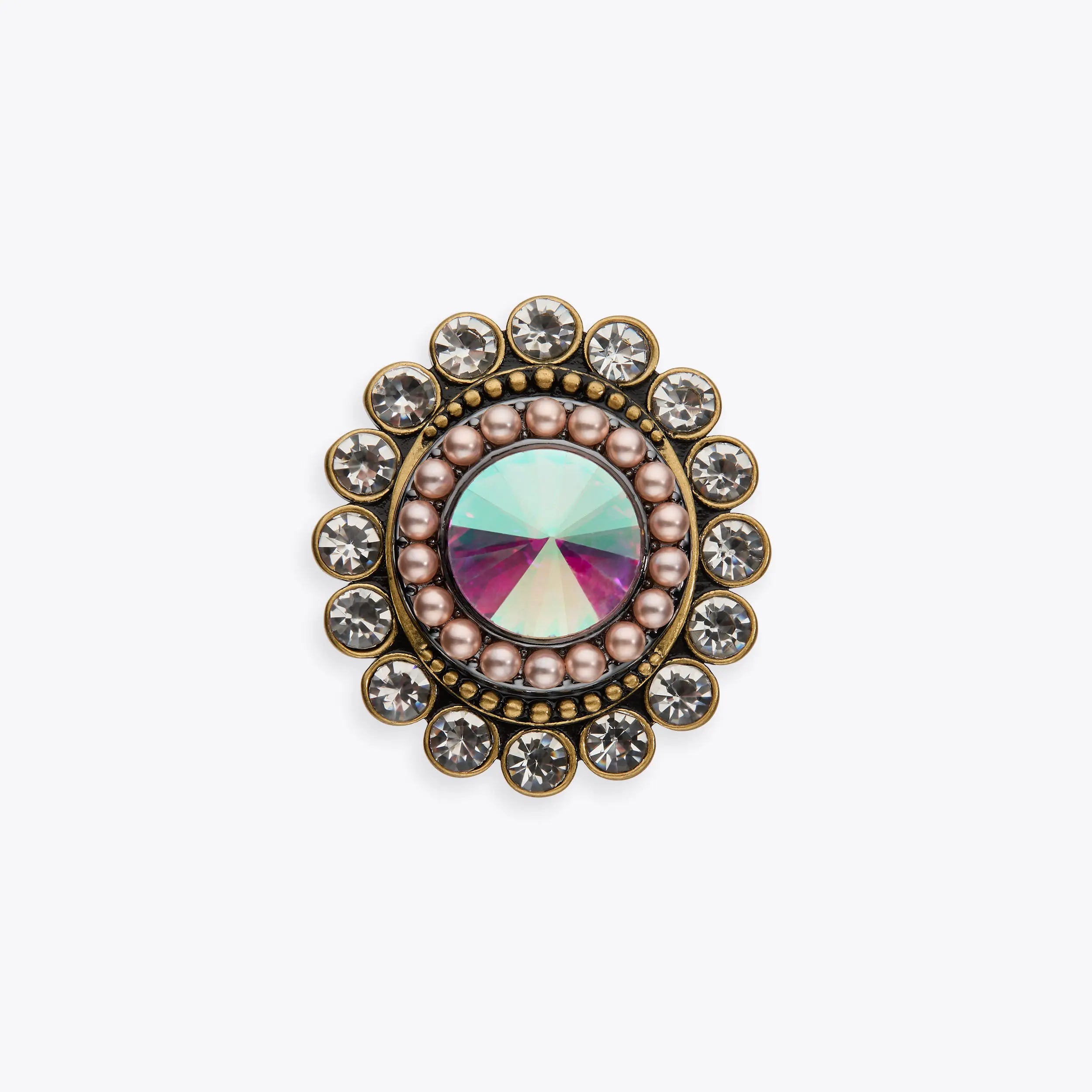 The Octavia Ring features a gold tone with pink crystals. There is a large crystal which is surrounded by smaller ones sat on top of the band.