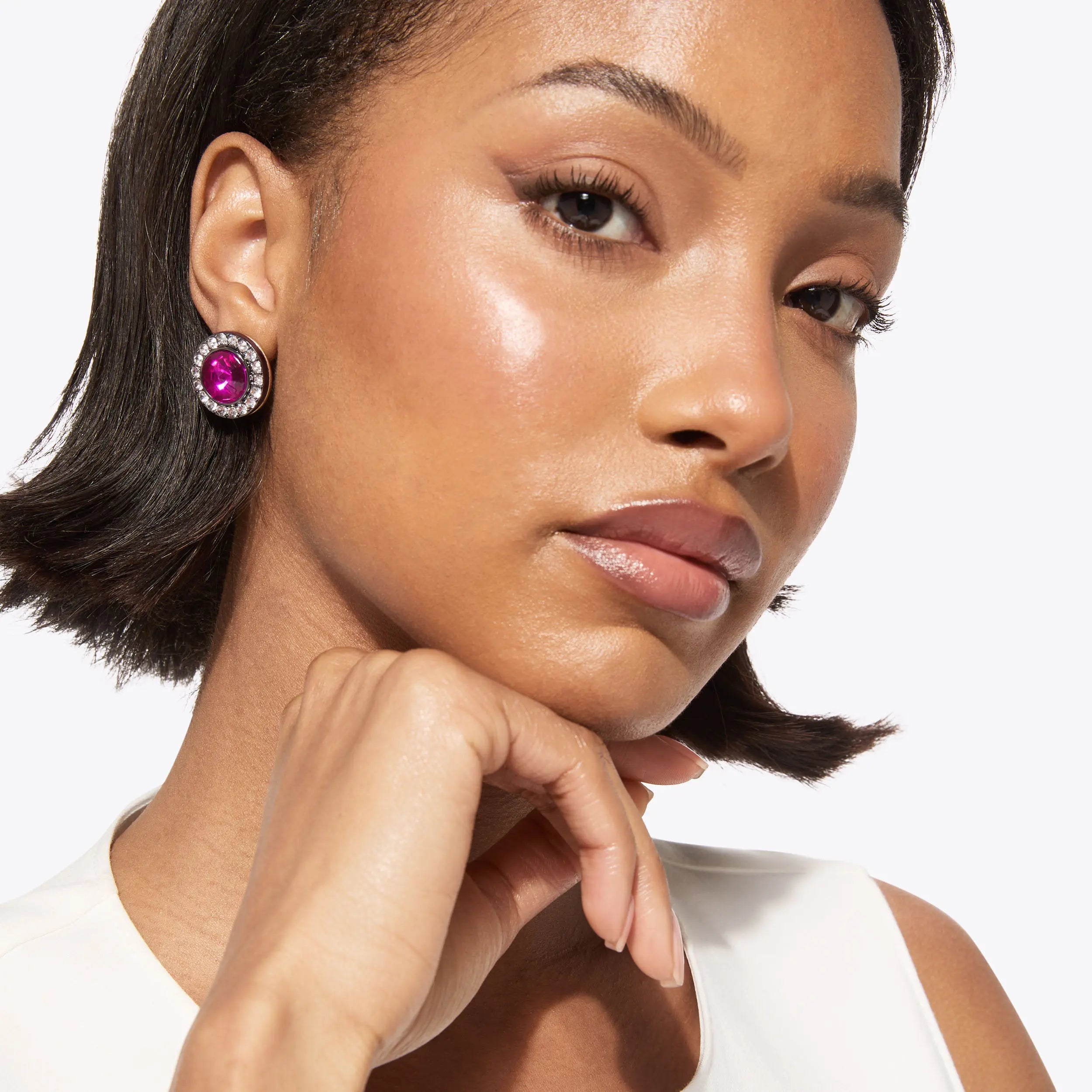 The Octavia Stud Earrings feature a pink crystal that is surrounded by small silver crystals.