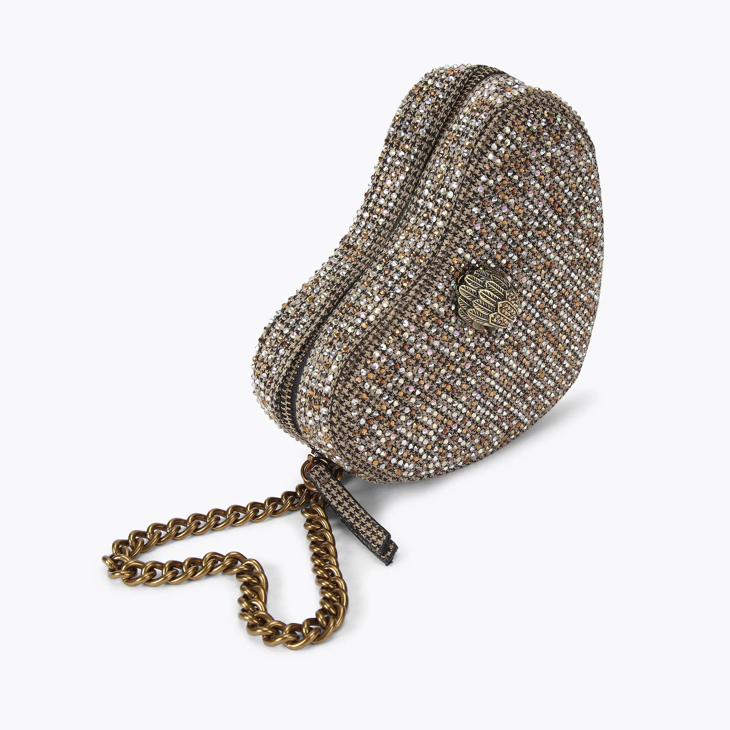 The Kensington Heart Purse is crafted from a beige houndstooth fabric which is embellished with crystals. The antiqued brass eagle head features crystals and black bead eyes on the front.