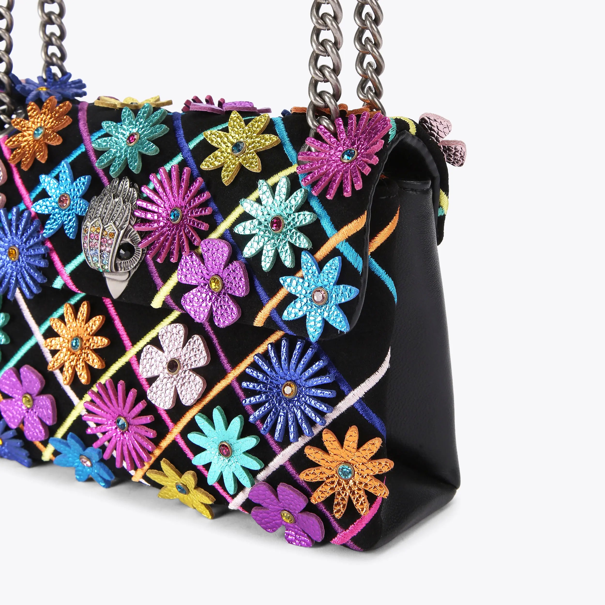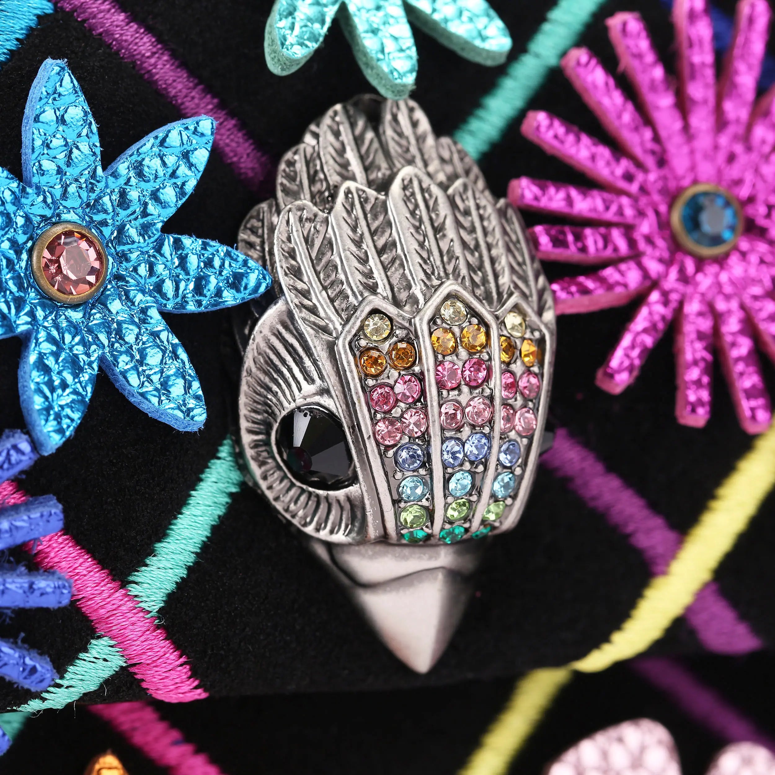 This Mini Kensington purse is crafted from a black suede with multi-colour diamond stitching each having a 3D leather flower motif.. The antiqued silver eagle head features crystals on the front flap.
