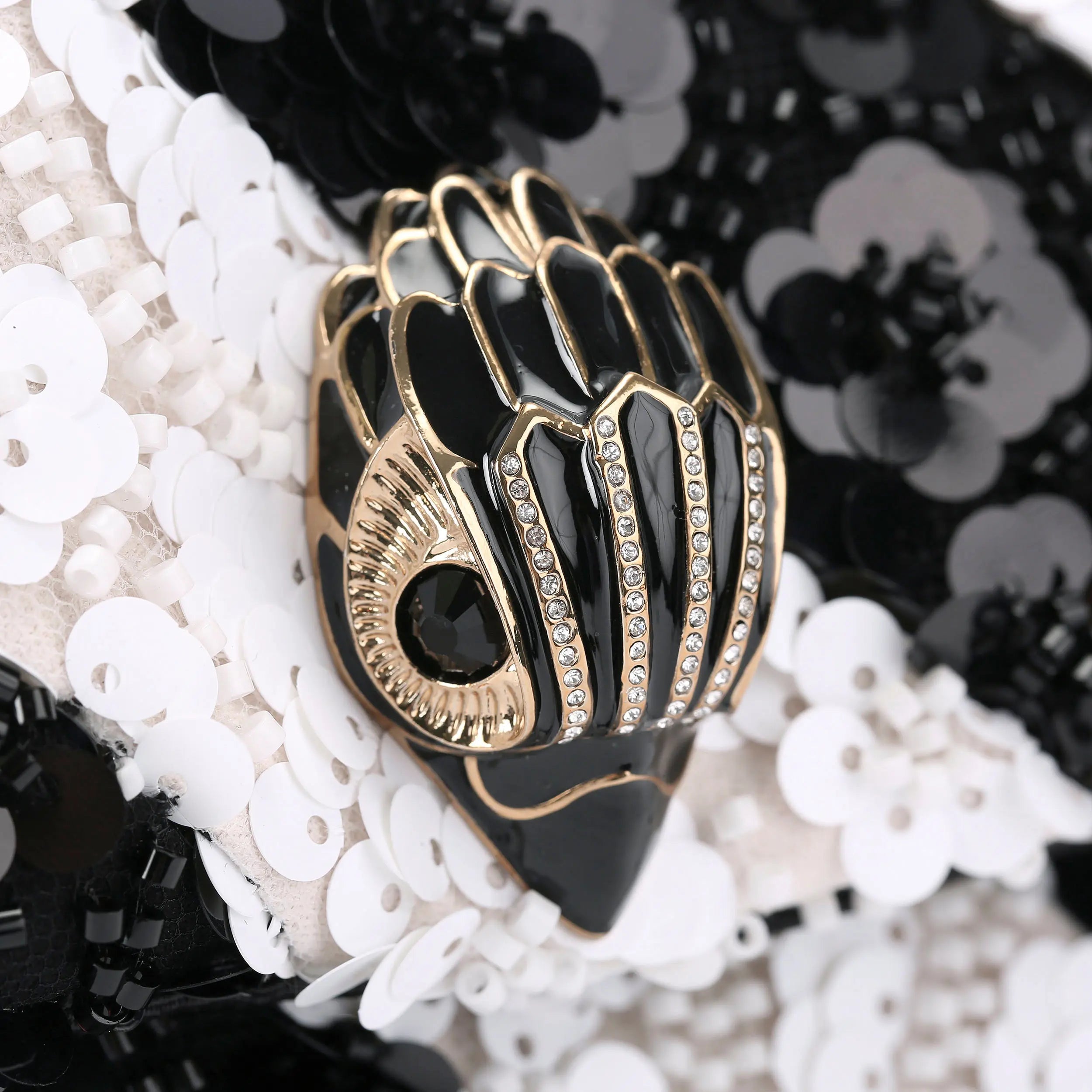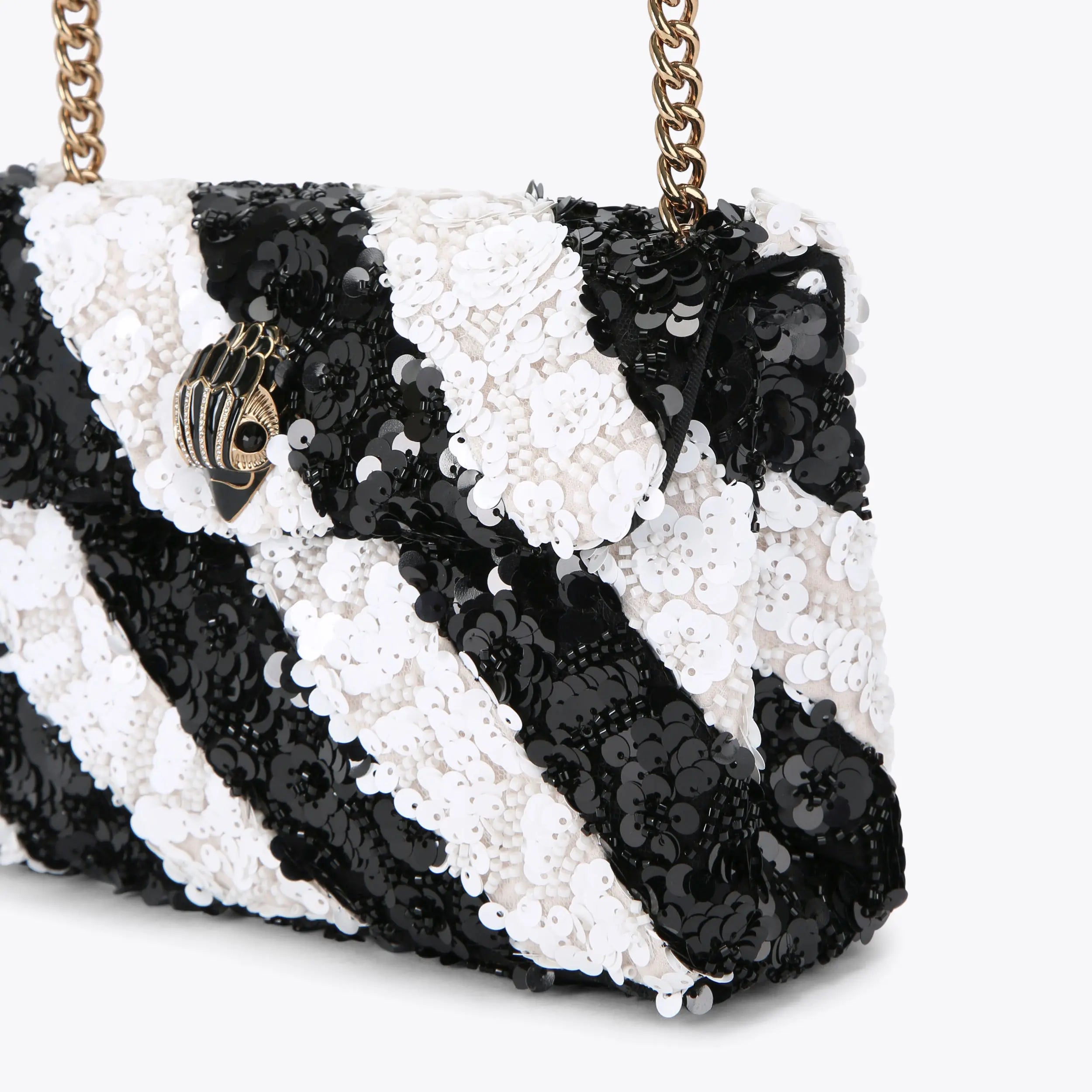 The Medium Soft Kensington bag is crafted from a black and white striped sequin embellished fabric. The black enamel gold metal eagle head sits on the front flap of the bag.
