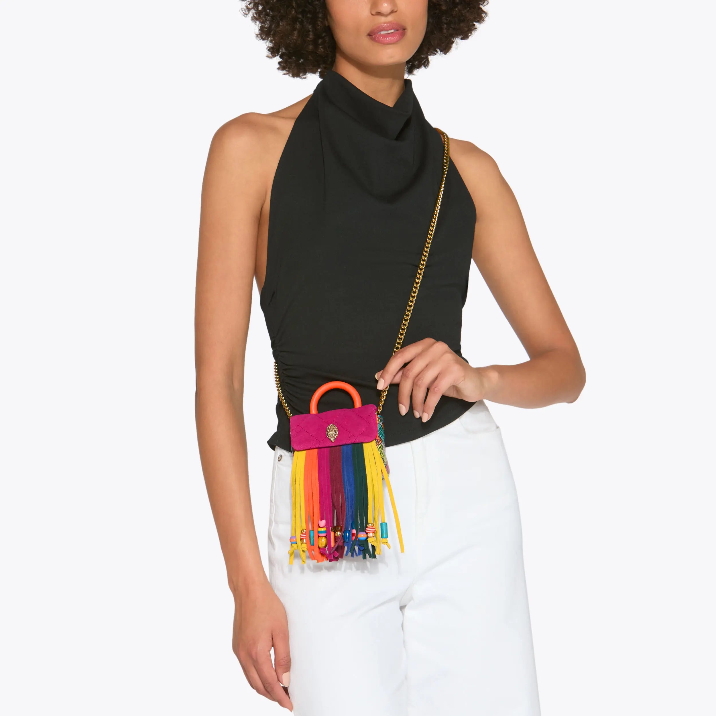 This Micro Handle Kensington Purse features a rainbow monogram canvas exterior. There are multiple suede tassels across the front of the bag which have different colour beads. There is a gold eagle head with crystals on the front flap.