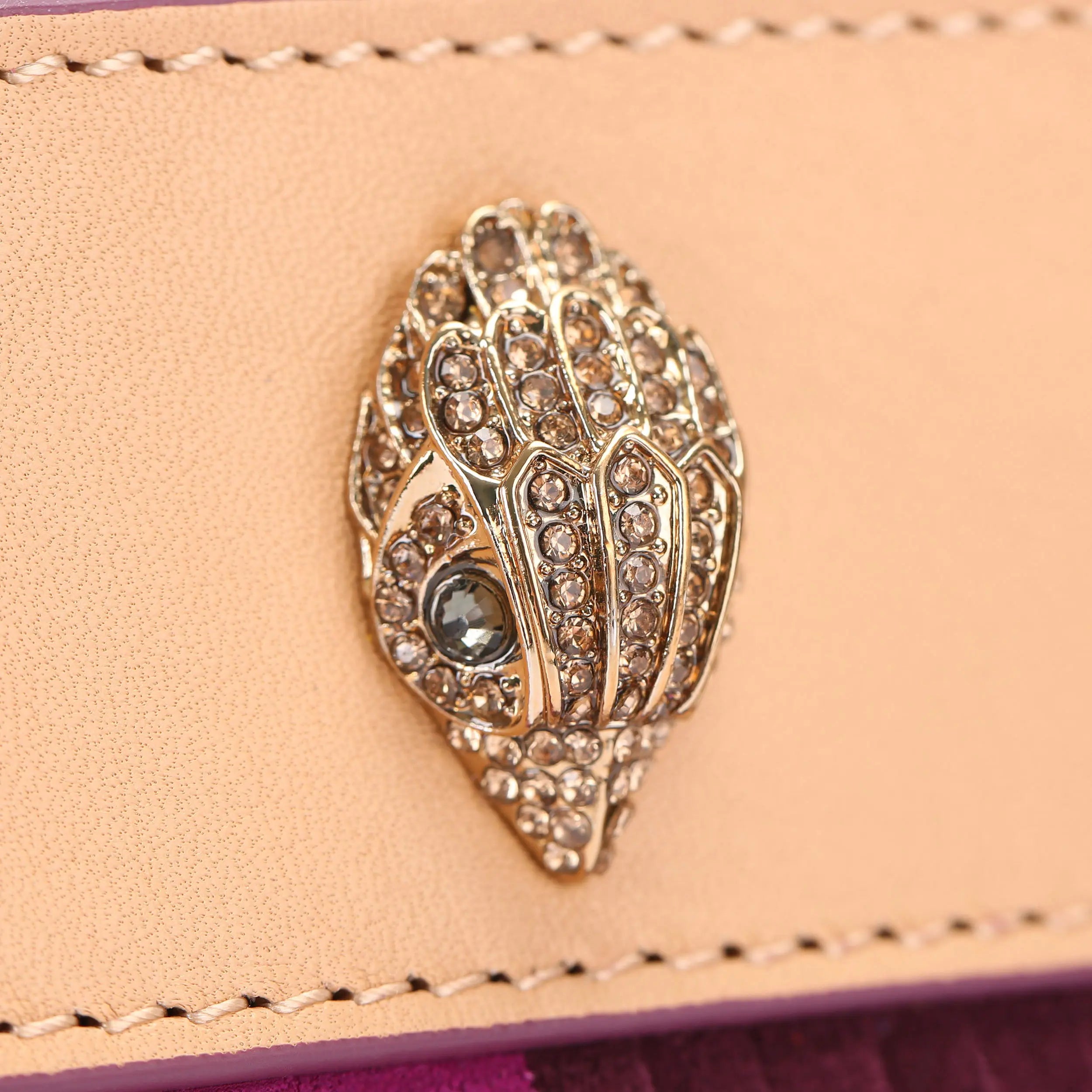 This Square Kensington Fringe bag is made from a patent leather in black with black suede fringing around the sides. There is a gold eagle head which sits on the front.