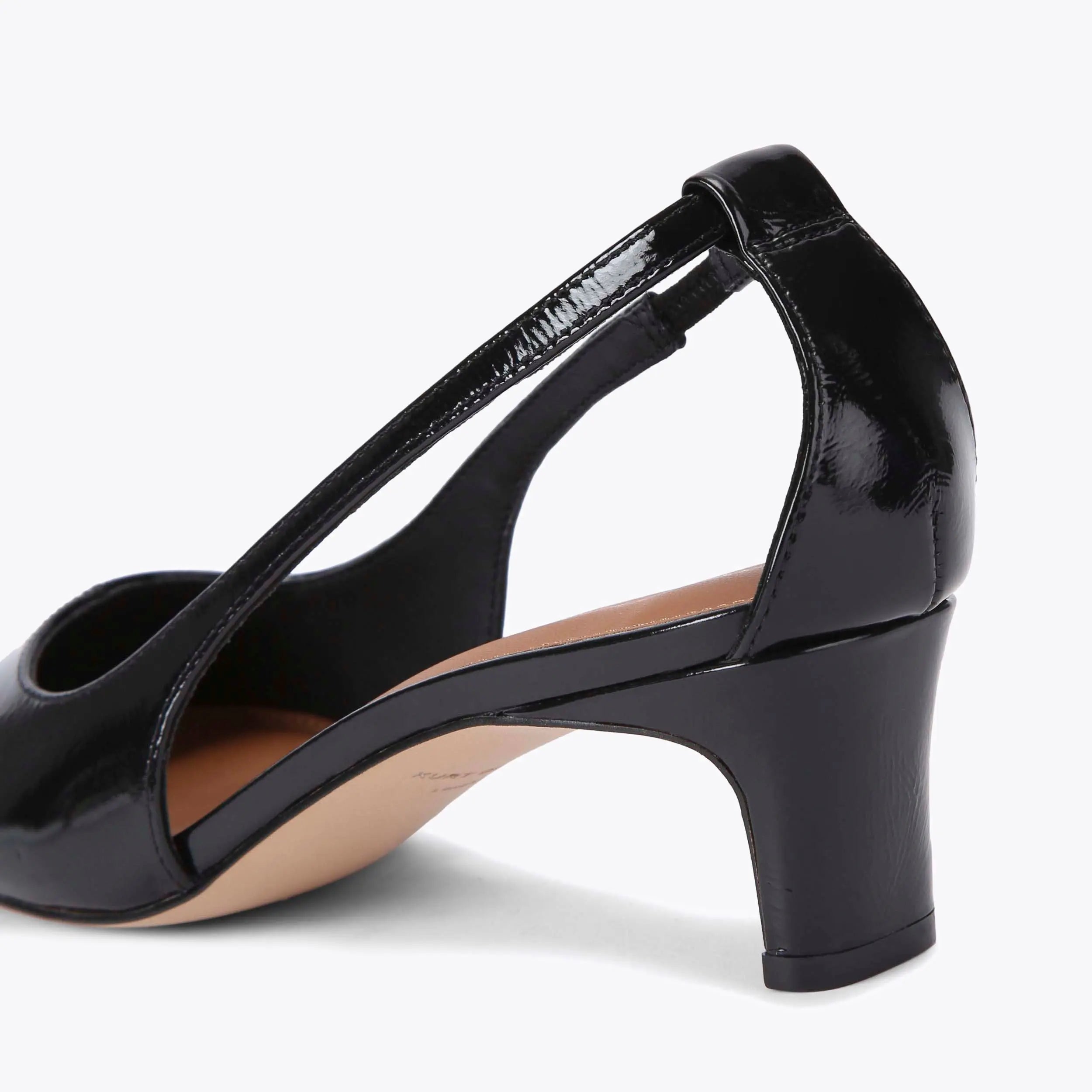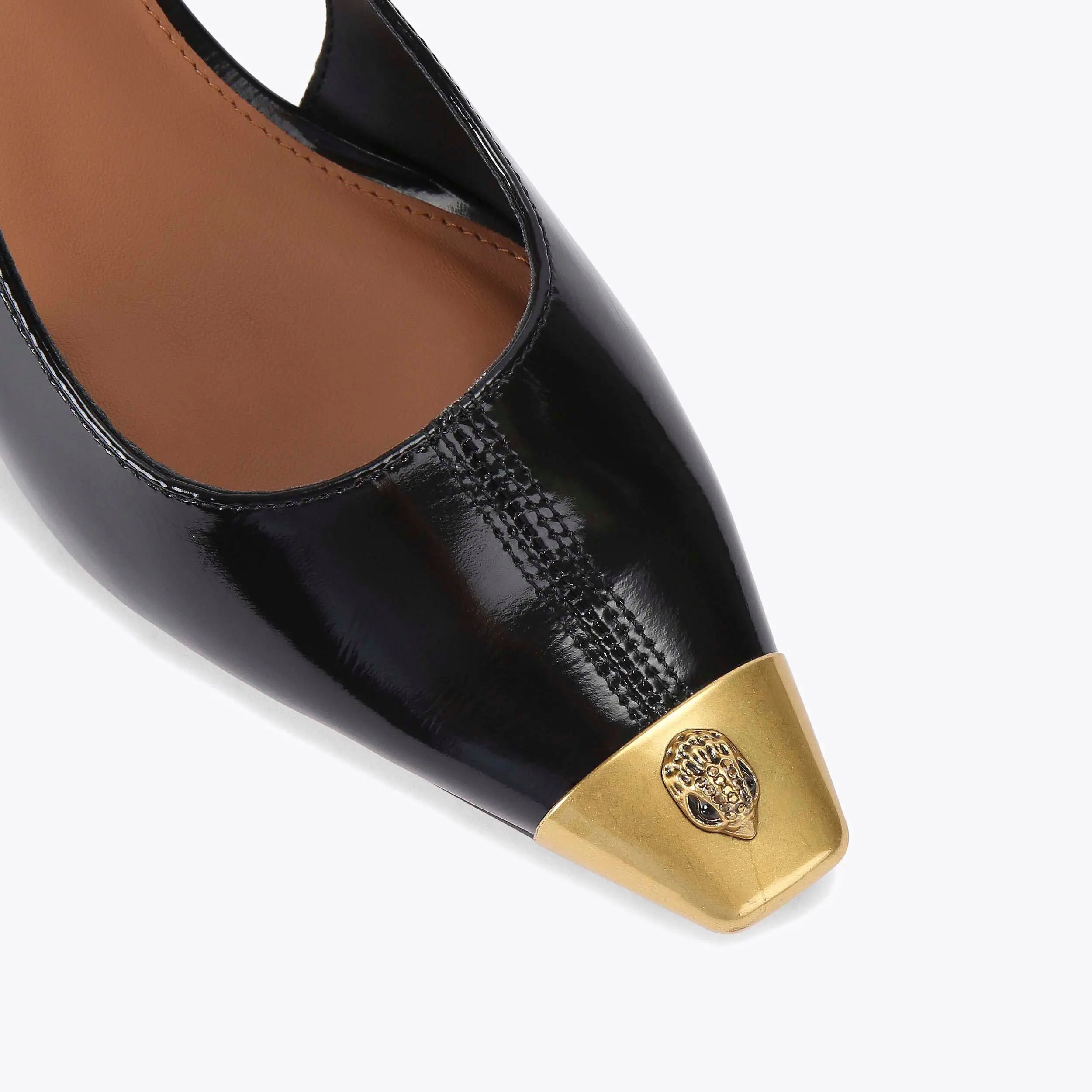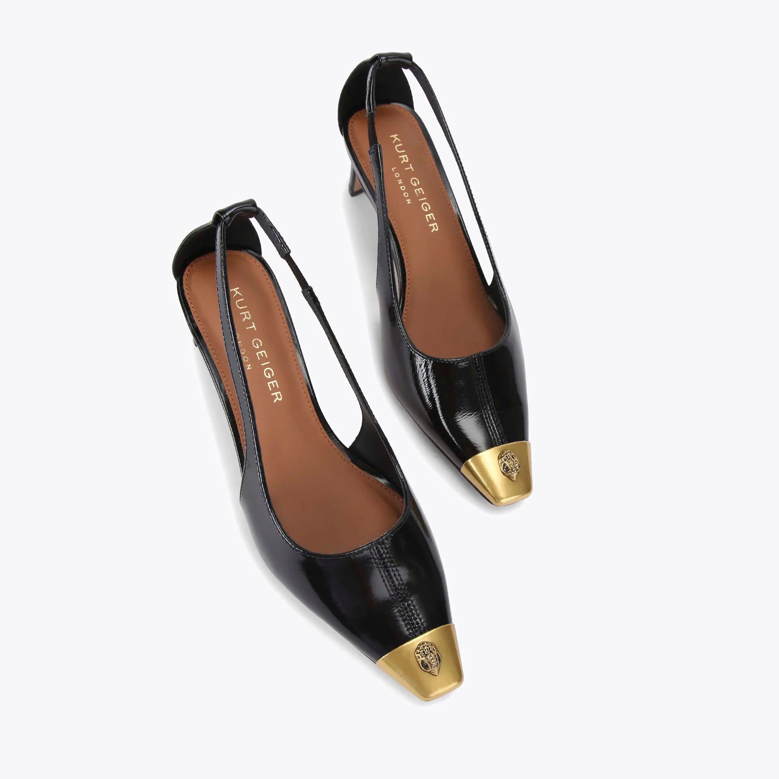This Regent Open Court heel features a patent black upper with antiqued brass toe cap. There is an antiqued brass head with crystals and beaded eyes sat on top of the toe.