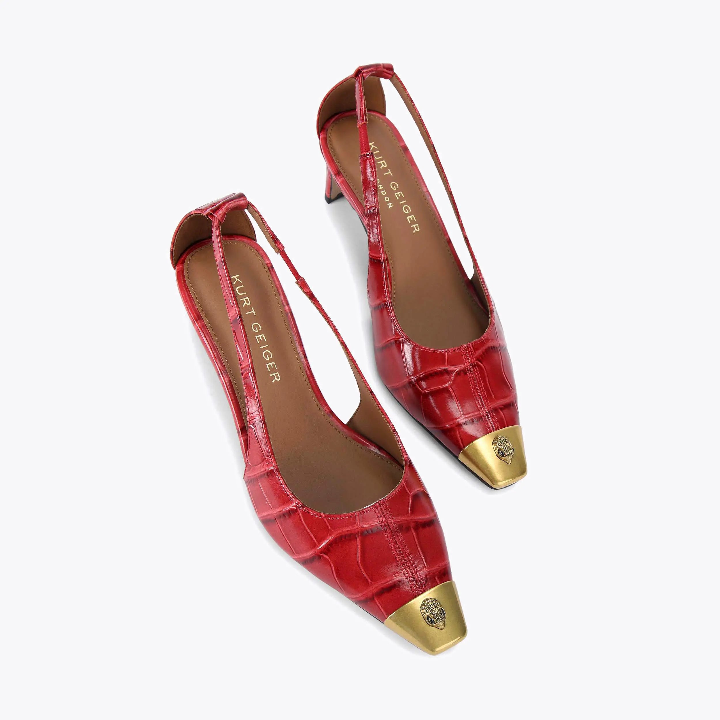 This Regent Open Court heel features a croc embossed leather upper with antiqued brass toe cap. There is an antiqued brass head with crystals and beaded eyes sat on top of the toe.
