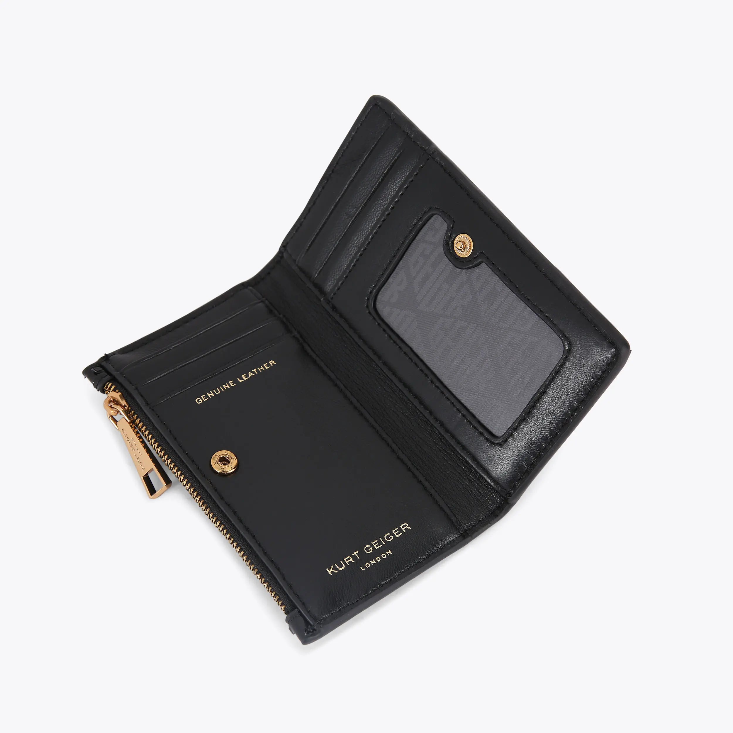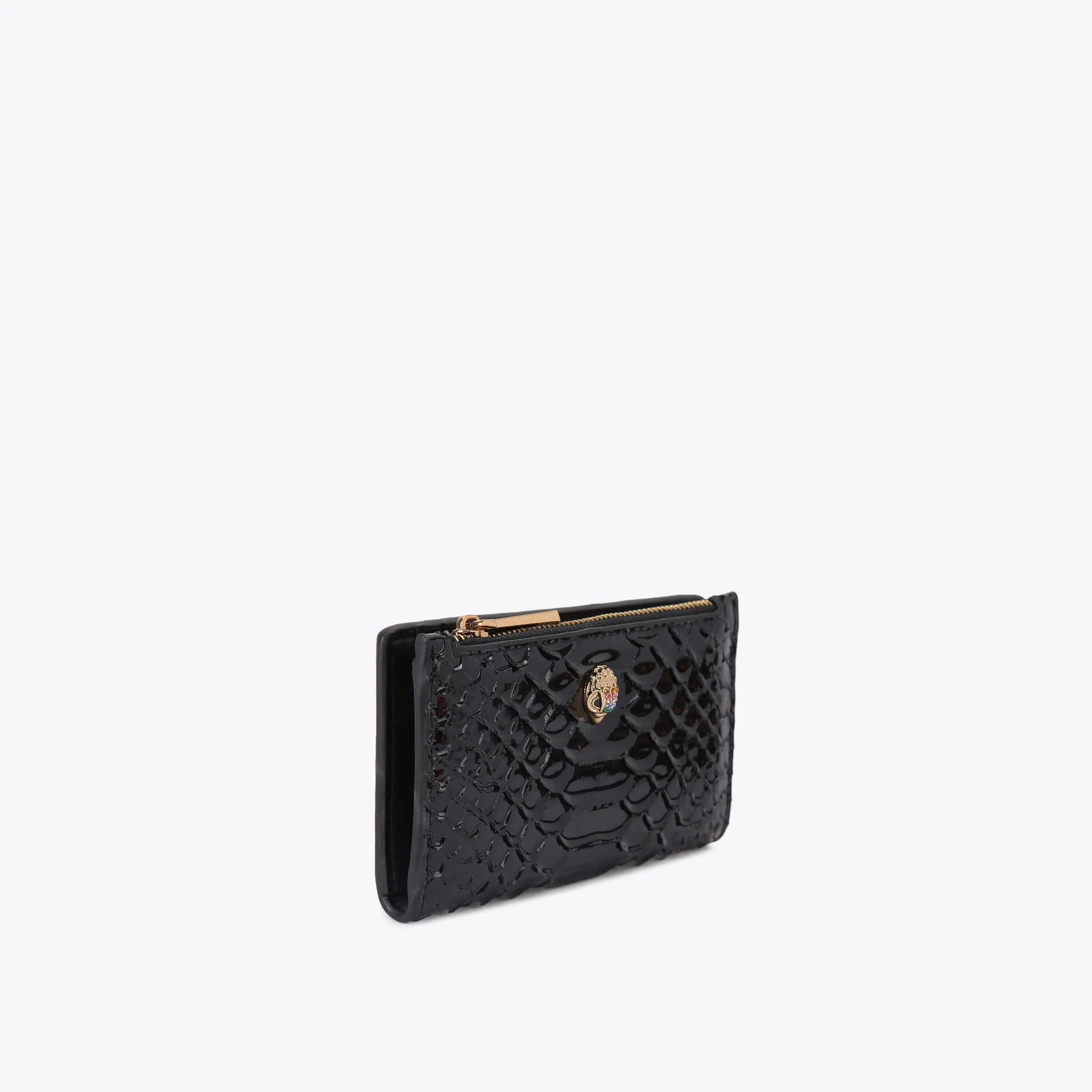 This Kensington Bifold Wallet is crafted from a black 3D snake embossed leather. There is a gold eagle head on the front and a zipped pocket at the top.