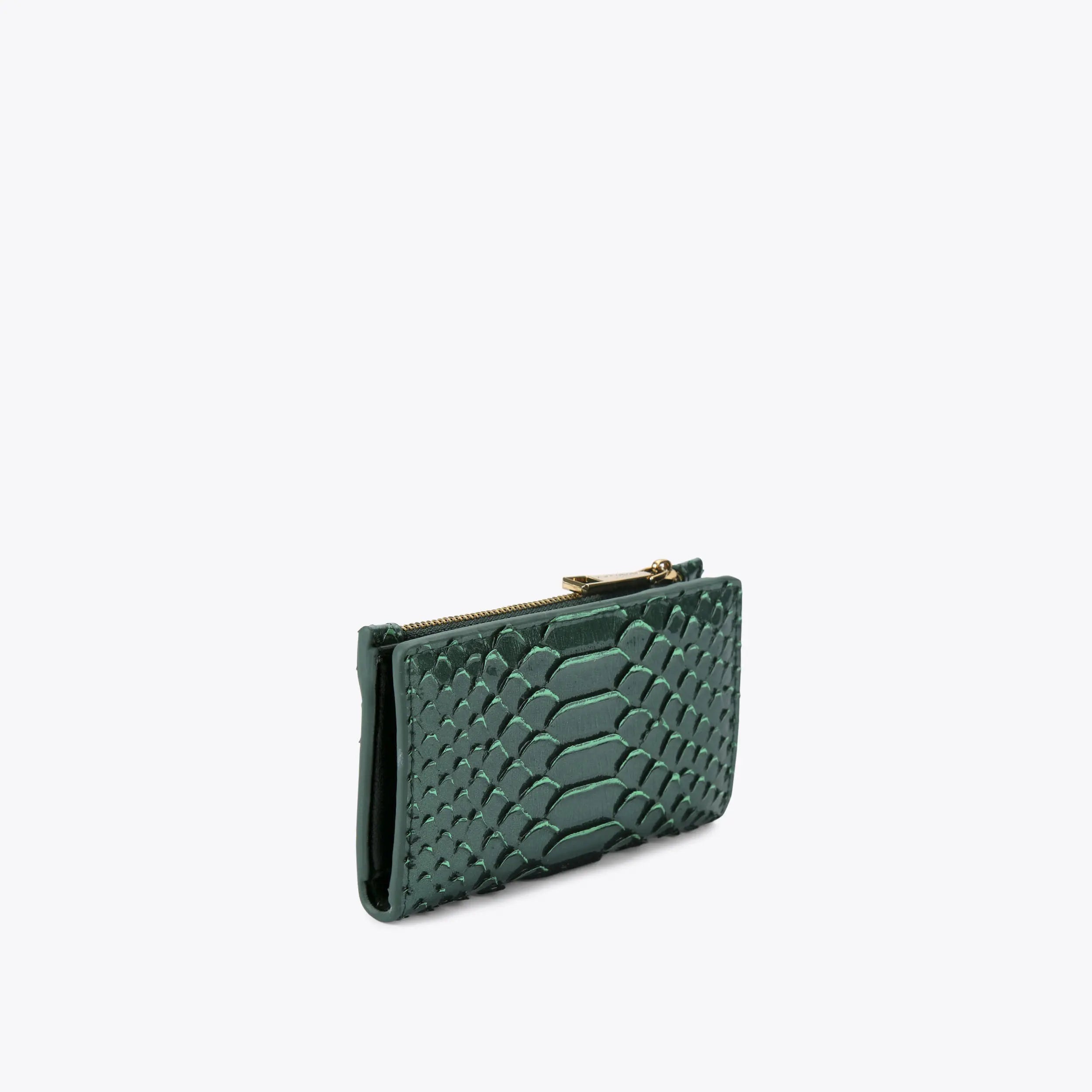 This Kensington Bifold Wallet is crafted from a 3D embossed metallic leather with overstitch quilting design. There is a gold eagle head on the front and a zipped pocket at the top.