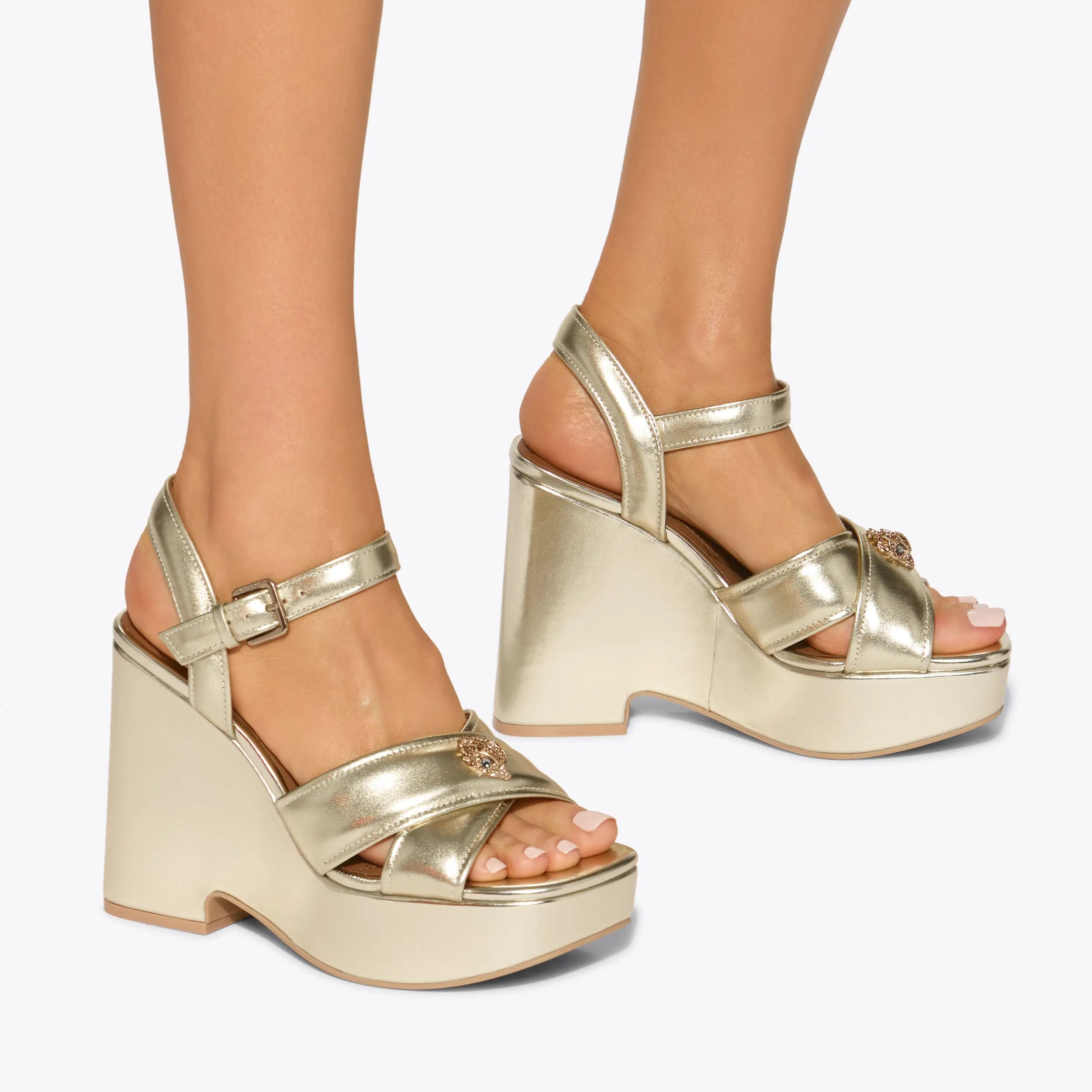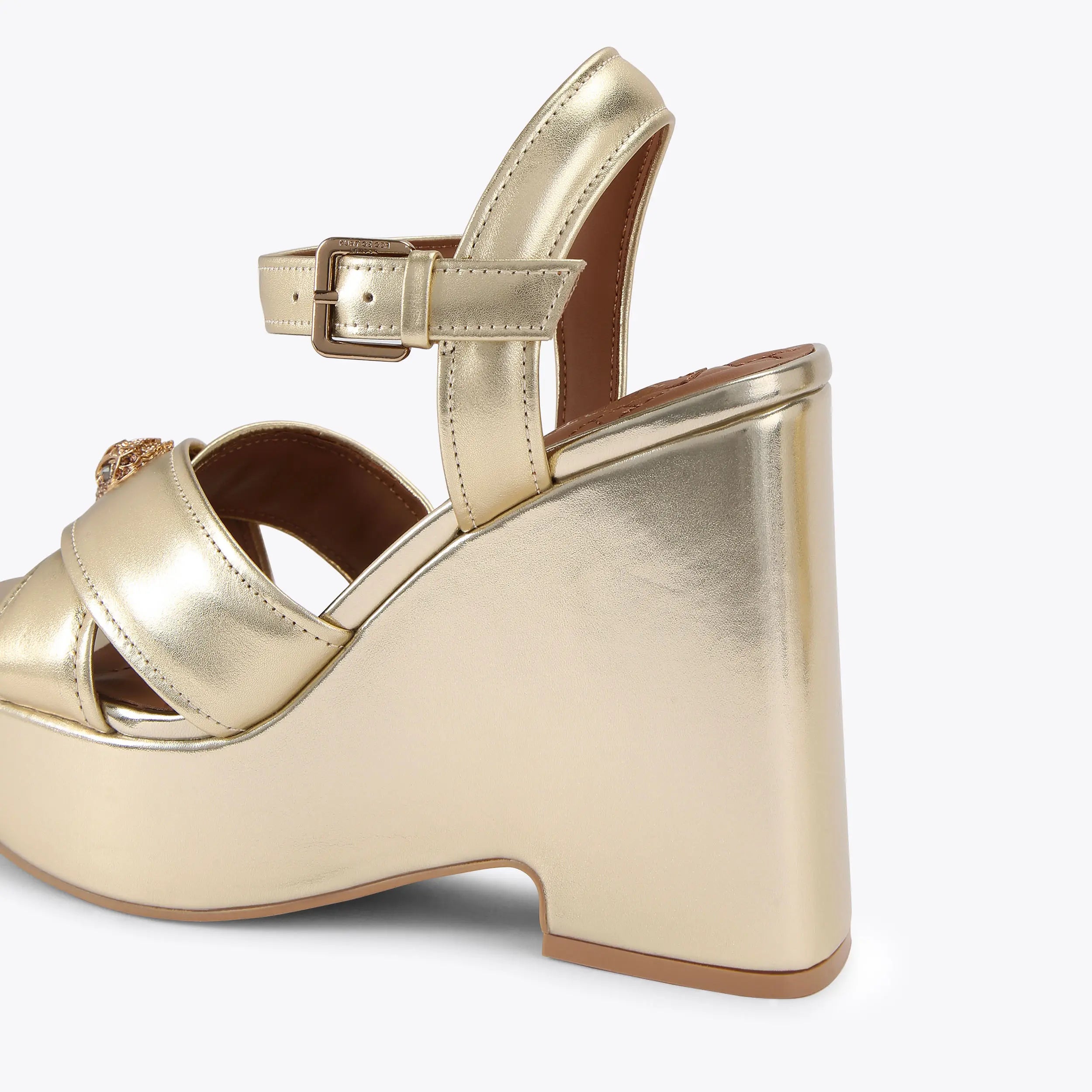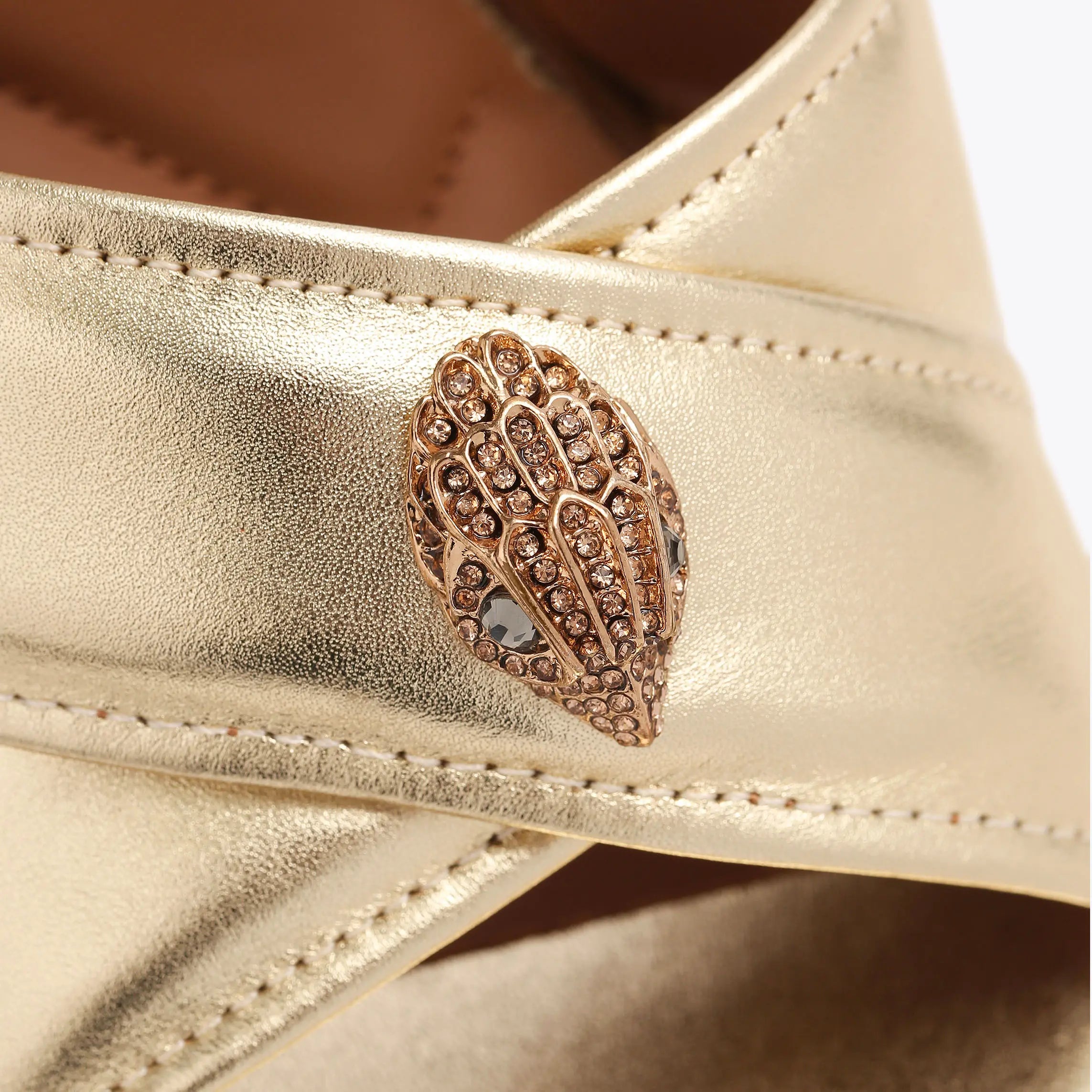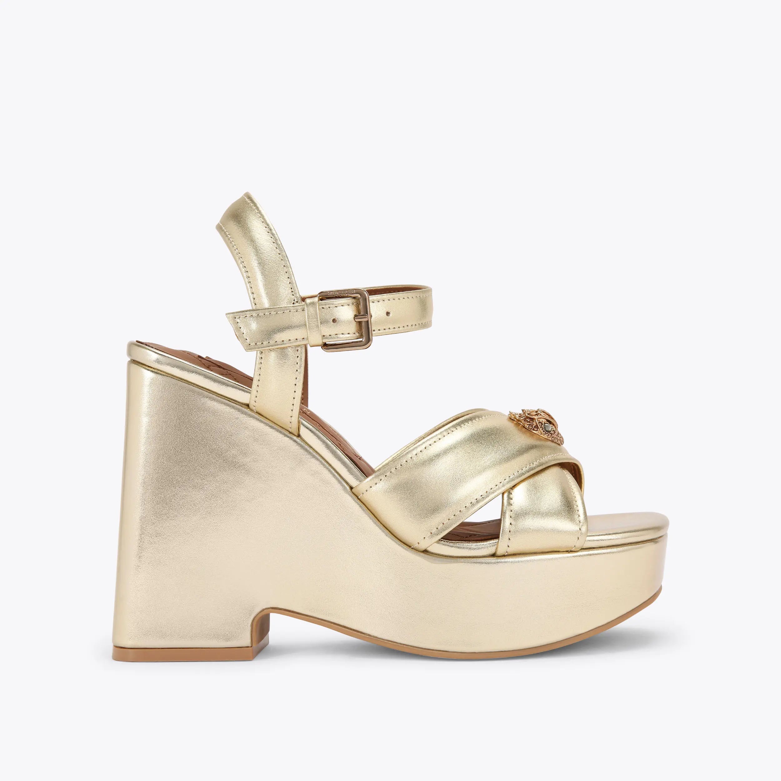 This pair of Kensington Cross Wedge Heels feature a metallic gold leather upper with two crossed straps over the toes. The heel is in a wedge style with platform at the toe.