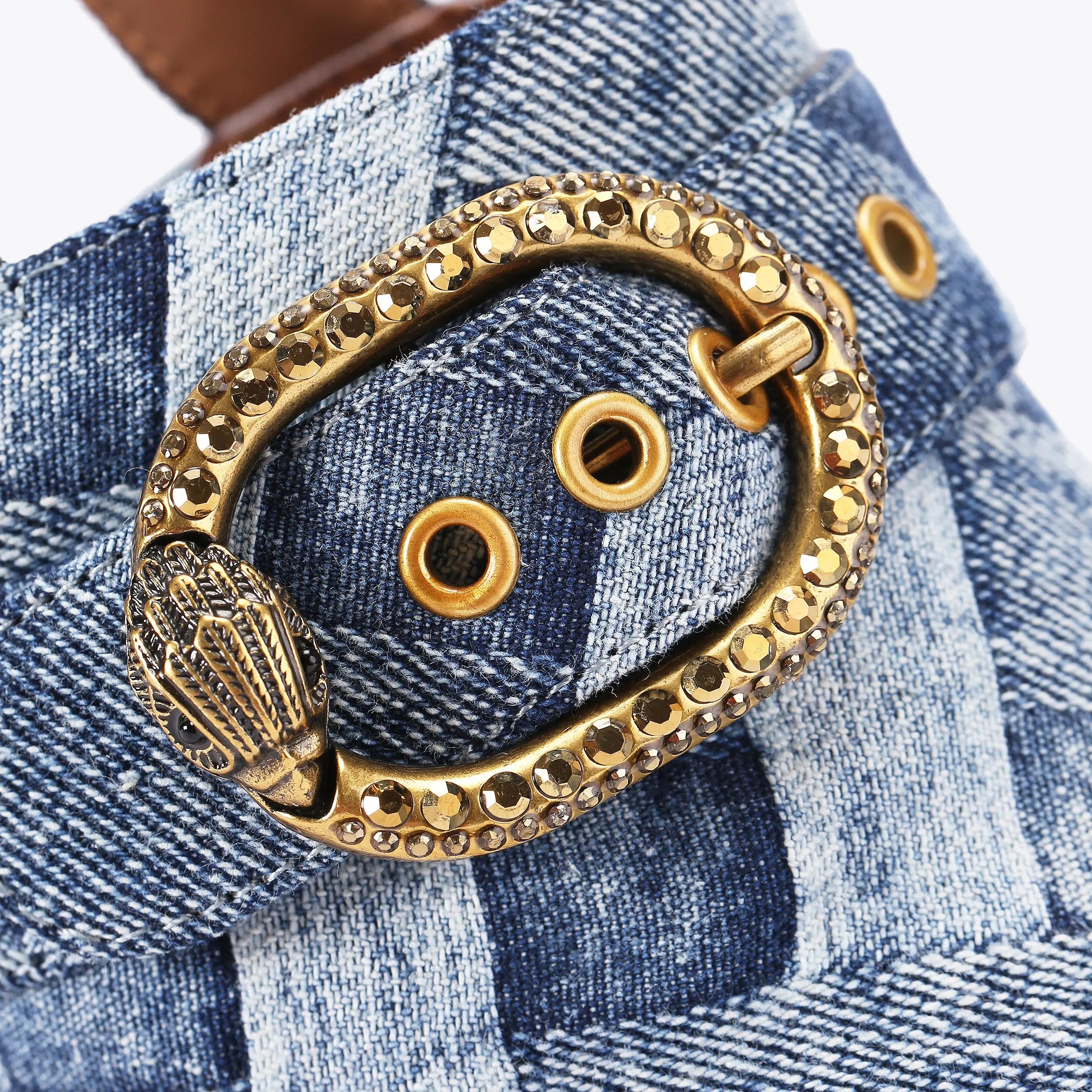 This Mayfair Clog Slingback heel is crafted from a bleached weave denim fabric with rounded toe. There is an antiqued brass oval trim buckle with eagle head across the front.