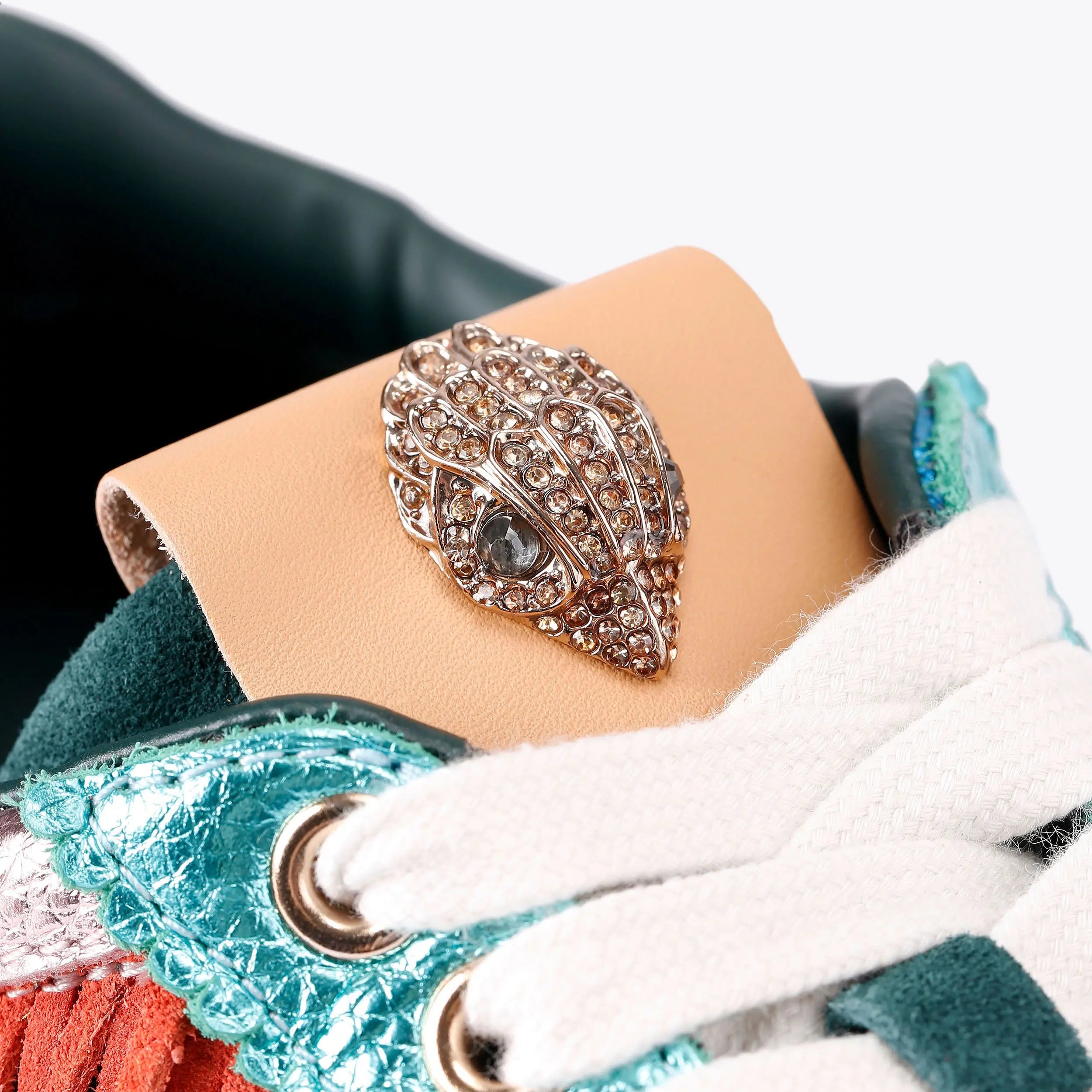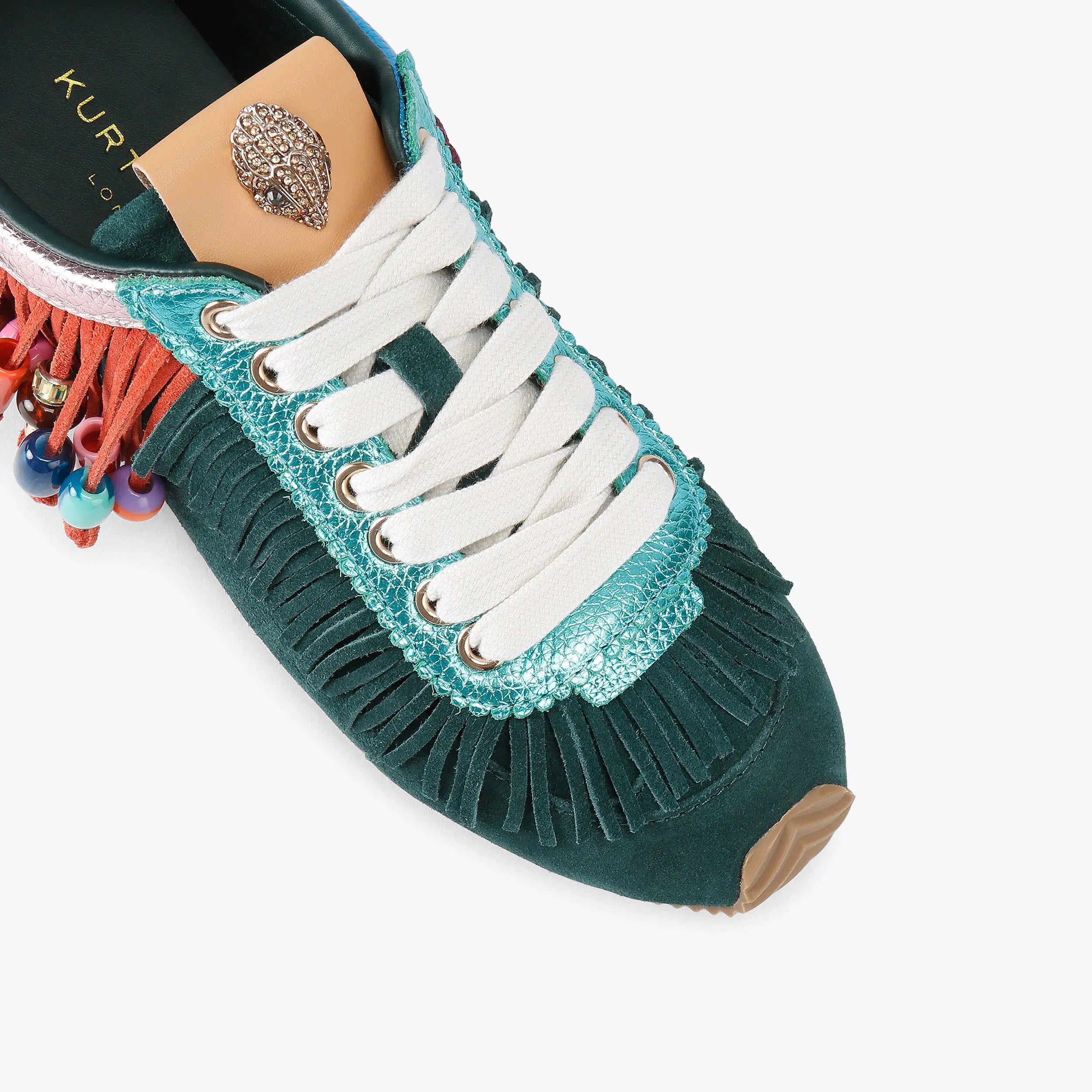 This Islington Beaded Tassel Sneaker is crafted from a dark green suede leather with tassel design across the upper. There are multiple tassels around the ankle with beaded details. There is a gold eagle head with crystals sat on the tongue.