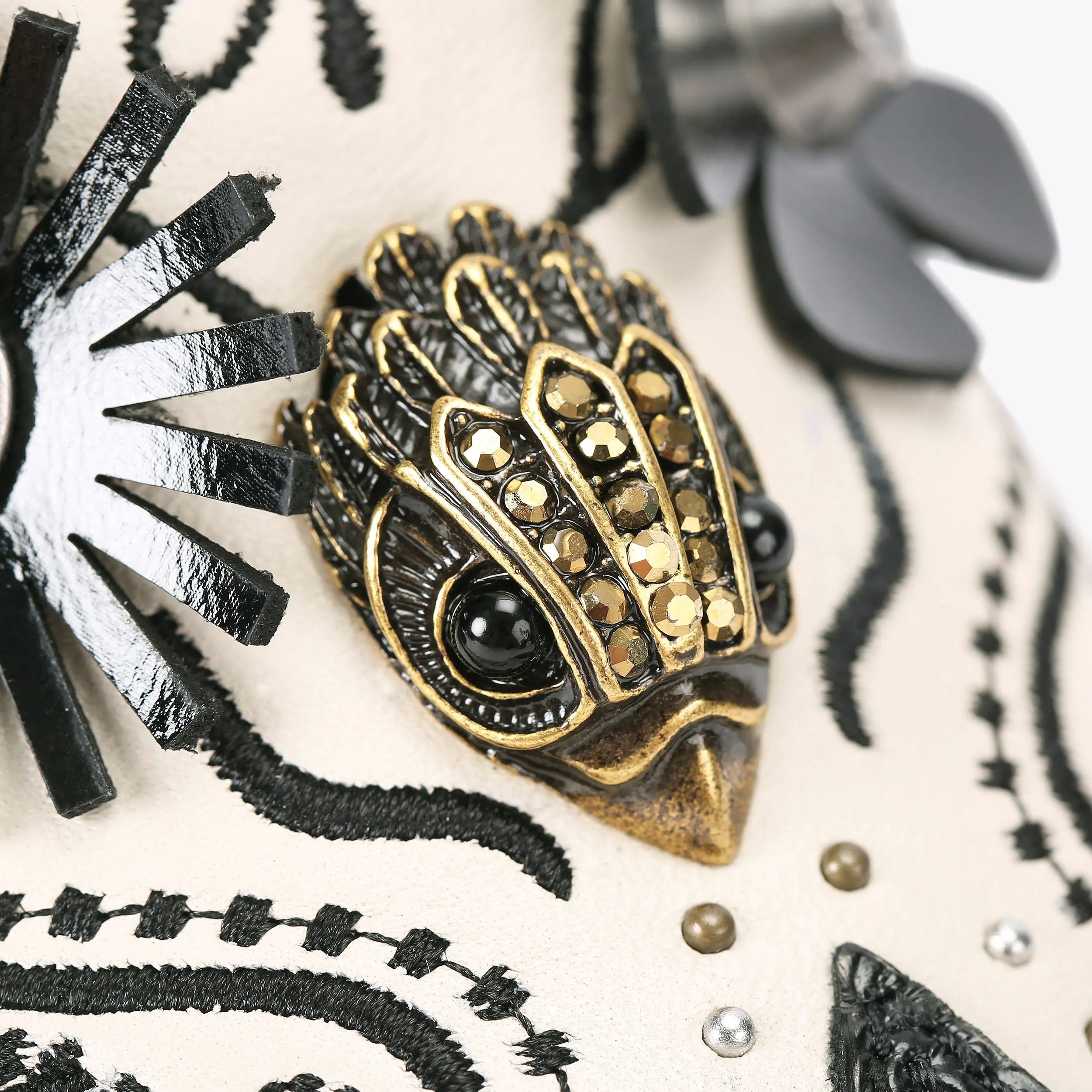 This Flower Western Mule shoe arrives in a white leather with black embroidered paisley design. There are 3D cut out flowers across the toe alongside an antiqued brass eagle head.