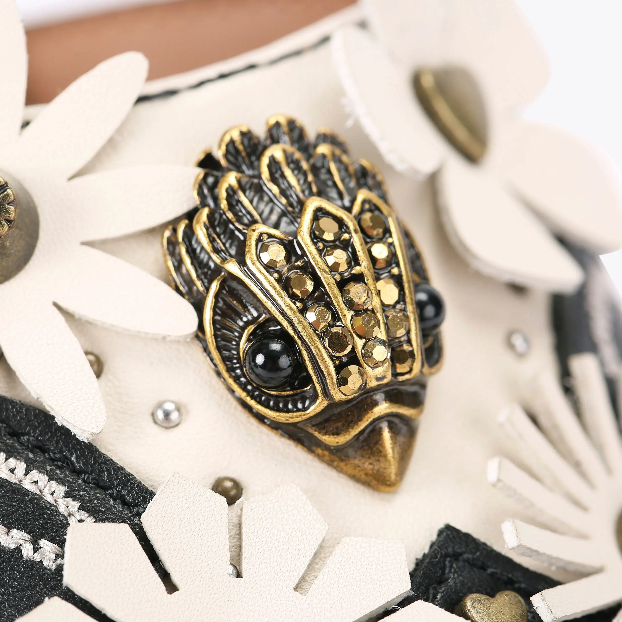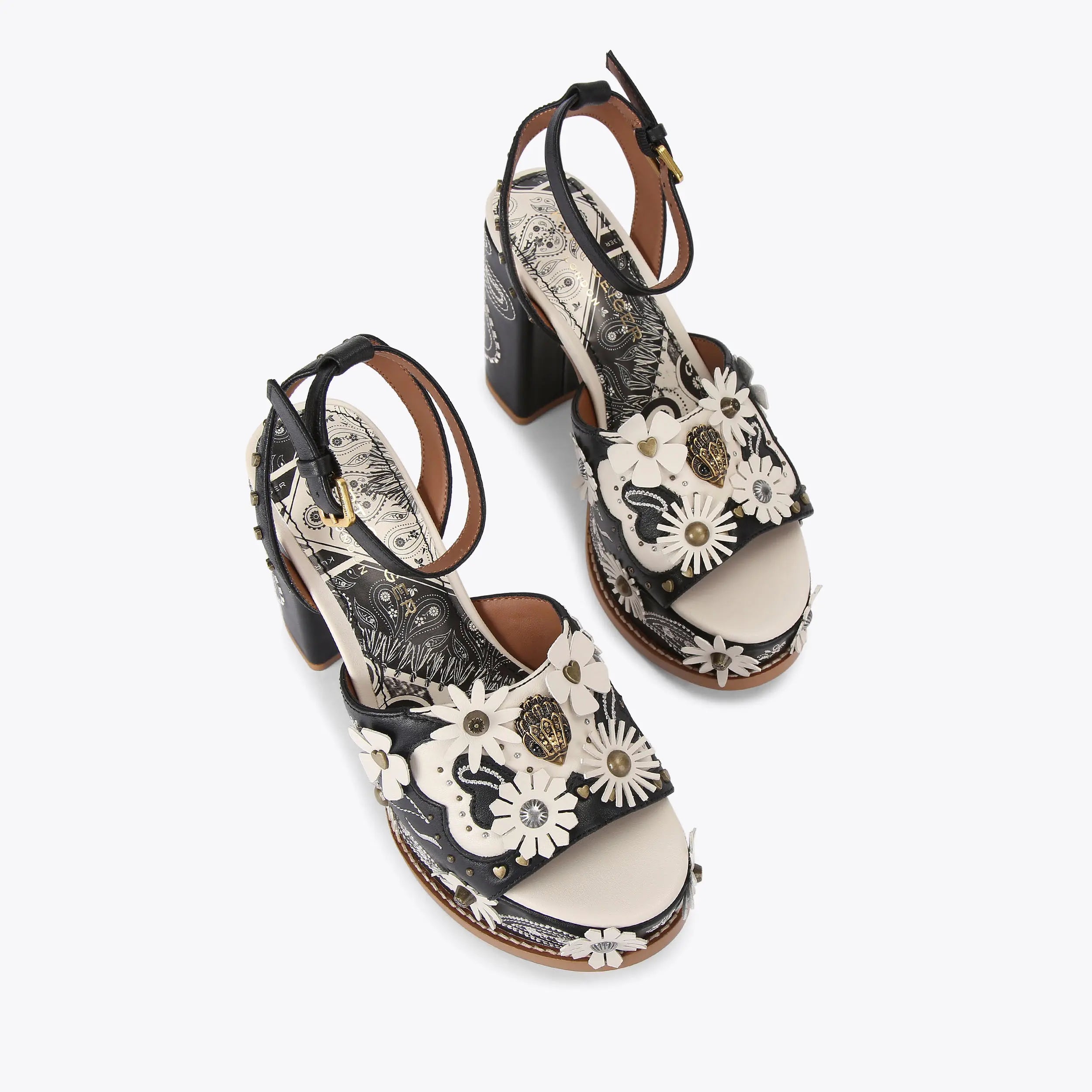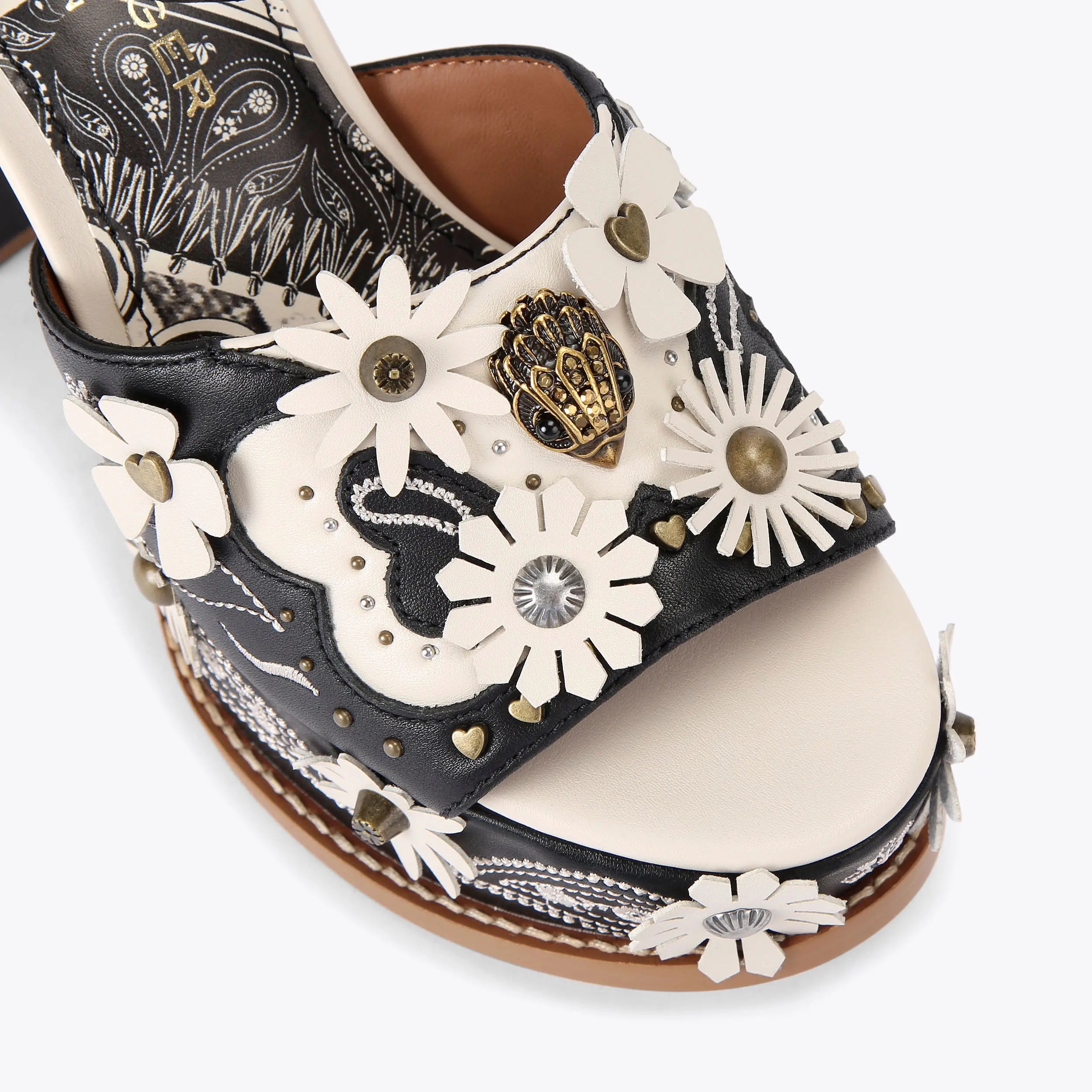 This Flower Western Platform heel is crafted from black and white leather with paisley embroidered design. There are 3D flowers across the upper with antiqued metal stud centres.