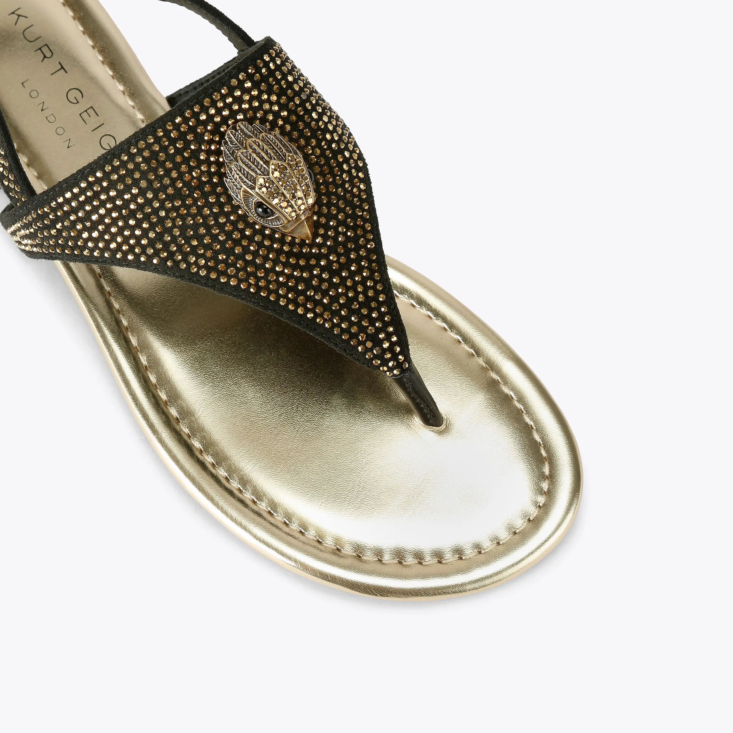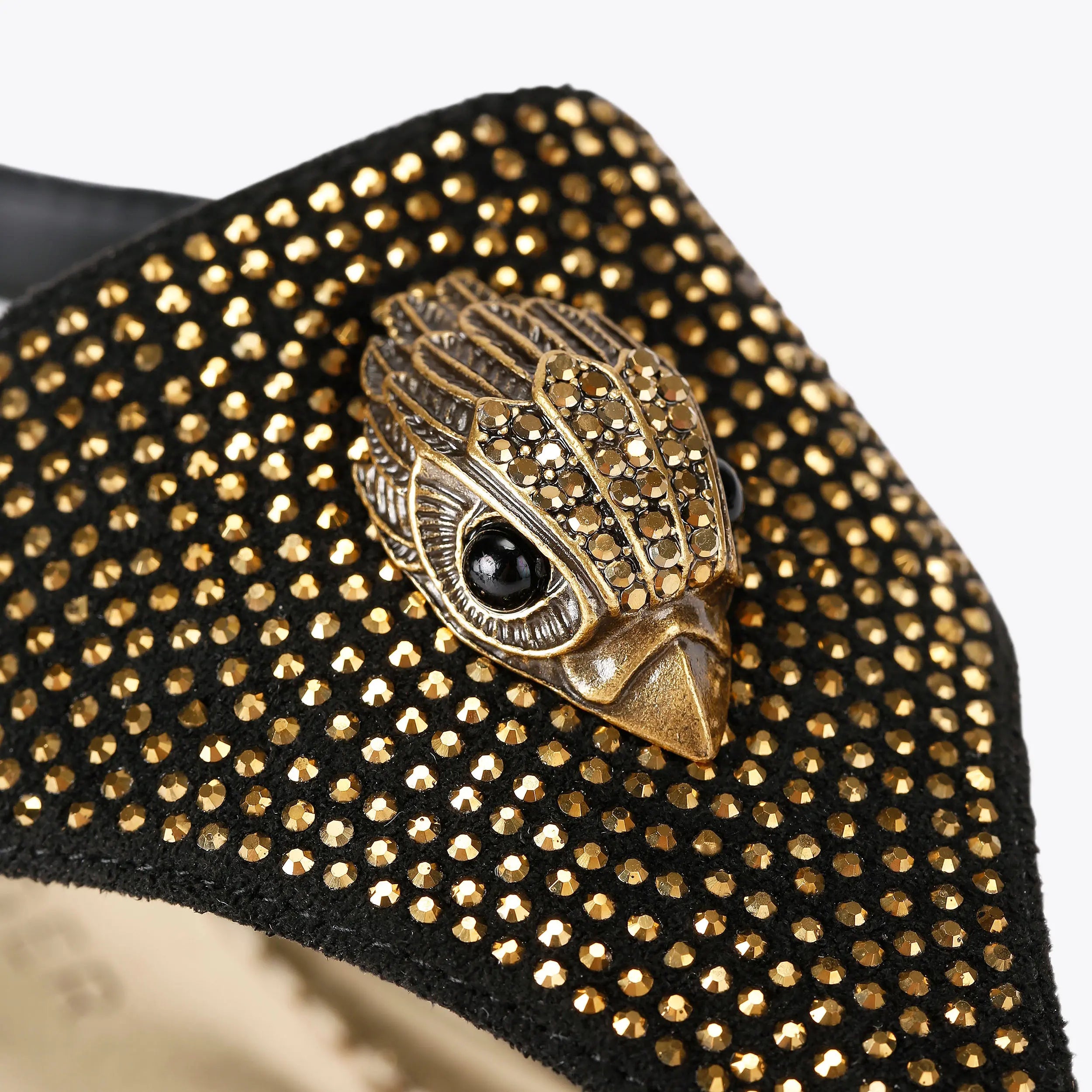 This pair of Kensington Flat Slingback is crafted from a black microsuede which is embellished with gold crystals. There is an antiqued brass eagle head on the top of the toe post.
