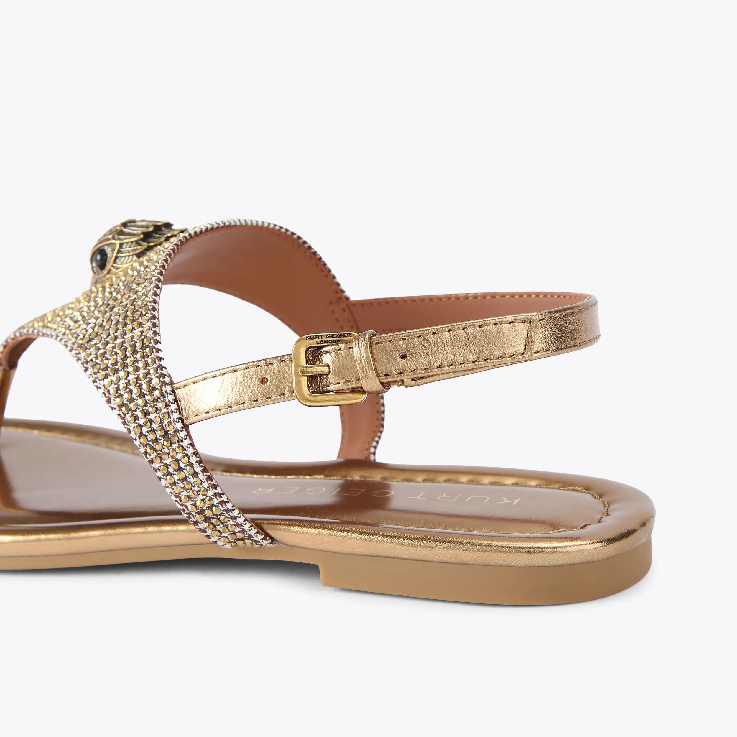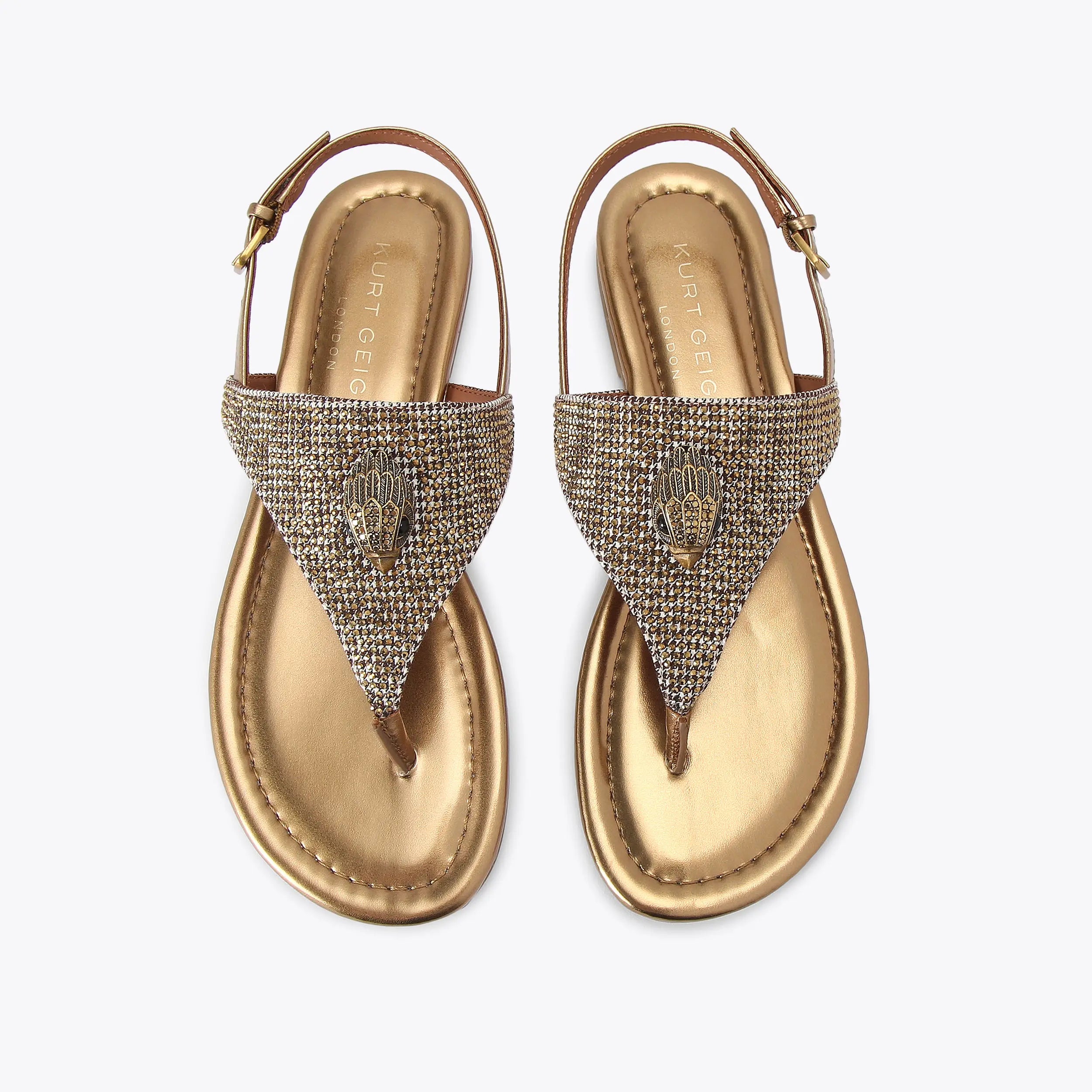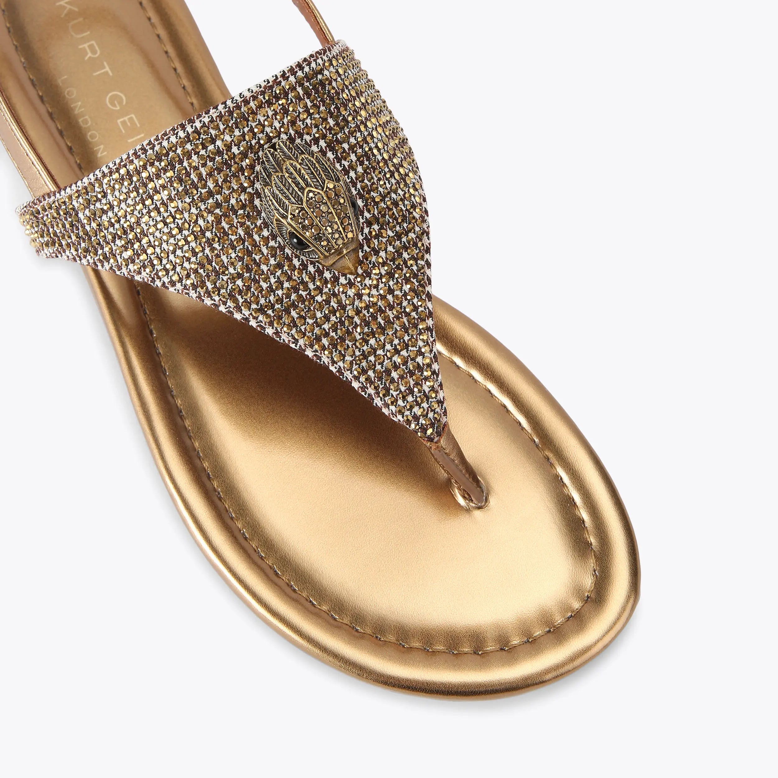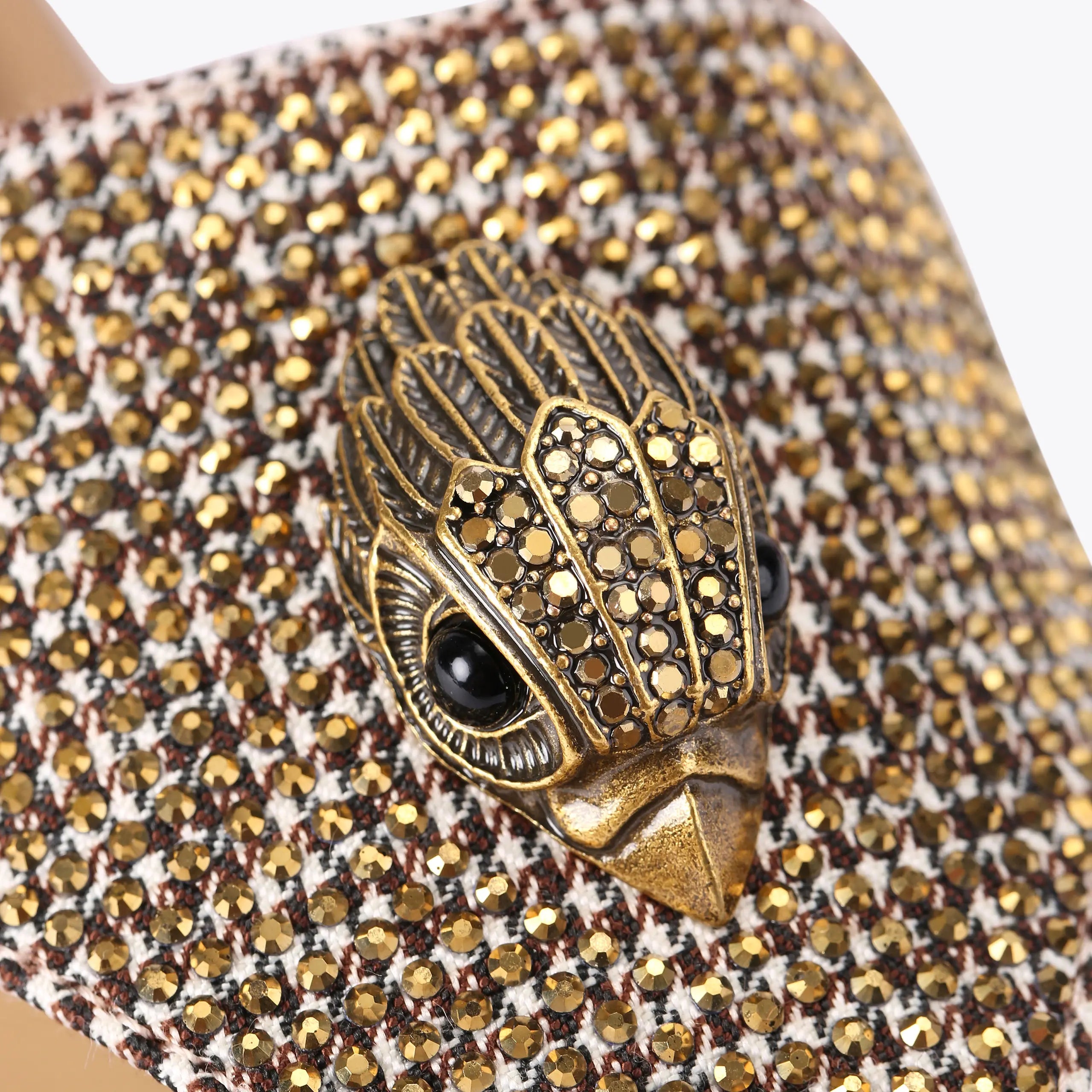 This Kensington Flat Slingback sandal is crafted from a beige houndstooth fabric which is embellished with gold crystals. There is an antiqued brass eagle head on the strap.