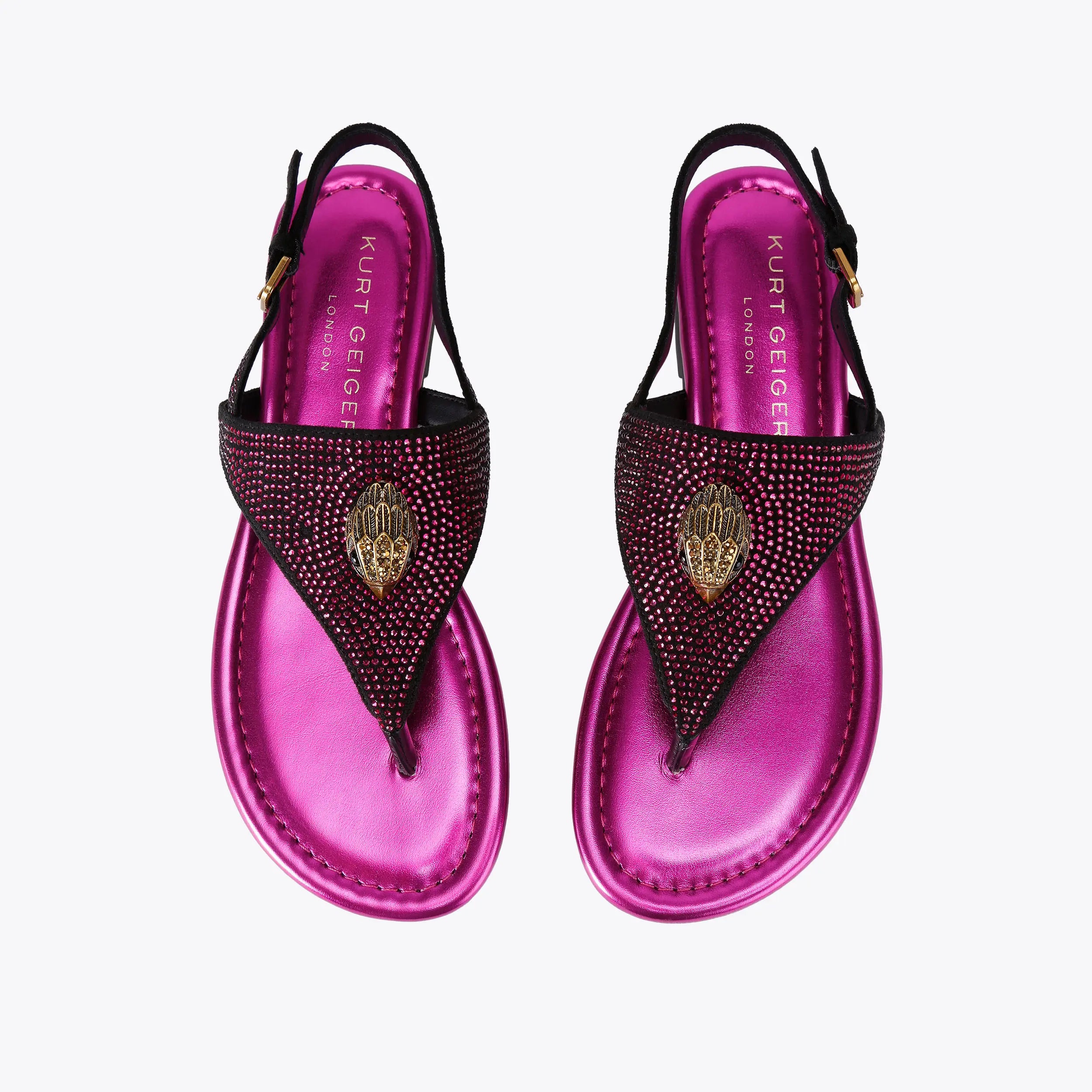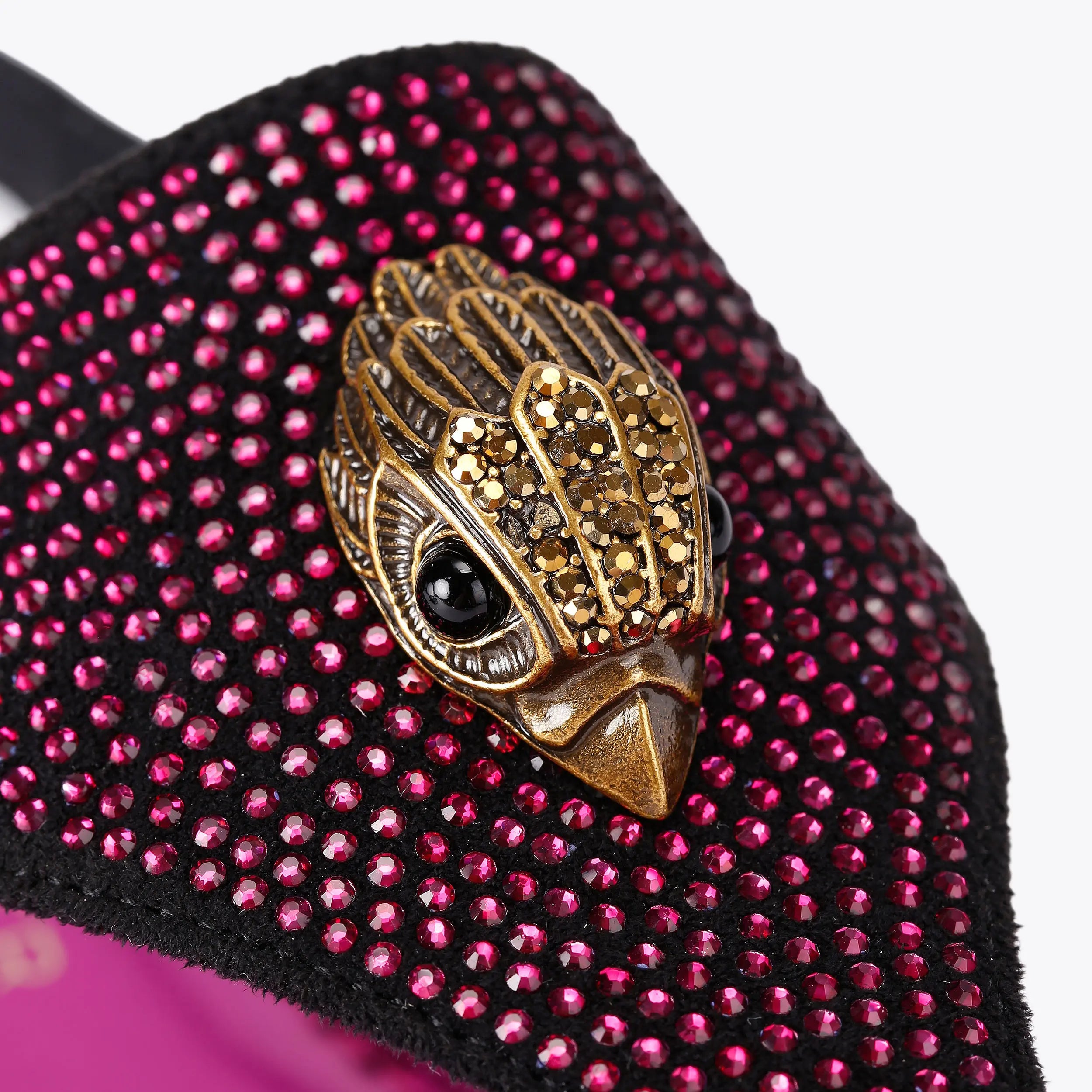 This pair of Kensington Flat Slingback is crafted from a black microsuede which is embellished with pink crystals. There is an antiqued brass eagle head on the top of the toe post.