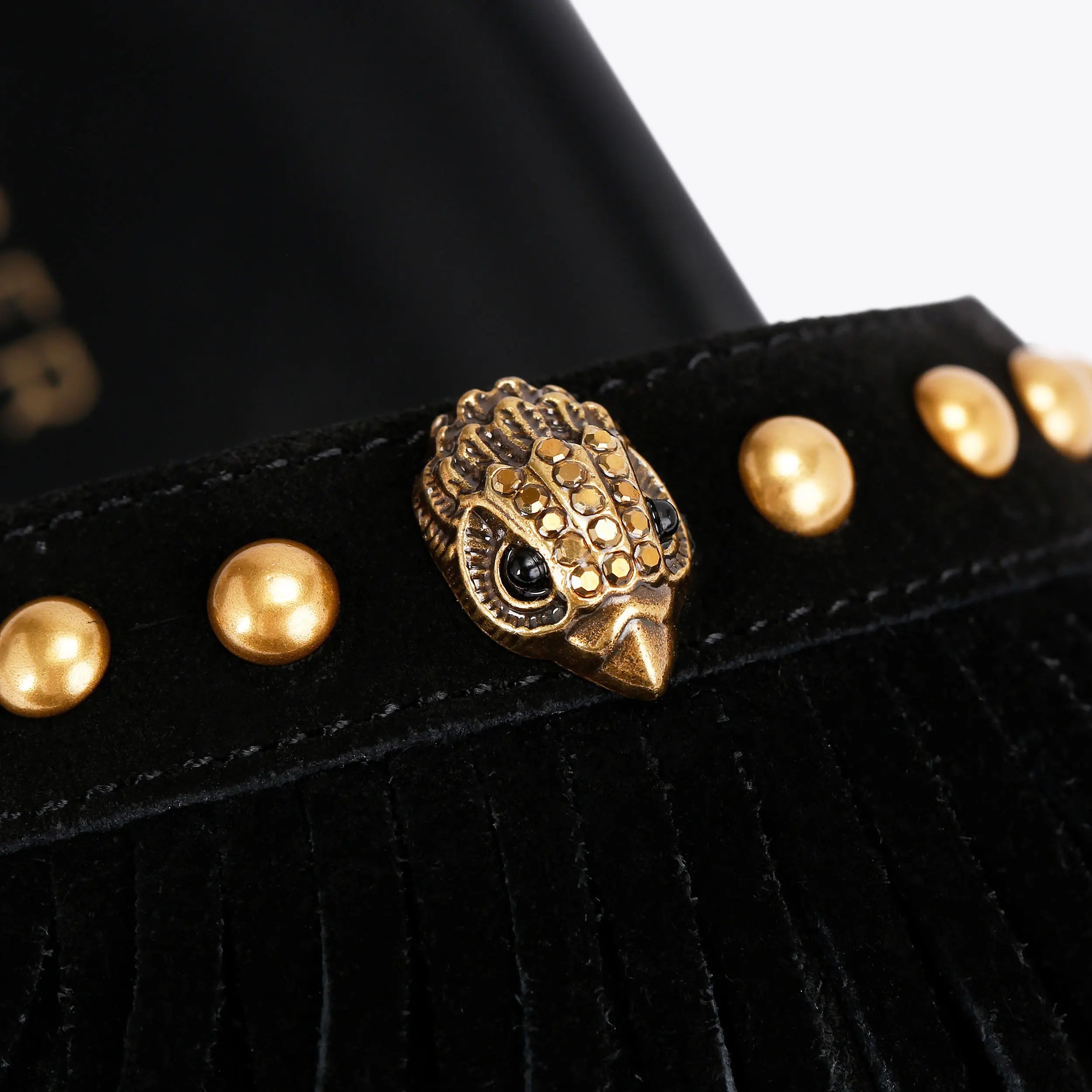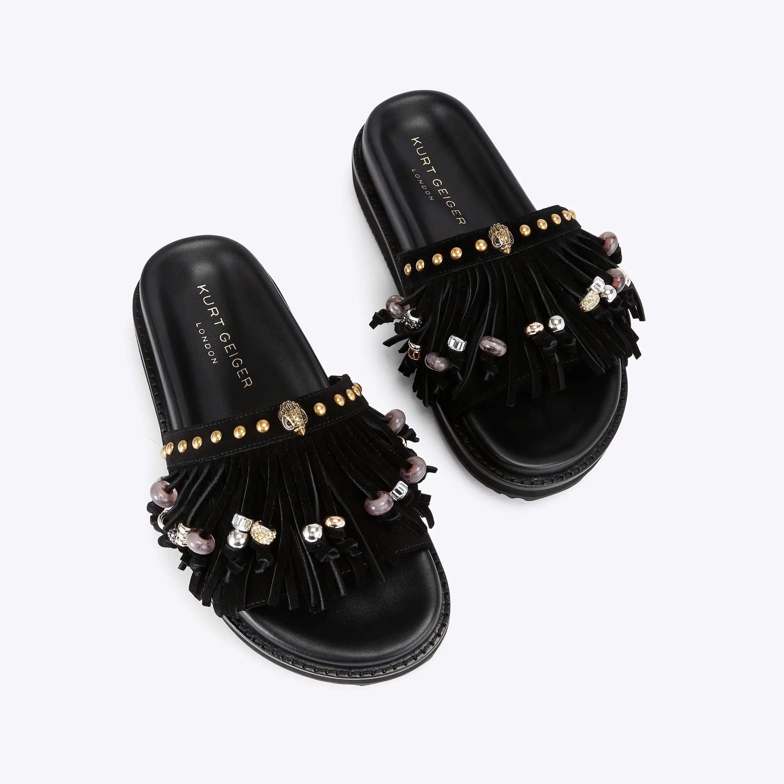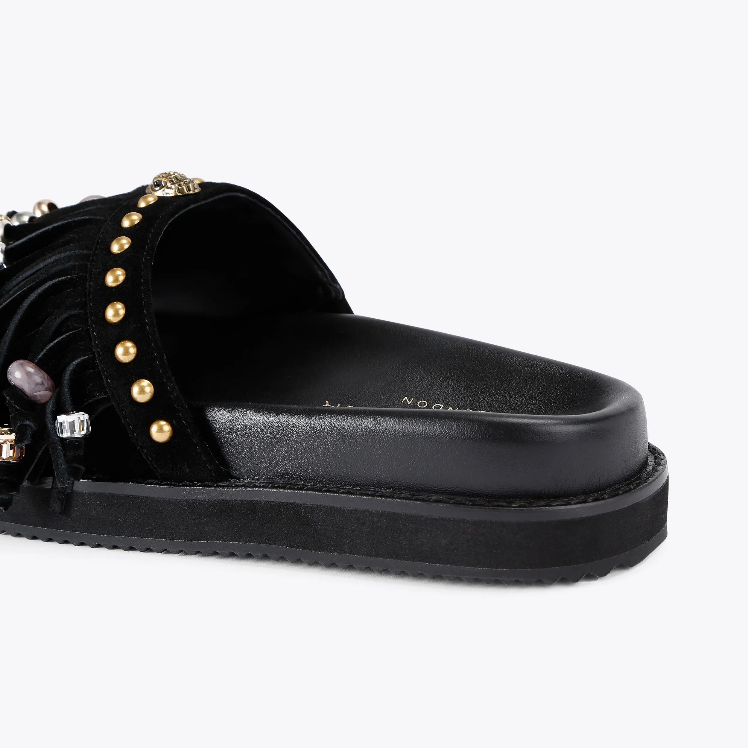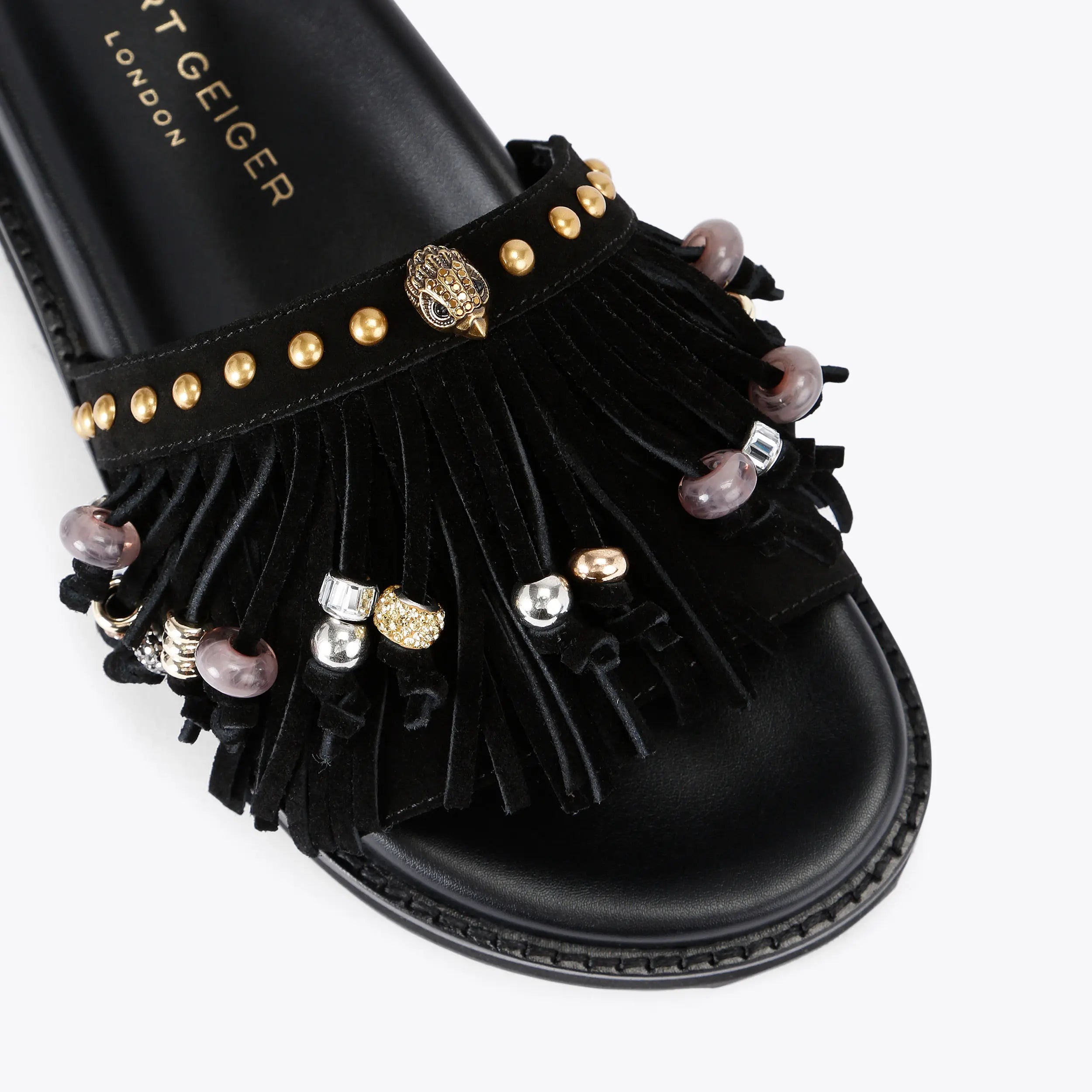 The Kensington Fringe sandal is crafted from a black suede leather. There is a fringe detail across the toe strap which are embellished with crystal and resin crystals.