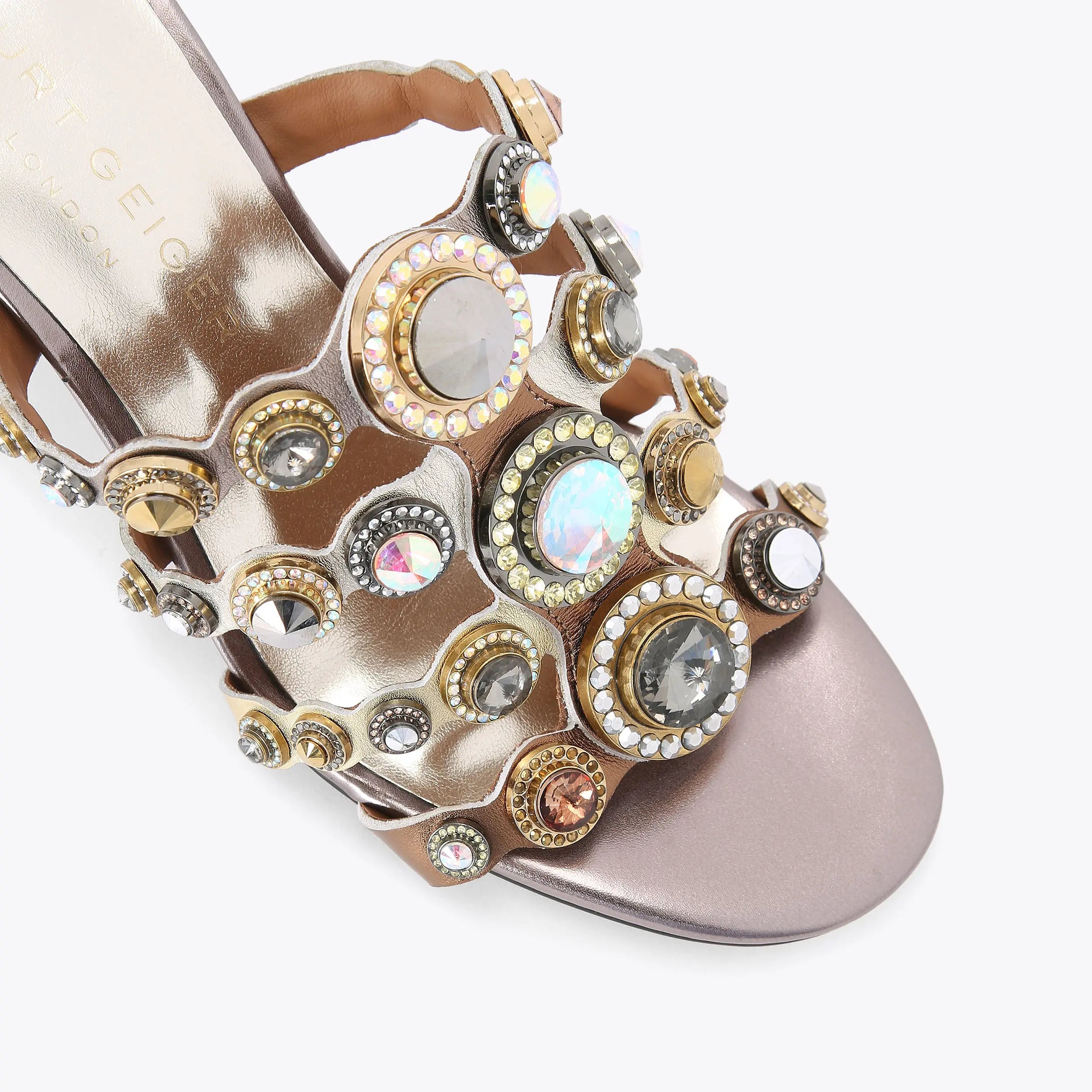 This Octavia Strap Mule heel is crafted from a gunmetal leather which is embellished with iridescent crystals across the upper straps.